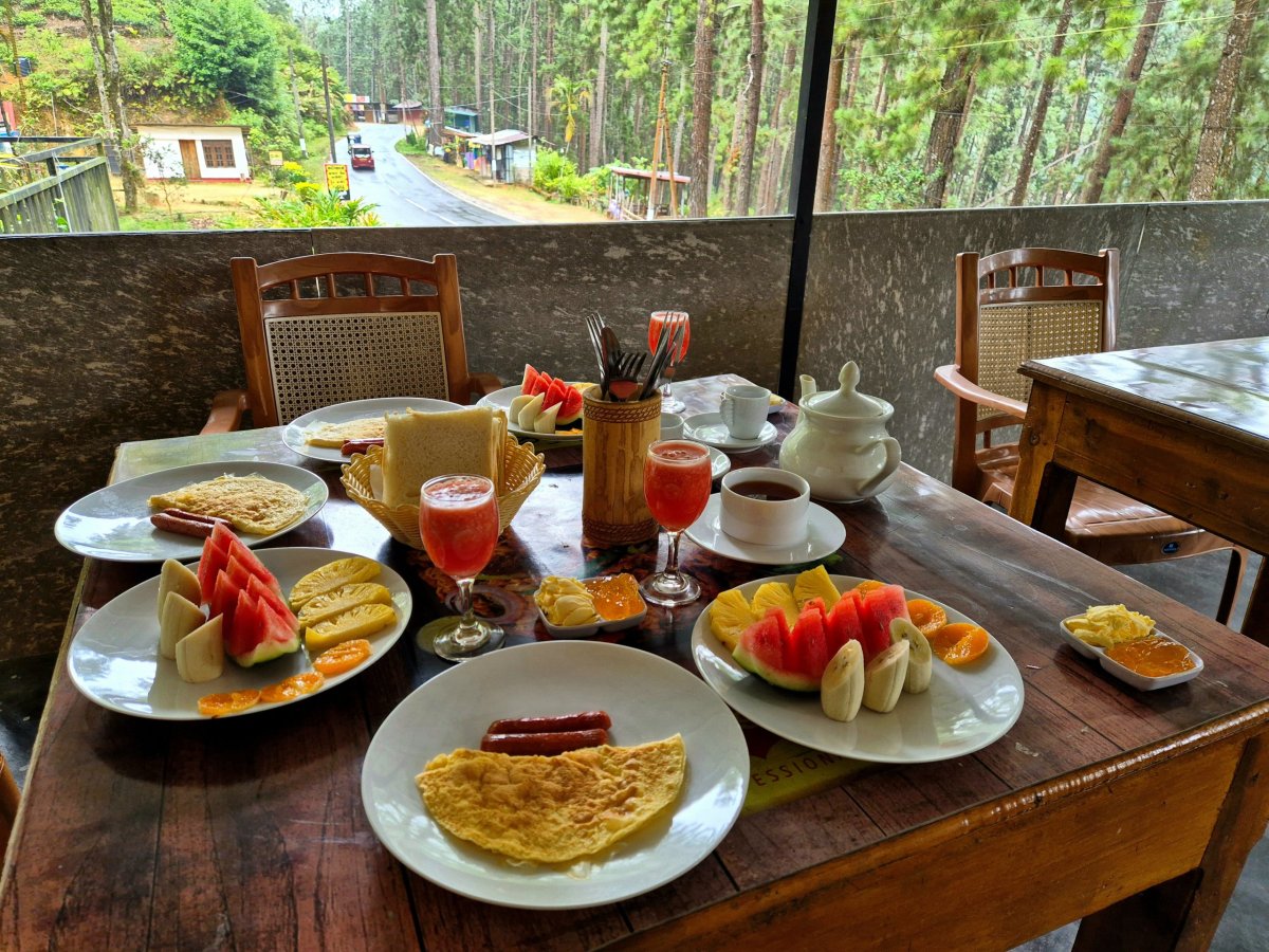 Na pokoji jsme se osprchovali a pořádně prohlídli. Žádnou další pijavici jsme už naštěstí nenašli. Zato oblečení od krve a bahna už nutně potřebovalo vyprat. U báječné a vydatné snídaně s nádherným výhledem do údolí jsme sledovali opičí rodinku, která dole v údolí skákala ze stromu na strom a užívala si krásný den. Požádali jsme paní majitelku, jestli by nám nemohli vyprat oblečení a dali jsme jí skoro všechno, co jsme s sebou měli. Vůbec to pro ni nebyl problém. Fleky od krve jí ani nepřekvapily, hned věděla, že to byly „leeches“.