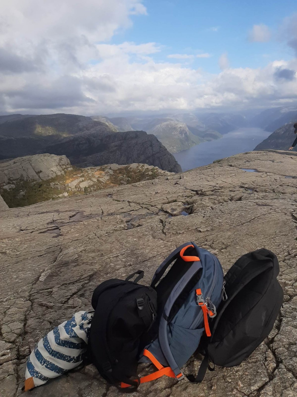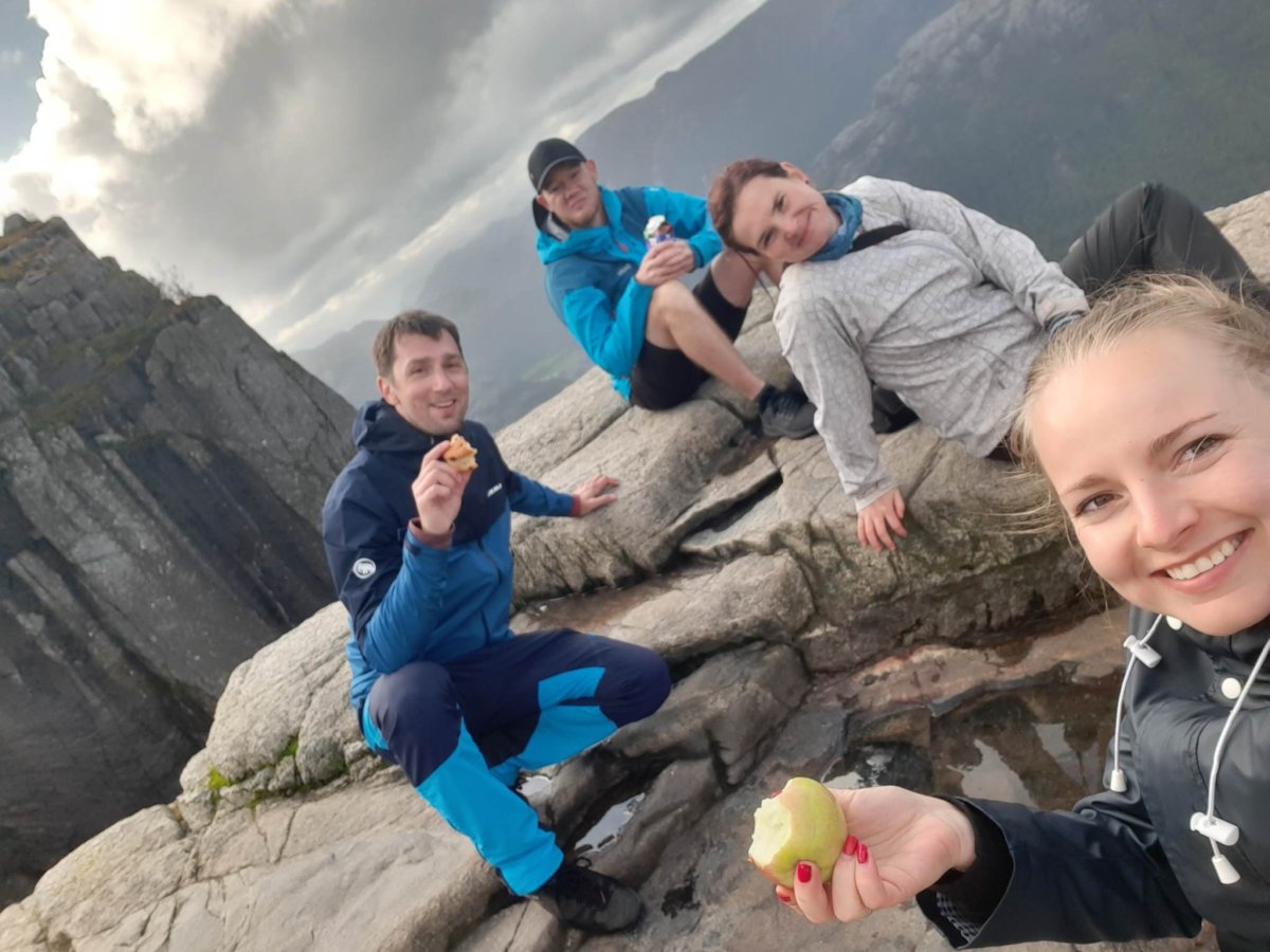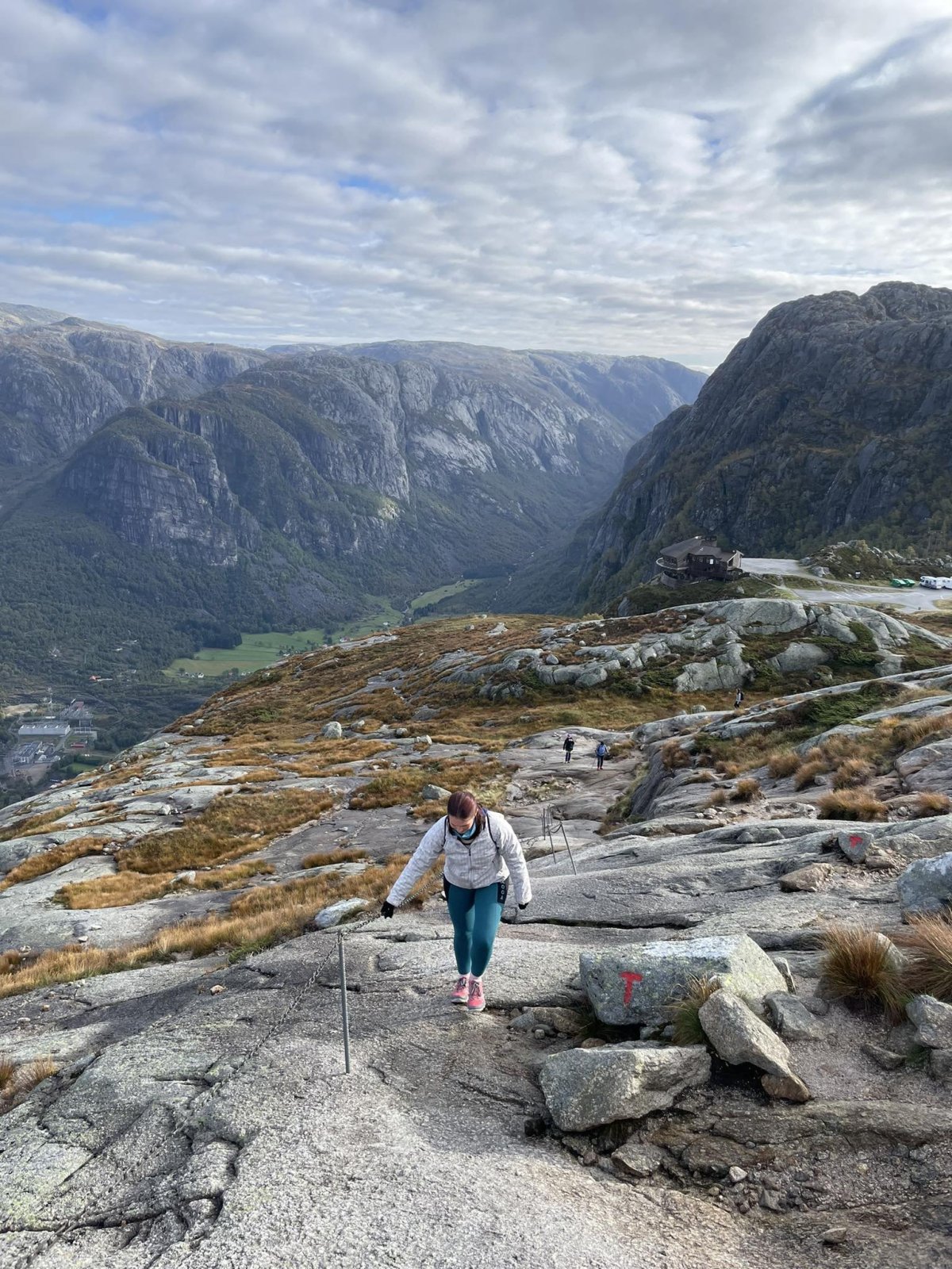 A už razíme za hlavní atrakcí dnešního dne - Preikestolen (v překladu kazatelna) je obrovský kvádrovitý skalní blok vysunutý ze svislé skalní stěny a tyčící se 604 metrů nad modrou hladinou Lysefjordu neboli Pulpit Rock. Čas výstupu na vrchol se pohybuje okolo 2–2,5 hodiny. Trasa není náročná, pouze s několika strmějšími stoupáními.