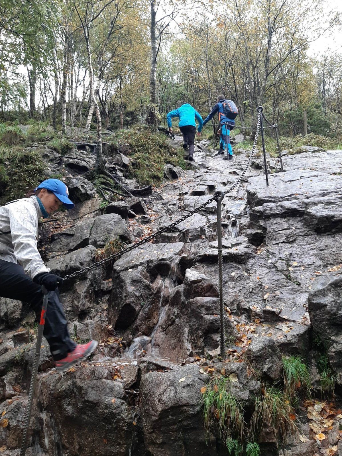 Hned na parkovišti nám doporučují koupit si rukavice, za 10 EUR si koupím velké černé (jediné co mají) a nelituji. Cesta je dobře značená, a kde je to strmé, jsou použity řetězy, které zebou do rukou. Jdeme celkem v tempu, nechceme, aby nám autobus poté ujel. Zbytečně. Trasa fakt není náročná a ani netrvá tak dlouho, jak všude psali. Párkrát sestoupáme dolů a zase nahoru, konec je skoro po hřebenu s krásnými výhledy do okolí. Na místě jsme za hodinu a 58 minut.