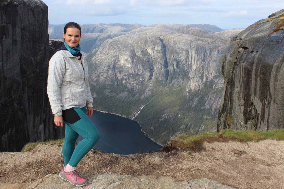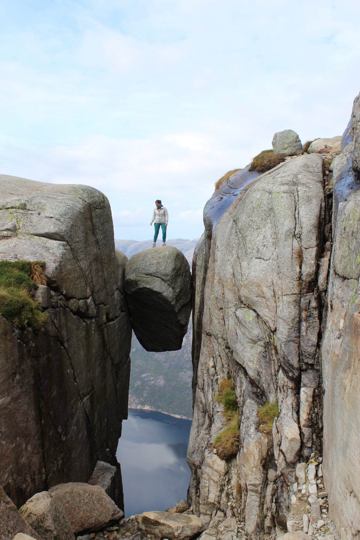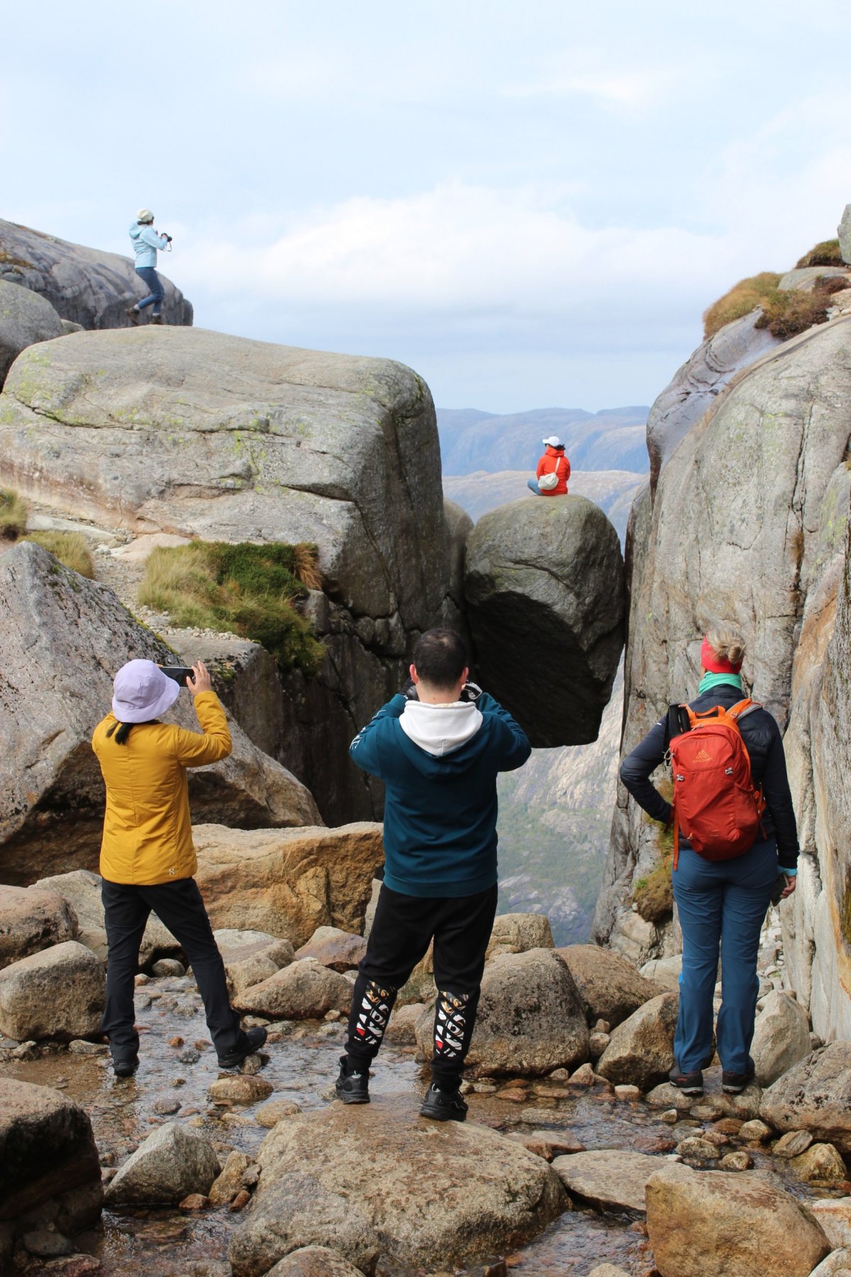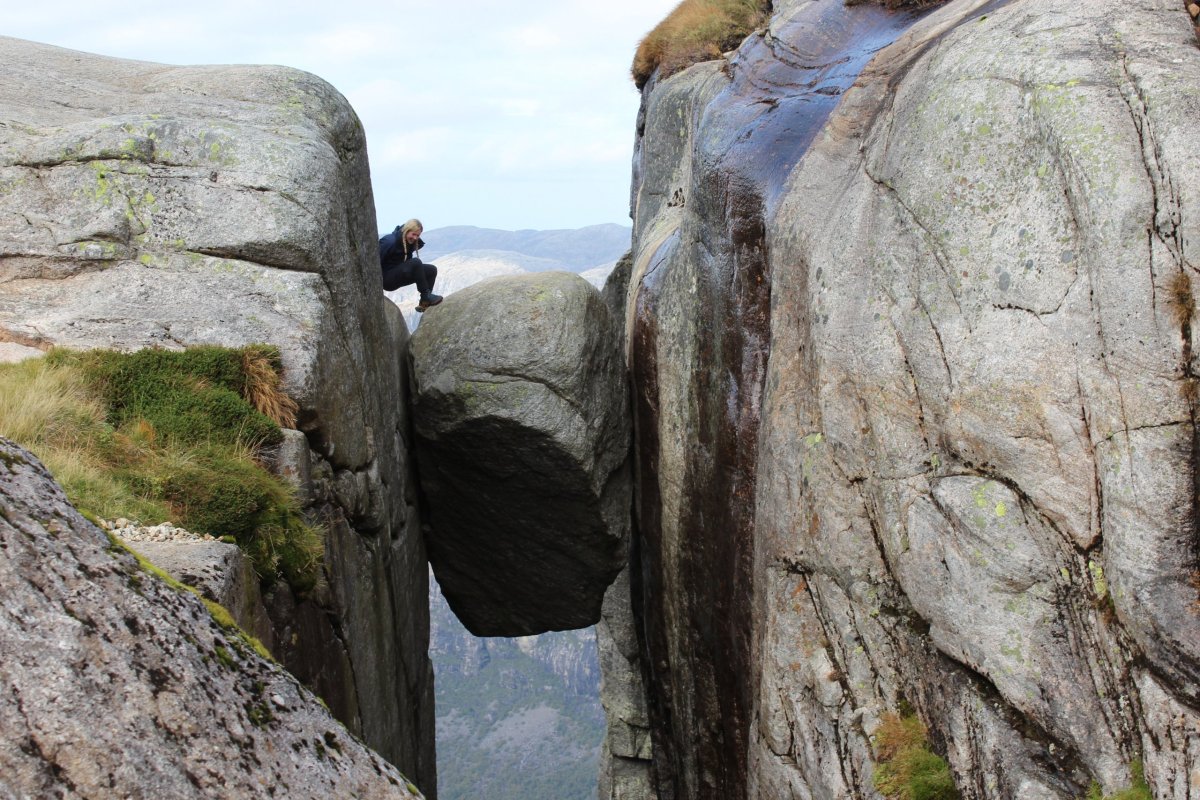 Přírodní úkaz zvaný Kjeragbolten (v překladu klín Kjeragu). Nachází se na severní straně výstupu a jedná se o velký balvan zaklíněný mezi 2 skalní stěny ve výšce téměř 1.000 m n. m. Můžete na něj vylézt. Pro turisty se jedná o jedno z nejatraktivnějších míst k focení, nejvíce známá fotografie z Norska. Ale pozor, cesta na kámen není snadná a musíme udělat dlouhý krok nebo poskočit, což vzhledem k tomu, že máte pod sebou kilometrovou propast vám nervy trochu podrásá. Dle goooglu tam ještě nikdo nezemřel, i když se mi tomu skoro nechce věřit. Několik úmrtí tam prý je při basejumperu. Každopádně překonám strach, vylezu tam, Tonda mi udělá pár fotek a dle dohody mě pak má ještě vyfotit na mobil, ale to už se mi trochu začínají klepat kolena, a tak se radši stahuji. Podruhé už na kámen nejdu, nebudu pokoušet štěstí. Koukáme po okolí a fotím výhledy. Sakra, už bych se konečně měla naučit tu zrcadlovku pořádně nastavovat. Mimochodem dole protéká 25. nejvyšší vodopád na světě – Kjeragfossen. A potkáváme skupinu asi 9 padesátiletých Čechů, kteří sem dojeli dodávkou a cestují po Norsku a spí ve stanech. Celkem veselá partička.