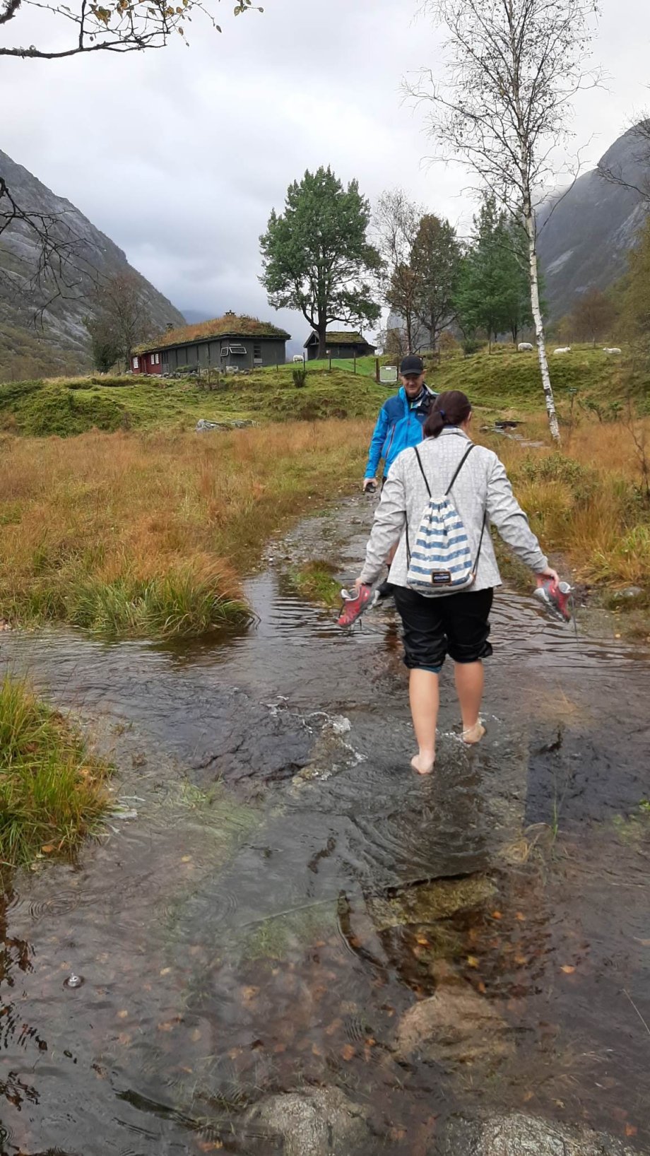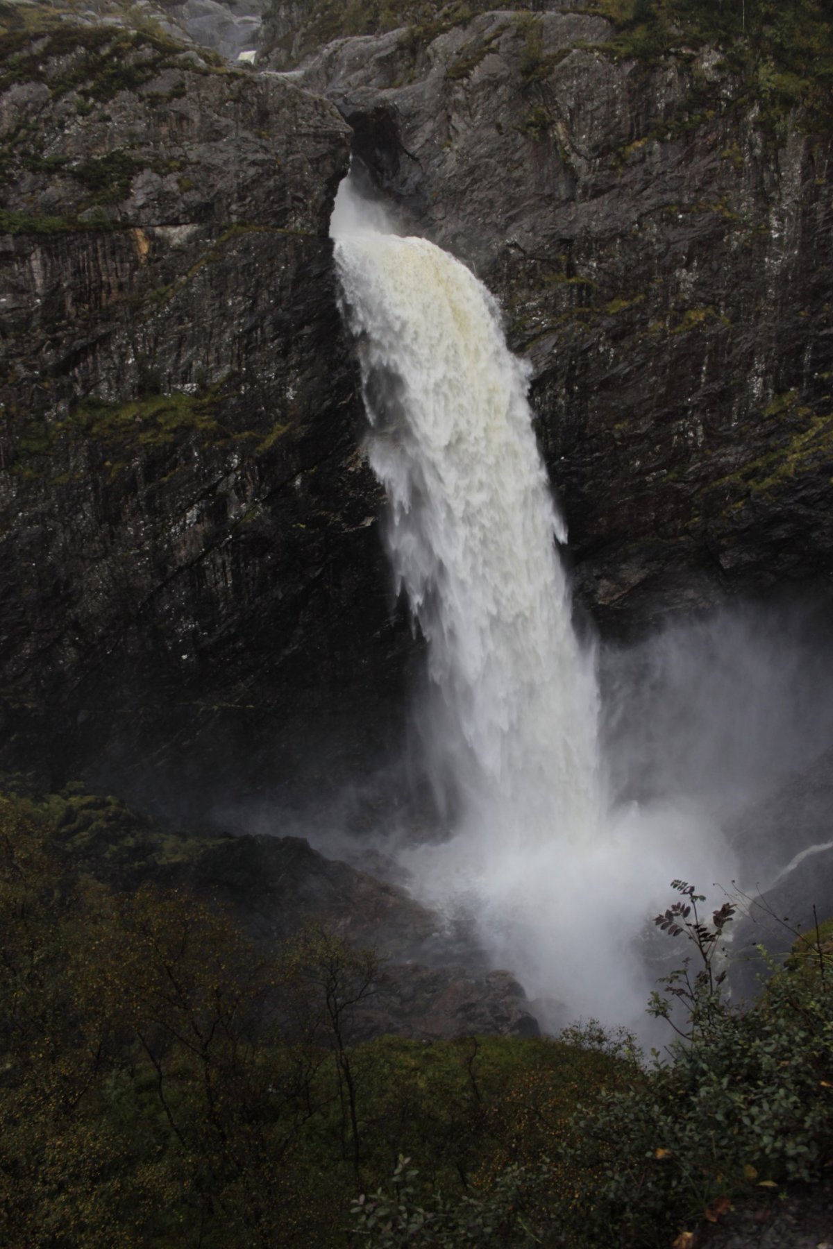 Jako první razíme k vodopádu Manafossen, který je 9. nejvyšší v zemi a padá z výšky 92 metrů. Dojedeme tam zhruba za hodinu a půl, zaplatíme parkovné a vydáme se k vodopádu, část se jde do kopce, kde je to příliš prudké, jsou použity řetězy. Vzhledem k tomu, že večer opravdu lilo jak z konve (chudáci chlapi z Čech ve stanu), je vodopád krásně mohutný. Domluvíme se, že se projdeme ještě k chatě, cesta je rozmáčená a občas jsou i potoky vody. Marek nemá nepromokavé boty, a tak je po chvíli durch. Já si u posledního potůčku boty zouvám a přejdu ho bosky s botam v ruce. Voda je trochu ledová, ale dá se to. Je to super místo, klid, hory, vodopády, ovce a krásné zázemí v podobě dřevěné chaloupky. Cestou zpět potkáme školní výpravu, která tam asi míří.