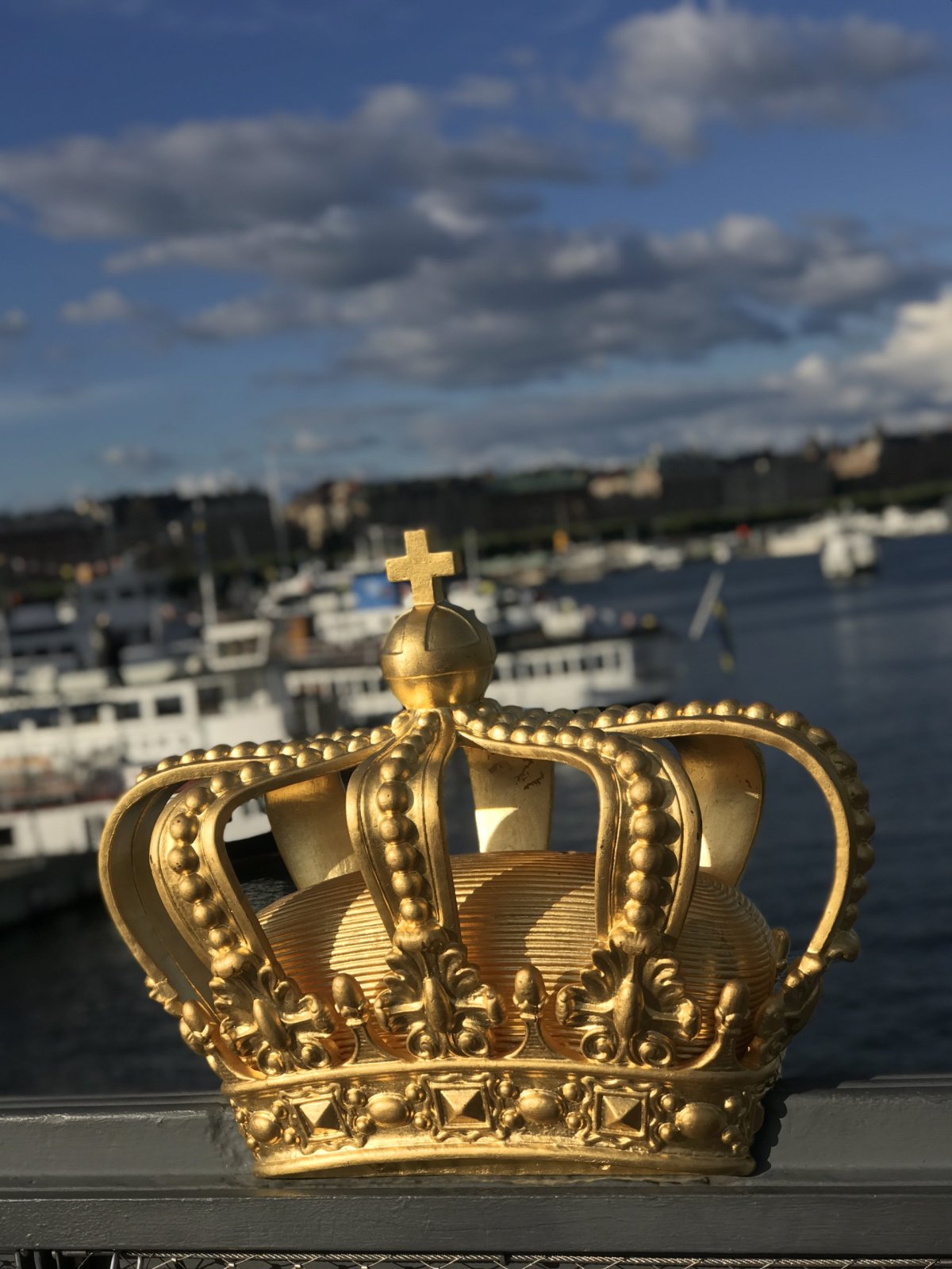 Zpátky jsme dorazily opět do přístavu Strömkajen, hned vedle přístavu je most, který vede do Skeppsholmen, na mostě uprostřed je z každé strany velká zlatá korunka. Tento pohled můžete znát také z fotografií Stockholmu.