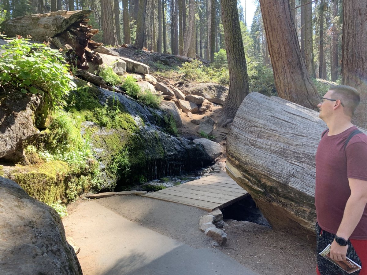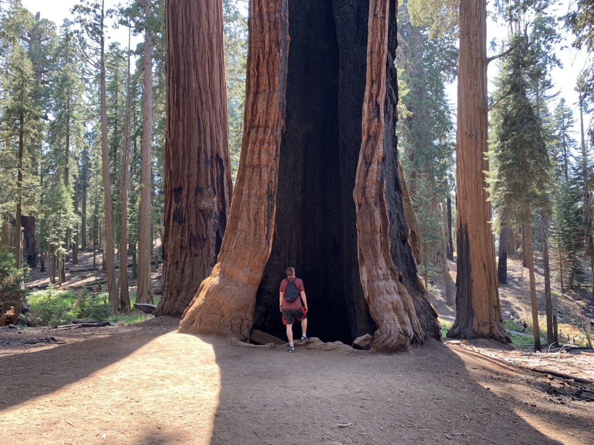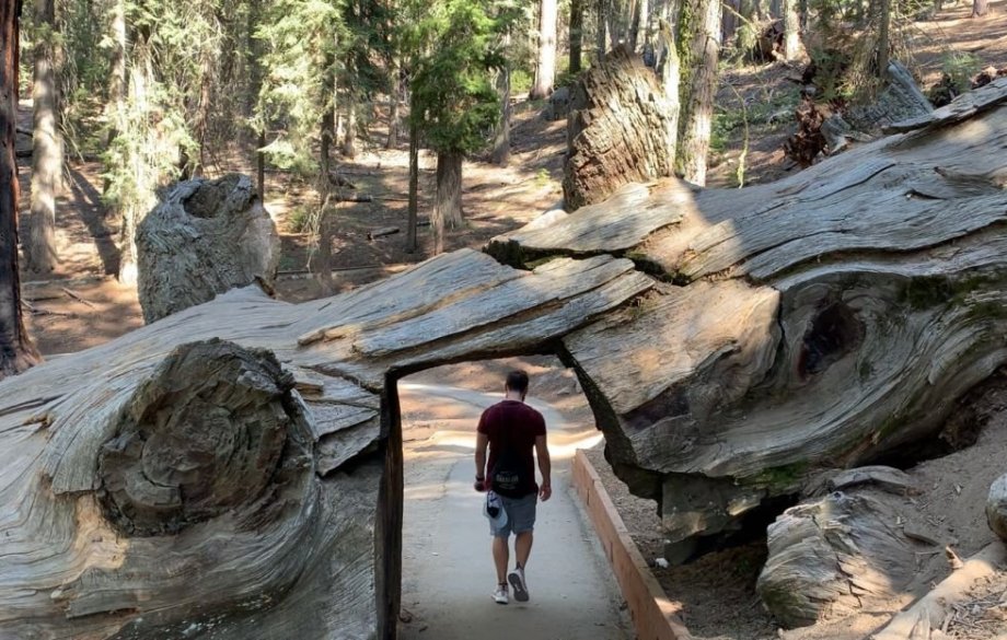 Zajímavý kromě medvědů bylo to, že všude po parku jezdí zadarmo kyvadlově autobusy, takže i tlustí a tělesně postižení si přijdou na svý. Takhle nás ( s klasickým davem influncerů a jejich frontou na selfíčko) dovezly až k největšímu žijícímu organismu na světě - stromu generála Shermana, kterej je vysokej jak dva Titaniky na sobě. Fronta se stojí i v nablejskanejch sporťácích na jedný ze silnic, která vede pod spadlým stromem přes cestu, ve kterým je vydlabanej průjezd. Příjemným kontrastem k tomu byla 1) osamocená babička v klobouku, která před každou sekvojí (jsou pojmenovaný po důležitých postavách zamerický historie) zastavila a četla si o ní v knížce, a 2) liduprázdný cesty hned několik kiláků od zastávek autobusu, kde už jsme byli úplně sami a užívali si po pěti dnech v LA to boží ticho. Akorát jsme teda úplně uprostřed ničeho narazili na pár Čechů, bývalých ČVUŤáků, kteří zrovna byli na cestě po celých státech. A tak jsem už podruhý na druhým konci planety potkal Čechy uprostřed lesa (poprvý to bylo v Krasnoyarsku). V každý prdeli na ňákýho narazíš, jak mi tehdy jeden z nich řekl.