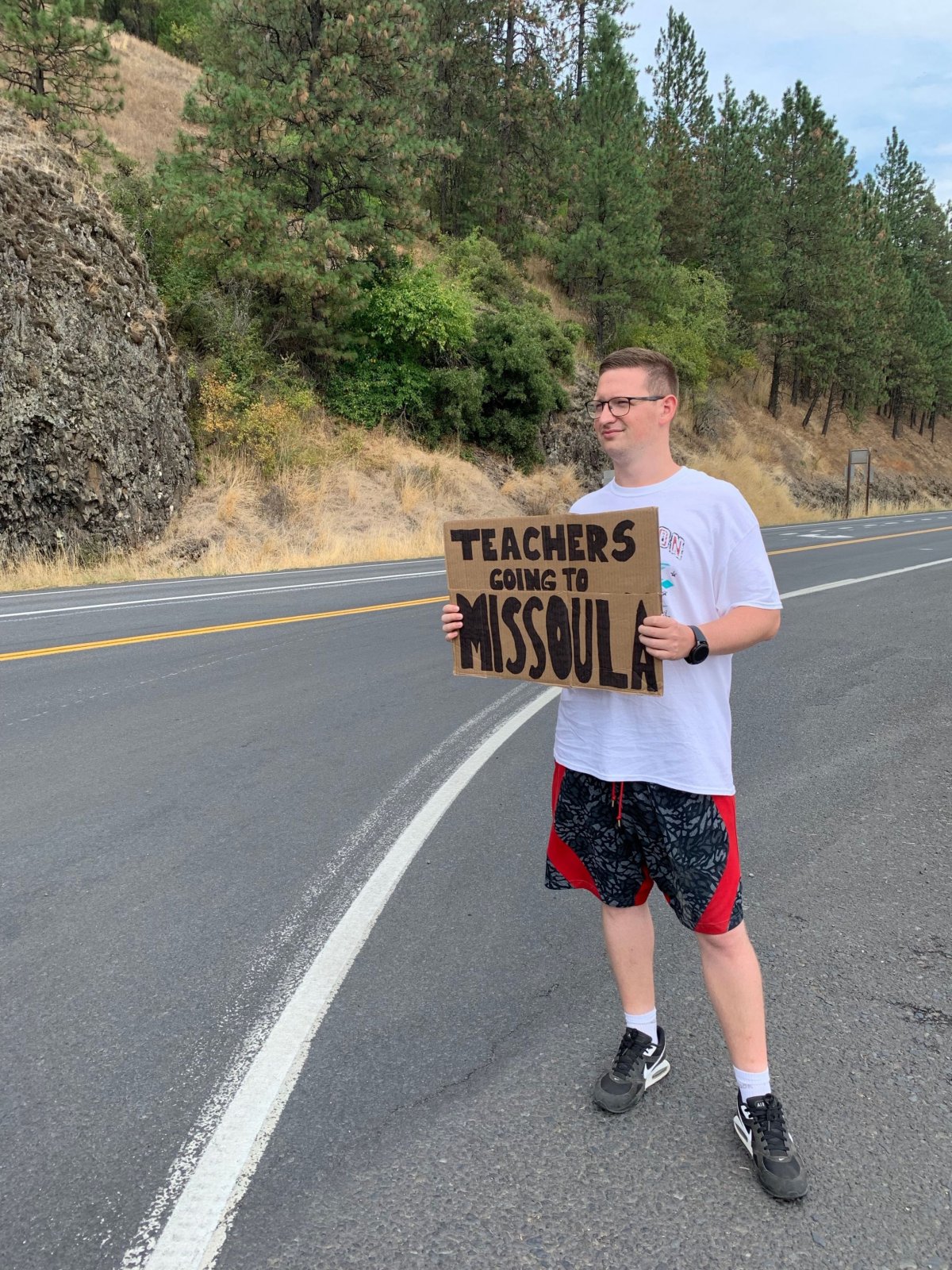 Ráno jsme vstali brzo a Angel nás hodila na benzínku za městem, kde jsme se rozloučili a zvedli palec. A auto nám zastavilo fakt rekordně rychle. Akorát bylo policejní. Vylezli z něj dva mladý kluci, zapsali si naše pasy a oznámili nám, ať si najdeme autobus, protože jinak by nám museli dát 300 dolarů pokutu, nebo nás rovnou hodit na 90 dní do jailu. Tak jsme chvíli přemejšleli, že s krosnama půjdeme pěšky dvě hodiny za řeku do Washingtonu, protože tam stopování narodil od Idaho ilegální není. Měl to bejt takovej malej útěk jak do Mexika. Nejdřív jsem se ale rozhodl zkusit pár lidí na parkovišti jakoby přeptat na cestu a nasměrovat je rozhovorem k tomu, aby nás vzali. Kvůli konzervativní povaze tohohle místa bylo jasný, že v Idaho lidi neradi zastaví jen tak někomu u cesty, a navíc jsme nemohli riskovat, že nás znovu chytí policajti, kteří pak čas od času projeli kolem a asi kontrolovali, jestli jsme je poslechli.