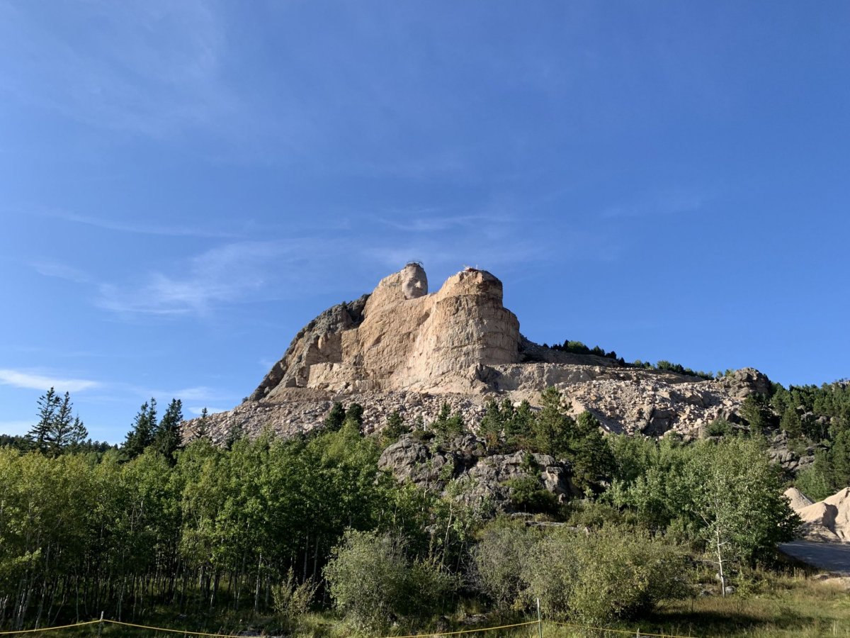 Pak jsme zase zvedli palec a do dvou minut nám zastavil další mladej pár, tentokrát z New Jersey. Prej dva roky šetřili, aby na tuhle cestu mohli, a teď jezdí už několik měsíců po USA v karavanu, ve kterým bydlej. Sehnali ho hrozně levně a moc hezky a šikovně si ho vypiplali. Tenhle sympatickej párek nás vzal až k památníku Crazy Horse. To byl ten indiánskej náčelník, kterej u Little Bighornu porazil tu bandu bělochů. Jeho památník taky není dokončenej - v tuhle chvíli je zněj hotovej jen obličej a ukazováček. On ani hotovej dost možná ani nikdy nebude, i když Indiáni tomu samozřejmě věřej. Podle našeho průvodce prej socha bude komplet tak do třiceti let, a v tu chvíli to bude největší socha ve skále na světě. Je to tak trochu natruc vůči USA, protože Black Hills bejvalo pro Indiány posvátný místo, načež připlachtili běloši a vytesali si uprostřed toho všeho do skály obličeje lidí, kteří je odsud vyhnali. Takže si teď stavěj vlastní, mnohem monumentálnější sochu, ale protože jsou tak strašně chudý, jde to jen velmi pomalu. Zajímavý je, že ačkoli americká vláda Indiánům nabídla jako odškodný několik milionů dolarů, oni to odmítli, protože „Black Hills nejsou na prodej“ a prostě nevidí důvod, proč by se o svůj les měli dělit. Je určitě obdivuhodný, nakolik si stojí za svým právoplatným dědictvím, na druhou stranu by se těch pár milionů o kousek vedle v Pineridge mohlo hodit.