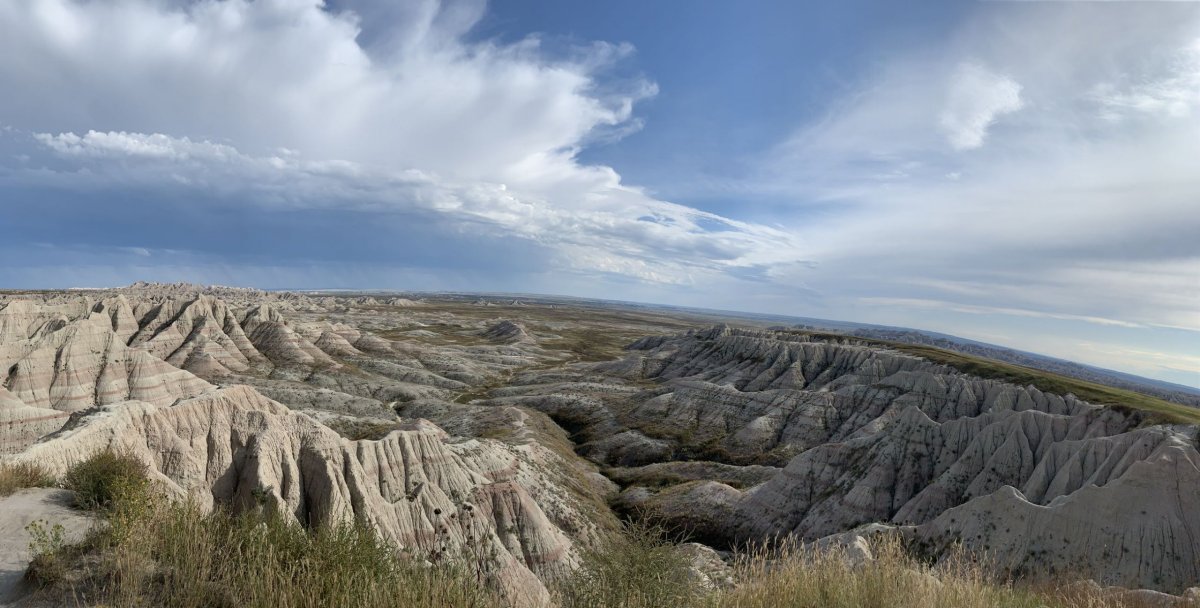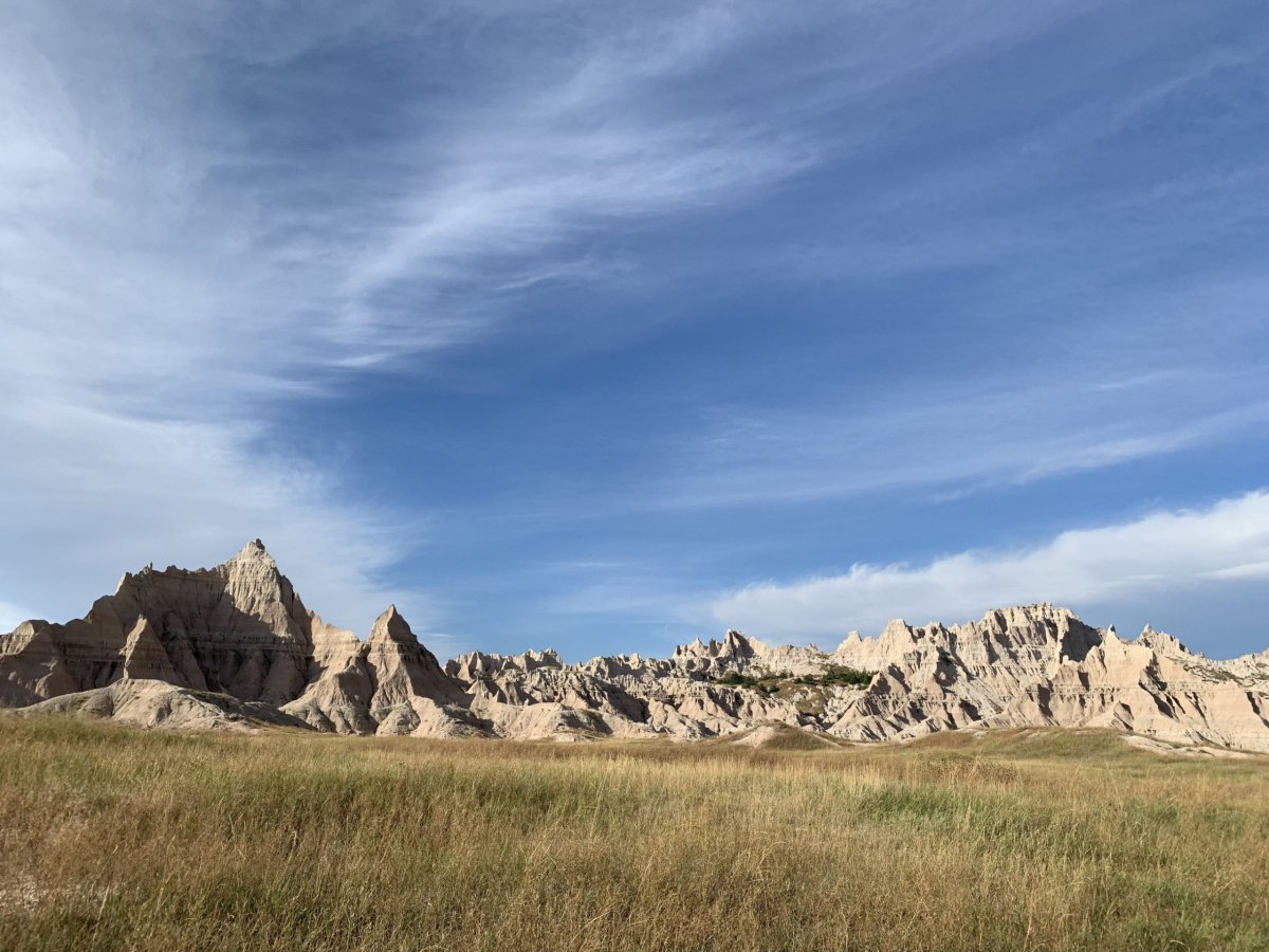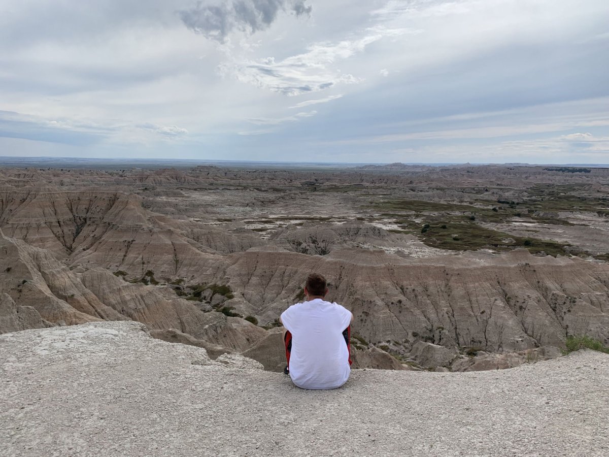 Než se s náma rozloučila, Michelle nás popovezla za město, klasicky doprostřed ničeho, tak jsme byli zaseklí na šíleně špatným místě u dálnice, a přijde mi, že jen díky mýmu neskonalýmu optimismu nám po docela dlouhým čekání zastavila jedna paní s dítětem. Měli jsme docela ambiciózní plán, že se s nekým podíváme až do národního parku Badlands, kde jsou krásný několikabarevný skály, který dostali Indiáni (za trest, protože kvůli těm skalám je to naprosto neúrodná lokalita). Pak je ale vyšoupli i odtamtud, když zjistili, že to je vlastně hrozně turisticky lukrativní místo a tím i Badlands mají ekonomickej potenciál. Ty výhledy byly fakt neskutečný.