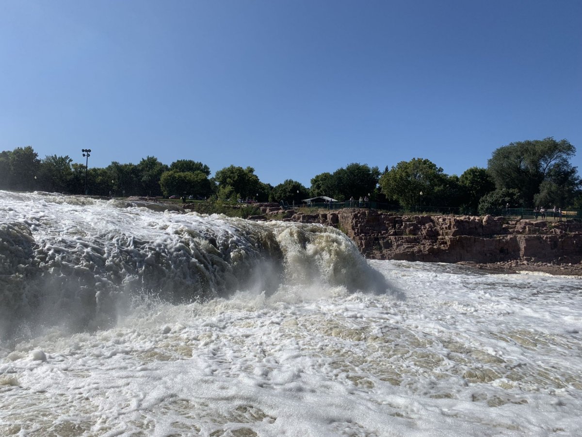 Hned ve městě proběhlo další zajímavý setkání. Seděli jsme u vodopádů a koukali na rozvodněnou řeku (jen týden před naším příjezdem v Sioux Falls poprvý po několika stoletích řádily tornáda), když k nám přisel pán o holi a s mrožím knírem a ptal se, odkud jsme. Měl hroznou radost, že jsme se přijeli podívat zrovna k nim, a vyprávěl nám o tom, že se mu před několika lety stala nějaká ošklivá nehoda s krkem, takže musel několik měsíců ležet a nemohl pracovat. V tu chvíli se na něj manželka vykašlala, vzala děti a odstěhovala se někam do Texasu. Prej ho to dodneška hrozně trápí a snaží se stím naučit žít. Přijel se sem projít s kamarádem, kterej stál kousek opodál a koukal na vodopád. Že ten prej má rakovinu, tak se chtěli spolu rozloučit. A pak nám dal i přes naše zuřivý odmítání dvacetidolarovku, že mu to nějak řekl jeho vnitřní hlas, kterej on vždycky poslouchá. Tu dvacku jsme si s Tomášem rozpůlili a každej svůj kousek máme schovanej.