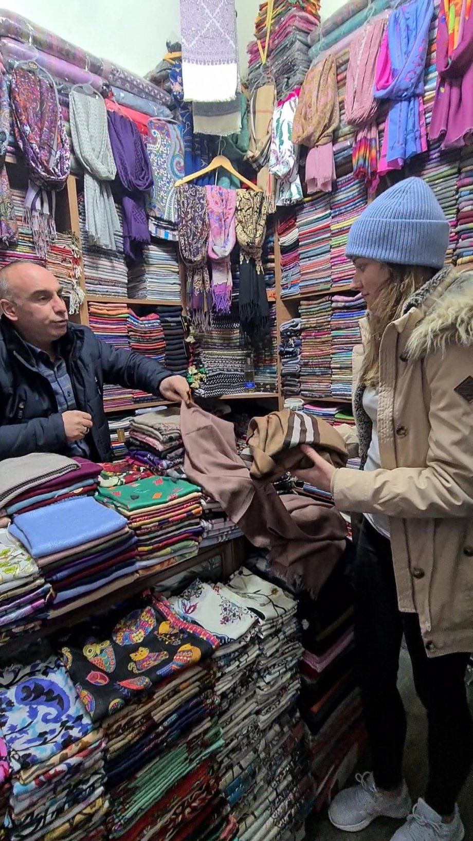 Jako první navštěvujeme stánek s kebabem za příjemných 7 TRY. Dalším úkolem je sehnat šátek přes vlasy, aby Káťa nemusela nosit ten mírně odpudiví vyrobený z „rouškoviny“ koupený v Istanbulu z automatu. Lezeme do malého kumbálku, kde nám prodavač ukazuje, co nabízí a kolik to stojí, záhy přijde jeho anglicky mluvící kamarád. Nic se nám nesnaží prodat a jen se s námi vybavuje o tom, jak se máme odkud jsme a tak dále. Asi si chtěl procvičit angličtinu. To ještě nevíme, že si pána docela oblíbíme. Milý Turek nám navrhuje, že nám ukáže město, dá ochutnat čaj a kávu, a že bychom se zašli podívat do jeho obchůdku s koberci, zda-li by se nám nějaký nezalíbil. Příležitosti využíváme, ačkoliv náš zájem o koberce je nulový. Část našeho rozhovoru mám na svém Instagramu, můžete ho omrknout. Bavíme se o válce, která region sužovala před 5 lety, jeho rakovině, ale i o počasí a rodině.