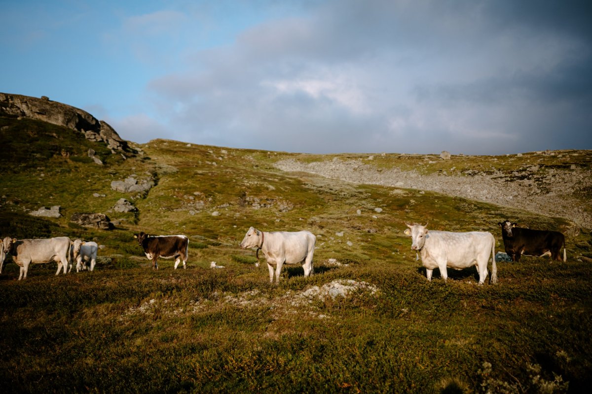 Po dlouhatánské cestě se KONEČNĚ dostáváme do středu Norska, kde nemáme žádný konkrétní plán. Naši první zastávku jsme si vyhlídli po cestě a byl jí NP Hardangervidda. Na toto místo dojíždíme déle, než bylo v plánu, neboť cestovat po Norsku není zrovna nejrychlejší záležitostí. Náš příjezd v podvečerních hodinách nás ale neodradil od plánované túry, která byla dlouhá přibližně 15 km. Přijíždíme k parku ze strany od řeky Veig. K parkovišti, kde trek začíná vedou šílené serpentíny. Procházíme naprosto okouzlující norskou přírodou a já si na každém kroku říkám, tak kde jsou ty soby?! Moje malé přání je totiž v Norsku vidět : soby, losy, pižmoně. Jediné, na co jsme po cestě ale narazili, byly krávy. Na první pohled mírumilovné stvoření, na pohled druhý nekamarádsky tvářící se bytosti, které změnily jejich přátelský postoj v postoj "já jsem pán této krajiny." Jedinou výmluvou, proč by nás neměly bežet zadupat bylo to, že polovina naší skupiny jsou vegetariáni, tudíž by to mělo být v suchu :D Nakonec jsme se zvýšeným hlasem přešly okolo nich bez úhony. Nezapomenu na to, jak jsme se co metr ještě otáčeli, zda ten býček stále stojí tak napružený a připravený se po nás rozběhnout. :D