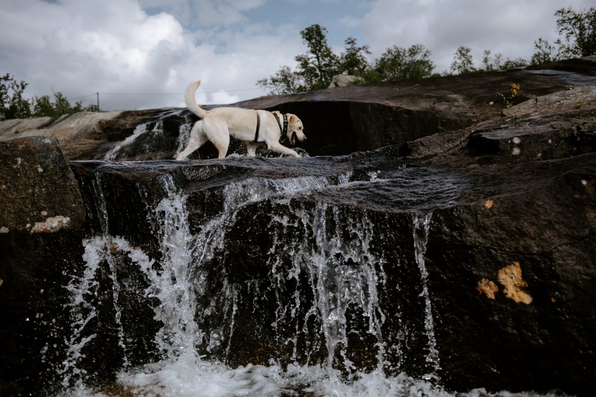 Ráno se vydáváme na vodopád ve městečku Laerdal, který je značen u modré turistické cesty. Zádrhel byl v tom, že k němu cesta nevedla a ani z ní nebyl vidět, a tak jsme se museli brodit lesem a vyšlapat si k němu vlastní cestu. Chlapci se i vykoupali.