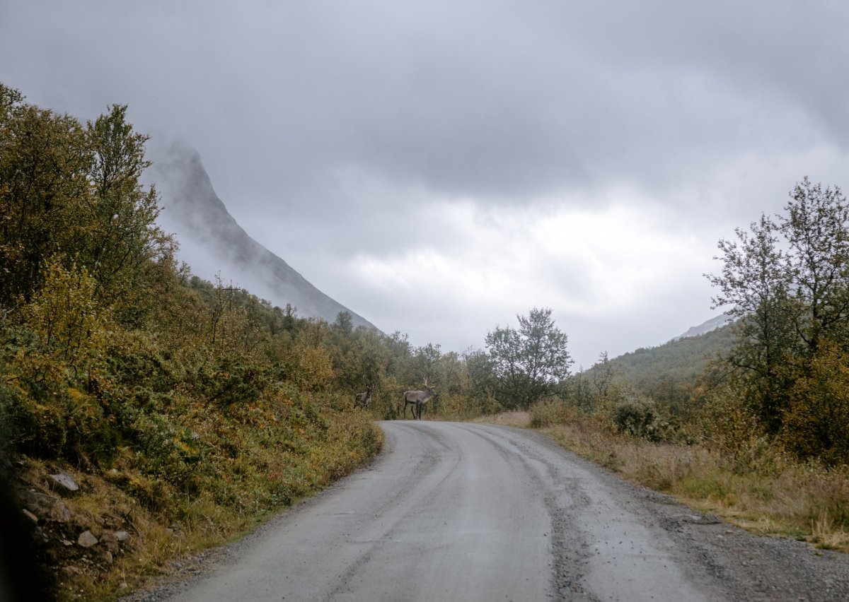 Túru musíme vynechat protože prší a prší a jsme všichni až do poledne zalezlí ve stanech. Nechceme den úplně promarnit a tak se v už mírnějším dešti vydáváme přesto do Spiterstulen, osady, odkud jsme měli vycházet. Cesta se klikatí po udusané cestě nahoru a dělá se mi trošku nevolno. Najednou od mé spolujezdkyně zazní "hele hele hele" což probudilo asi celou klimbající posádku. V zatáčce na nás koukají 3 soby. Jsem celá nadšením bez sebe a rychle vytahuju foťák. Než jsem ale nasadila správný objektiv, sobíci se nesměle vytratili z cesty a zmizeli v houští. Pár cvaků jsem ale stihla.