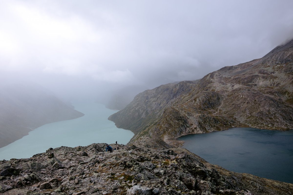 Tento den se ráno tolik neloudáme, přivstaneme si a okolo 9 vyrážíme na trasu. Hřeben Besseggen se táhne pohořím Jotunheimen mezi jezery Gjende a Bessvatnet. Z vršku lze zahlédnout obě jezera současně a pozorovat, jak jsou jinak zbarvená. Jejich hladina se nachází v rozdílné nadmořské výšce. Je několik variant, jak tuto trasu jít. My si vybrali osmi hodinovou variantu o délce 17 km. Trek začíná pro nás na parkovišti, kde jsme nechali auto, ale je možné dojet o něco blíže k Gjendesheimu, kde je parkoviště. Část trasy vede podél jezera Gjende, kde cesta po několika kilometrech odbočuje do prudkého srázu skrze šutry. Tato trasa je sice vyznačená na mapách.cz ale člověk si tak trochu musí hledat vhodnou cestičku, po které jít. Dali jsme si znamení "bachabacha" kdyby náhodou někdo nohou shodil šutr ze suťového pole. Tento stoupáček vzdušnou čarou měří pouze 900m, ale člověk ho jde rychlím tempem přes hodinu. Byli jsme ale vděční, že jsme si tuto trasu vybrali směrem nahoru.