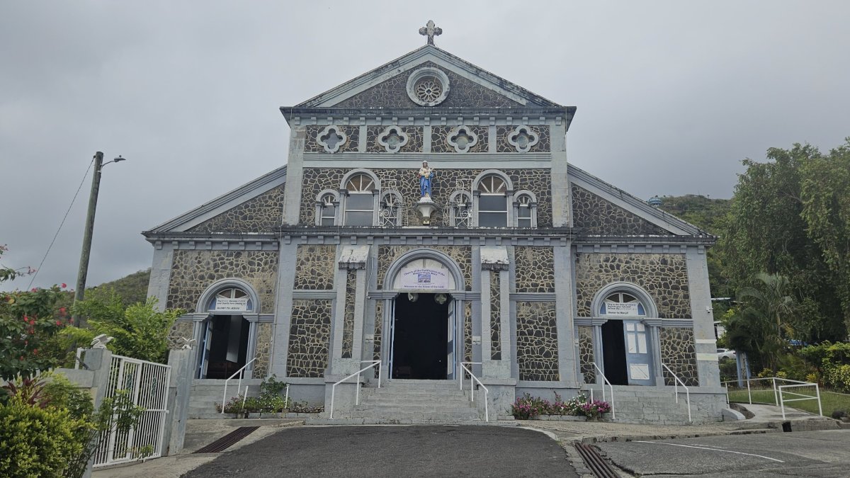 Proto se jedeme projet dál po východním pobřeží ostrova, kde nás zarazí velký stadion, dokonce s olympijskými symboly. My pokračujeme po páteřní okružní ostrovní komunikaci dál, až do vesnice Micoud. Zajíždíme až k moři a zjišťujeme, že zde není vůbec nic zajímavého, jen si kousek zajdeme a vyfotíme kostel. Když jedeme zpátky, zastavujeme se u toho velkého stadionu, který, jak pak zjišťujeme, tu na přelomu milénia postavili Číňané a ve své době to byl s kapacitou 9.000 lidí jeden z nejmodernějších stadionů v Karibiku. Nyní působí už celkem omšele a v minulých letech sloužil jako provizorní sídlo místní nemocnice, která by se měla přesunout zpět do svých původních prostor a stadion by měl být zrekonstruován.