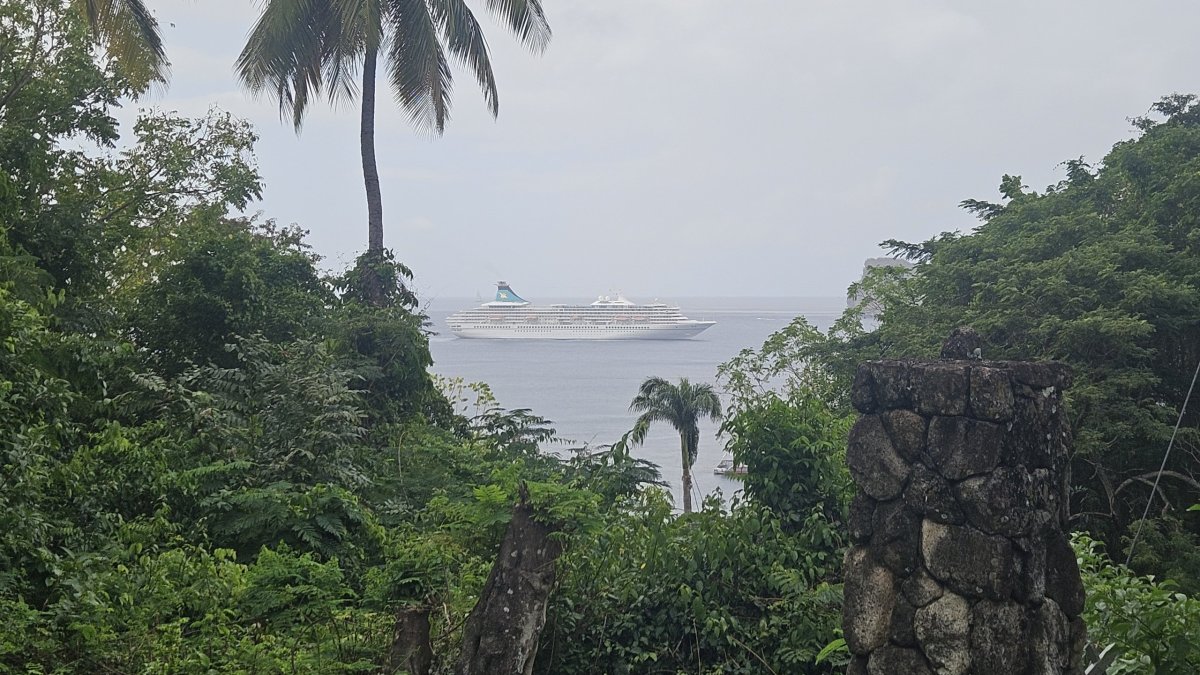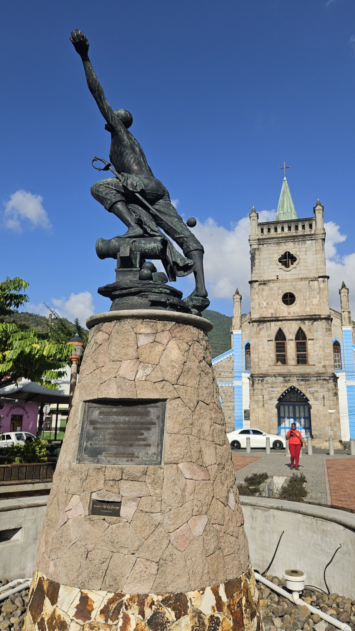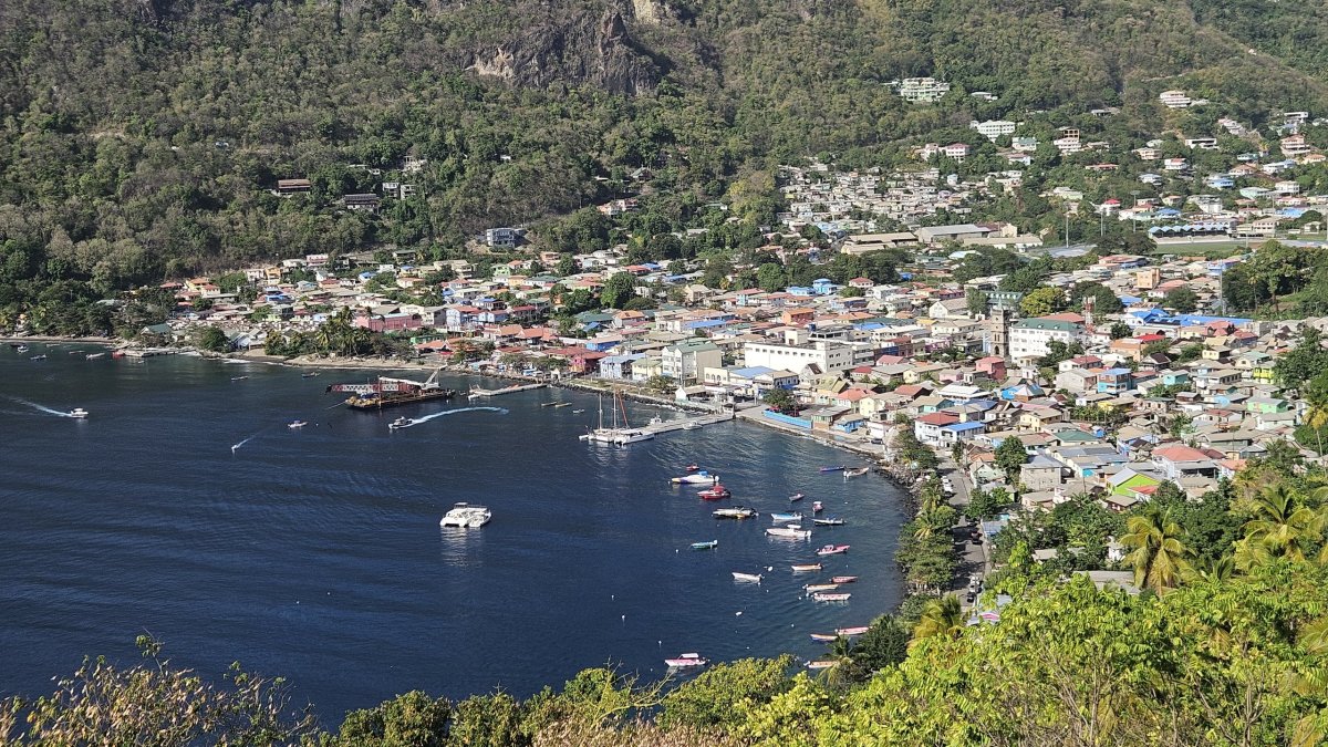 Naším dalším cílem je městečko Sourfriere. Když se vrátíme na hlavní cestu, vidíme tam v džungli, kde je občas někde nějaké stavení, stát vystrojené lidi v národních barvách, ve svátečním, s vlajkami. Co se děje? Nějaký běh nebo cyklistický závod? A kousek dál pak narážíme na kolonu aut a menší průvod, který blokuje cestu, provoz řídí policie. A na nedaleké vyhlídce se pak od místní paní dozvídáme, že jsme právě minuli průvod k oslavě nezávislosti ostrova na Velké Británii (22. února 1979), kdy tento průvod postupně prochází kolem celého ostrova.