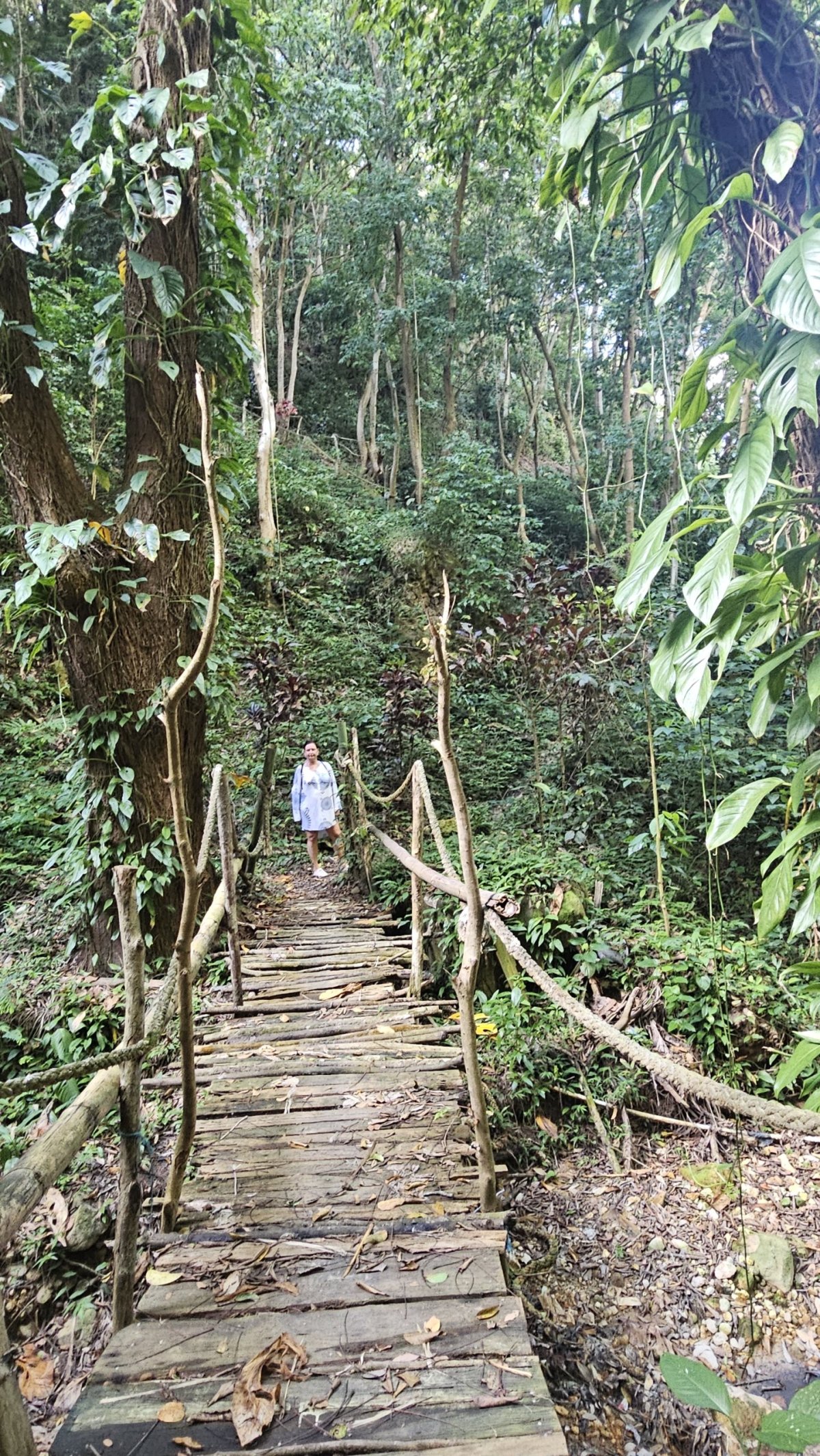 Po odjezdu od sirných pramenů zastavujeme u křižovatky s hlavní cestou, kde je poutač a směrovka na Safírový vodopád. My se k němu zkoušíme vydat. Cesta vede nejprve po lesní cestě, která se po pár stech metrech mění v turistický udržovaný chodník, který velmi prudce klesá dolů k potoku, kolem něhož ještě asi 5 minut pokračujeme k vodopádu, Cestou zpět vidíme i druhý vodopád, trošku schovaný, který není ani na mapách. Následuje náročný výstup parnou džunglí zpět nahoru, který nám dává pěkně zabrat.