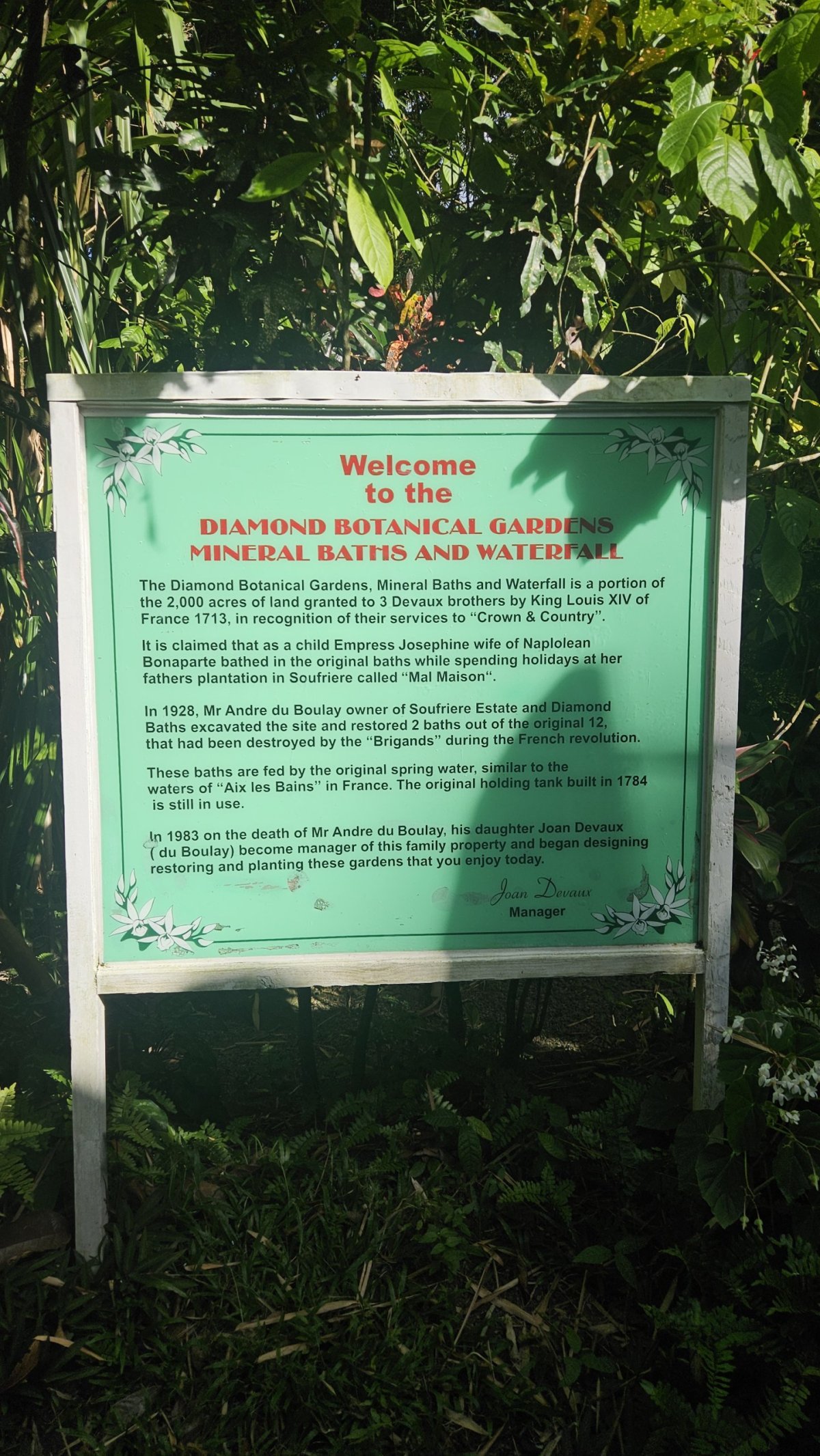 Další naší zastávkou je botanická zahrada a minerální koupele Diamond Falls na okraji Soufriere, vstupné je 17,50 XCD na osobu (133 Kč). My zde přijíždíme právě včas, abychom to vše stihli obejít, neboť otevírací doba je pouze do 16.00. Botanická zahrada leží okolo potoka, který vytéká ze sirných pramenů a nabízí také tyto koupele, ale v době naší návštěvy byly bazénky v procesu čištění a údržby. Největším lákadlem zahrady, kterou stojí za to navštívit, je Diamantový vodopád, který své jméno dostal dle do mnoha barev od minerálů zabarvené skály. Jinak je to oáza klidu se spoustou krásné barevně kvetoucí tropické flóry.