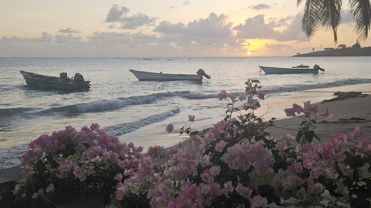 Poté se již v pozdním odpoledni přesunujeme na koupačku na pláž do Soufriere. Je pondělí, takže proti neděli je tu jen zlomek lidí. S blížící se tmou sedáme do auta a přes kopce se vracíme zpět na ubytování, kde můžeme konečně poprvé vidět i západ slunce do moře, dnes je první den a večer bez mraků.