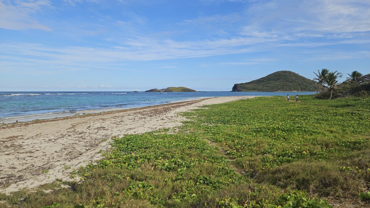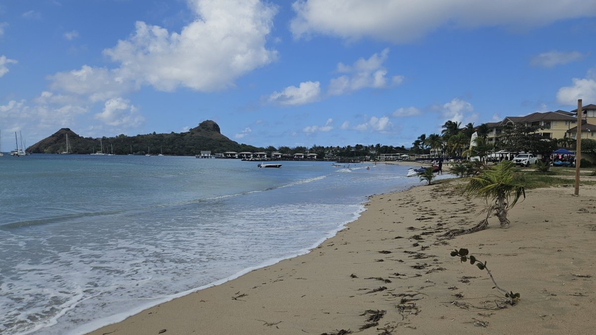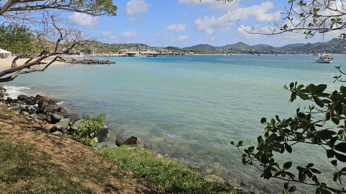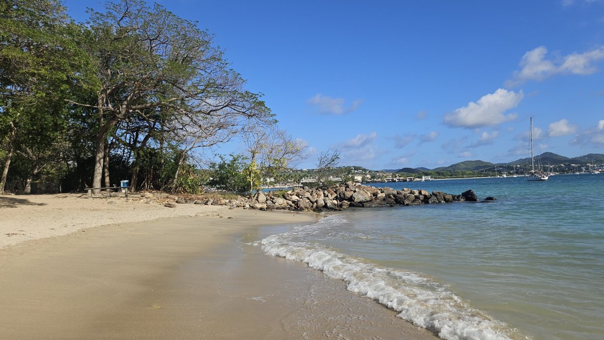 Naším cílem je Gros Islet, vesnice na severním cípu ostrova. K ní se ovšem probojovat zabere ještě čas, protože posledních asi 5 kilometrů směrem od hlavního města skáčeme v pomalu jedoucí koloně, protože jediná místní páteřní silnice v této relativně hustě osídlené části ostrova, vcelku i průmyslové, se spoustou větších či menších obchodů okolo cesty, absolutně nestíhá hustý provoz. My zajíždíme přímo do centra Gros Islet a úplně naslepo parkujeme přímo u moře. A ejhle, přímo tady je menší pěkná pláž i se stínem stromů, takže se zde na pár hodin usídlíme a trávíme zde poprvé na této naší cestě typické plážové odpoledne s koupáním.