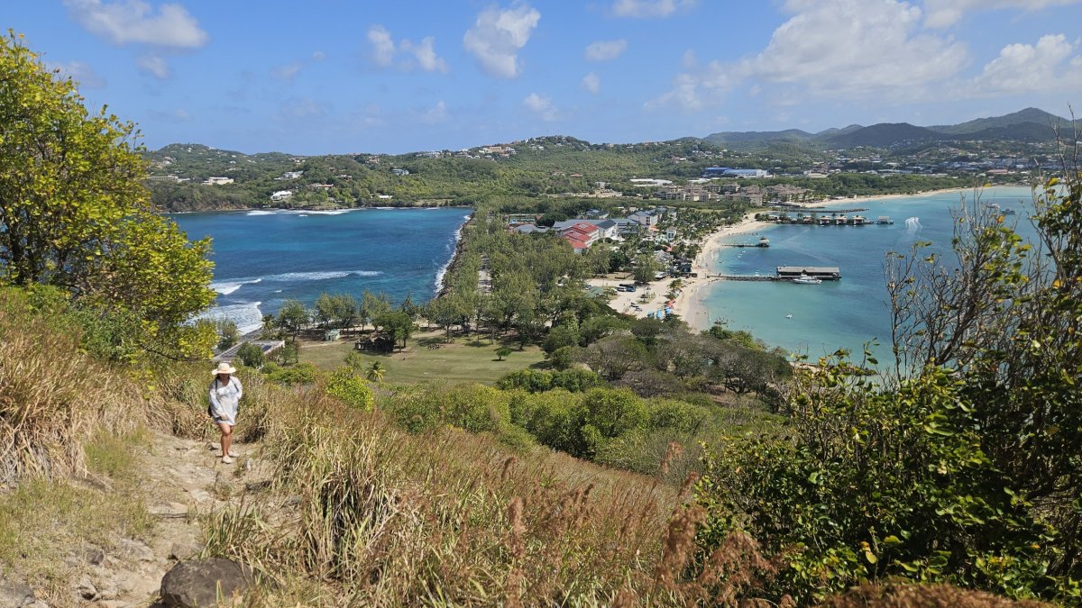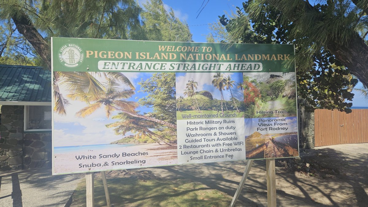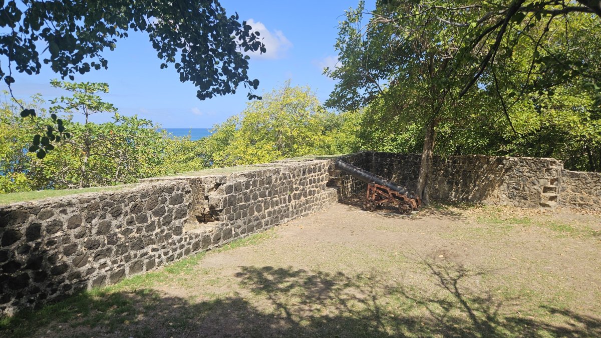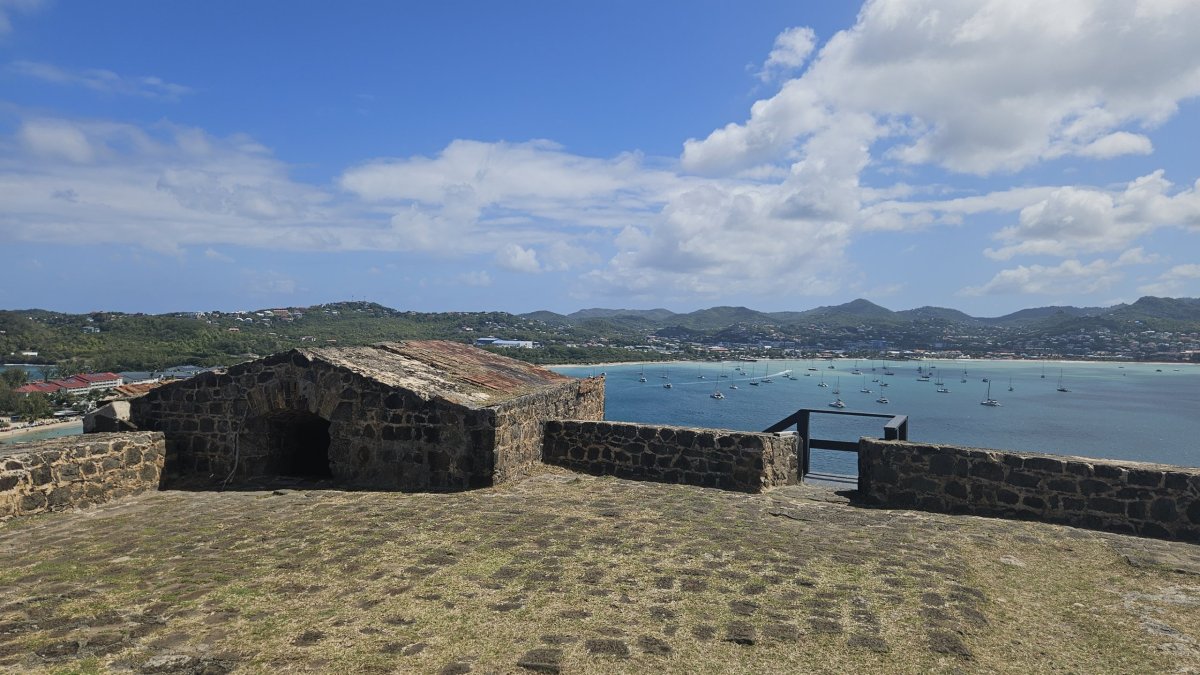 Další den vyrážíme prozkoumat asi jedinou historickou památku na ostrově – Pigeon Island. Vstupné je 27 XCD (205 Kč). Celá lokalita, malý poloostrov se dvěma vrcholy, je dnes udržovaný park, ve kterém jsou rozesety staré muniční sklady a budovy bývalé pevnosti, většinou jde o ruiny, pouze několik budou je zrestaurovaných nebo kompletních. Na samotném cípu poloostrova je na vrcholu malá pevnůstka, která až do roku 1947 sloužila jako vojenská radiostanice. Po úzkém hřebenu se pak přesunujeme k druhému vrcholu poloostrova – Signal Hill, ale na ten jinde a jindy asi nenáročný výstup v otevřeném terénu, po tmavých kamenech a pod přímým tropickým sluncem ve finále vzdáváme, vedro je dnes skutečně šílené.