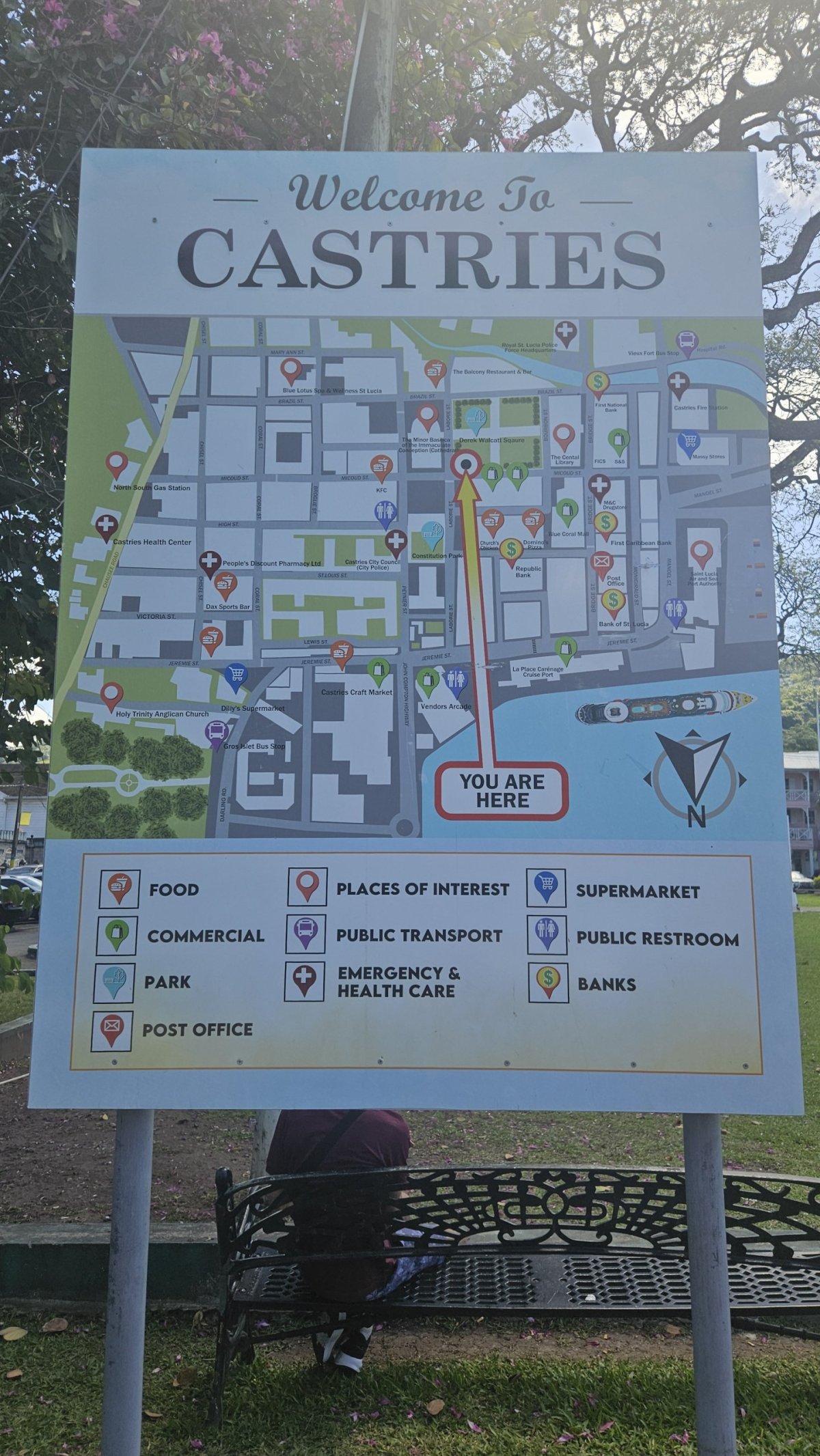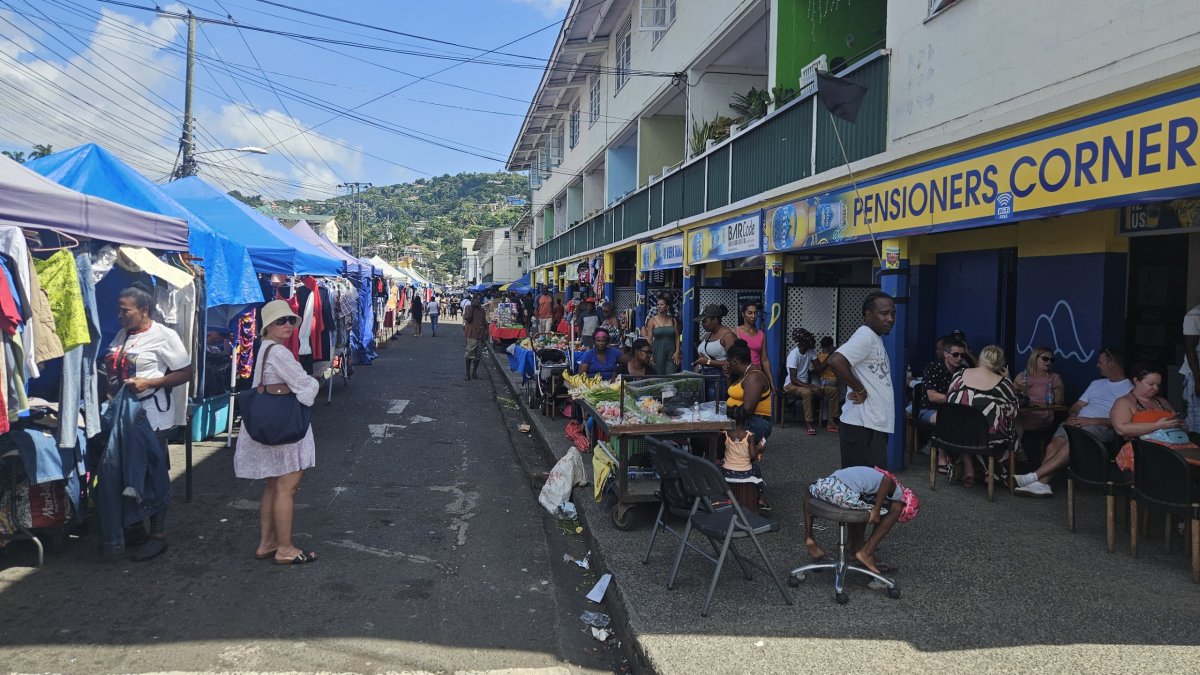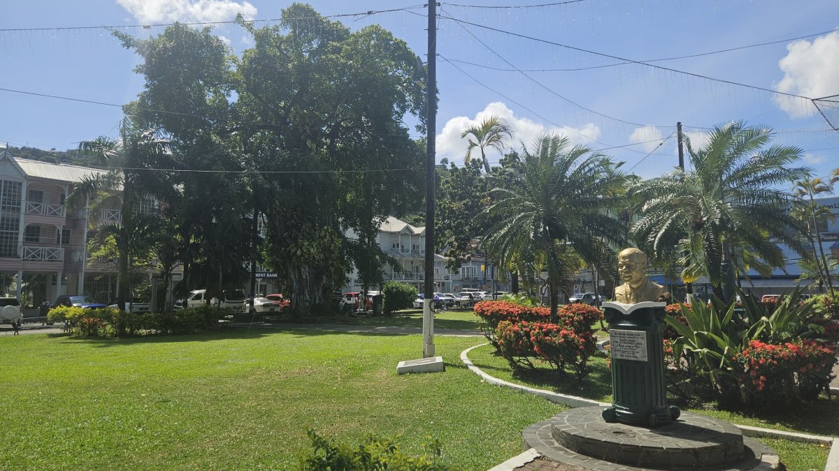 Jdeme kolem velké místní tržnice u nábřeží, trh pak pokračuje i v několika okolních ulicích. V malém parčíku míjíme sochu Johna Comptona, bývalého premiéra ostrova, který jej dovedl k nezávislosti na Velké Británii. Pokračujeme živými ulicemi plných lidí, kolem obchodňáků i historických budov na Derek Walcott Square, centrální zelené náměstí. Zde je pomník obětem obou válek a také sochy dvou (!) laureátu Nobelovy ceny, kteří se na tomto malém ostrově narodili – Dereka Walcotta (literatura) a Williama Lewise (ekonomie). Vedle náměstí stojí na místní poměry monumentální Bazilika neposkvrněného početí s nádhernými malbami na dřevěném stropu.
