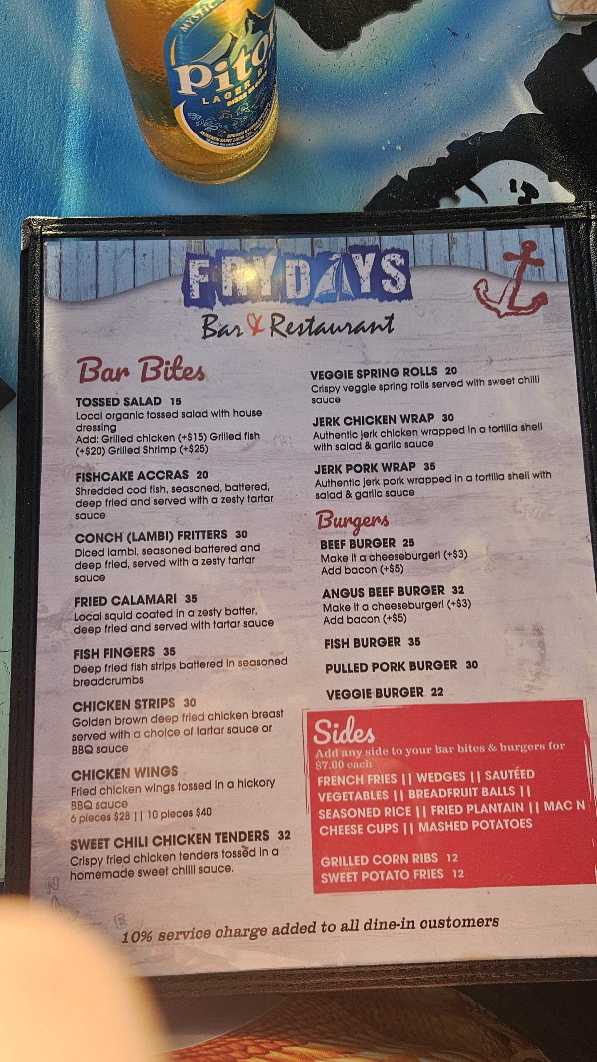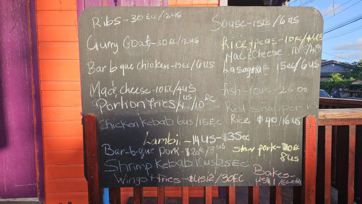 Po celou dobu jsme se večer stravovali v místních barech a restauracích, kde jsou ceny ve velmi širokém rozpětí. U místních, v nejlevnějších plážových barech, je běžné jídlo za 20-30 XCD (150-230 Kč) za porci, která se často nedá sníst, protože v ceně jsou běžně až čtyři přílohy a salát. Levnější restaurace se pohybují mezi 40-60 XCD za jídlo, (300-460 Kč), ale třeba v Rodney Bay zaplatíte v lepších restauracích i několikanásobek.