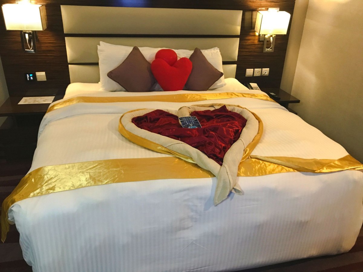 Na letišti si bereme taxi a během cca půl hodiny dorážíme na hotel. Poprvé si užíváme trochy luxusu - zavazadla nám vytahuje z taxi personál a je nám řečeno, že bude dopraven až na hotelový pokoj. Na recepci nám donáší vlhký ručník a nápoj na osvěžení a nakonec nás doprovodí do pokoje, kde na nás čeká překvapení. Během komunikace s hotelem jsme totiž zmínili, že se jedná o svatební cestu, a tak nám vyzdobili pokoj srdíčky a nachystali zdarma kousek dortu. Velmi milé překvapení hned při příjezdu :-) Vzhledem k celodennímu cestování uleháme do postele a během chvilky oba usínáme.