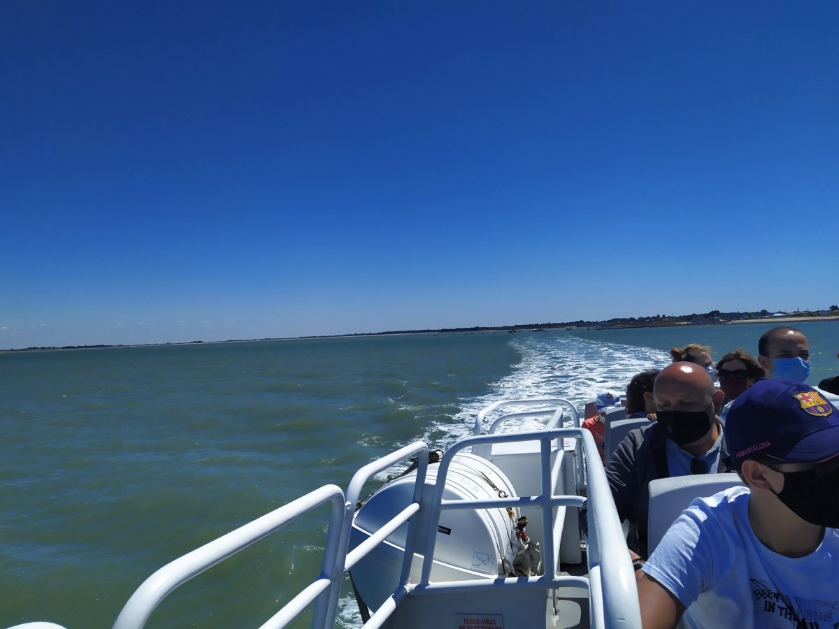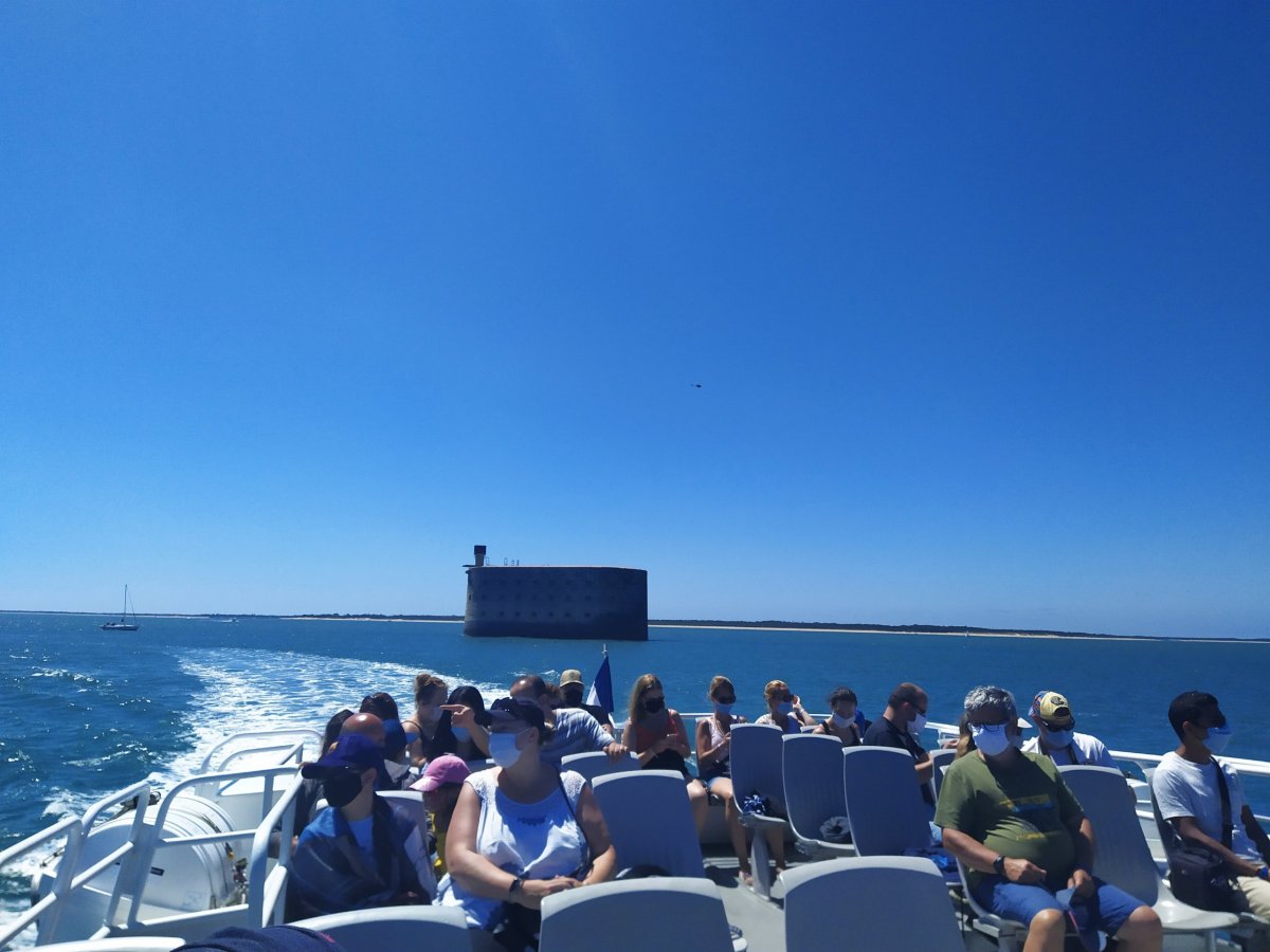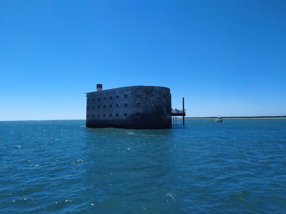 Fouras samotné je díra, kde většina lidí zaparkuje auto a čeká na výletní loď. Můžete si tu dát průměrné kafe, projít se po pláži zanesené řasami a koukat na Boyard na horizontu. Naše loď jede přesně na čas, nasazujeme roušky a vyfasujeme anglický letáček (mluvený výklad je jen ve francouzštině). Dozvíme se, že Boyard měla pomáhat s ochranou zálivu, ale její výstavba trvala tak dlouho (přes šedesát let!), že jako obranná pevnost nikdy nesloužila. V blízkosti se nachází malý ostrůvek Aix, kde nenajdete žádná auta, zato poštu, čtyři muzea a pět pláží.