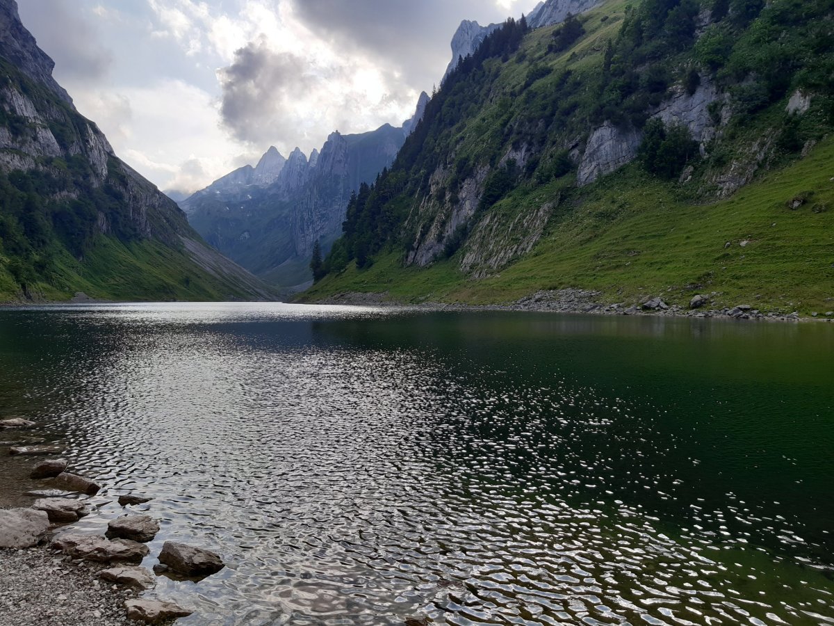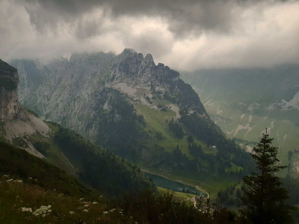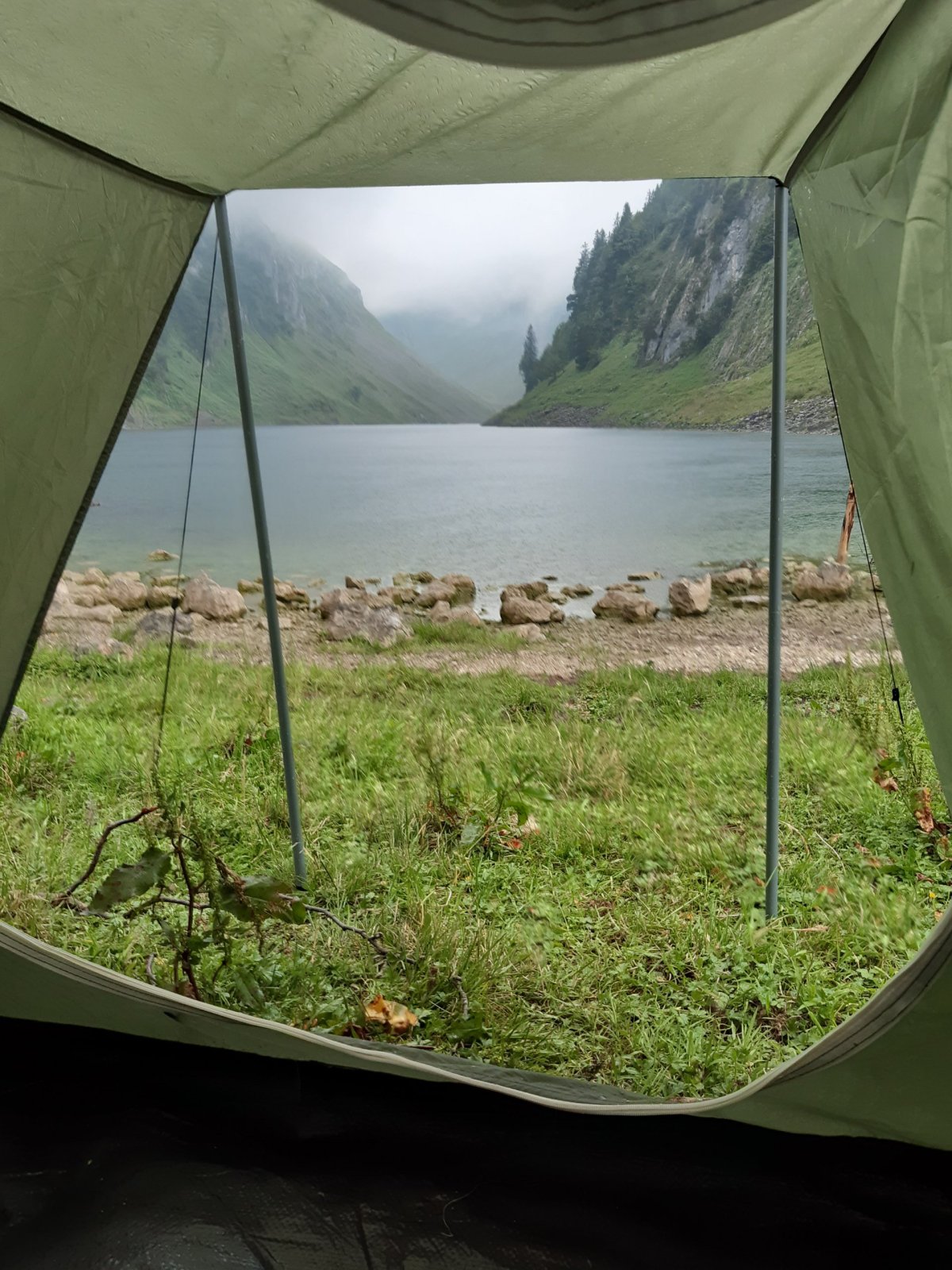 Druhý den jsme už vyrazili do Švýcarska. První zastávkou byla vesnička Brulisau, výchozí bod treku na Saxer Lücke. Auto jsme nechali na parkovišti u lanovky (zdarma) a lanovkou jsme vyjeli na Höher Kasten ( 27 CHF/os.). Z Höher Kasten vedou dvě cesty na Saxer Lücke. Buď můžete jít širší kamennou cestou pod vrcholky, která vede kolem jezera Sämtisersee, nebo se dá jít po hřebeni. Navigace vás bude hnát tou dolní cestou, která je asi pohodlnější a má menší převýšení, ale doporučuji tu po hřebeni, výhledy za to stojí :). K večeru jsme akorát stihli sejít od Saxer Lücke k jezeru Fällensee, a pak nás dostihla bouřka. Rychle jsme se teda vykoupali v ledové vodě a postavili stan na břehu jezera.
