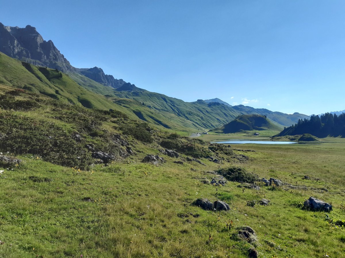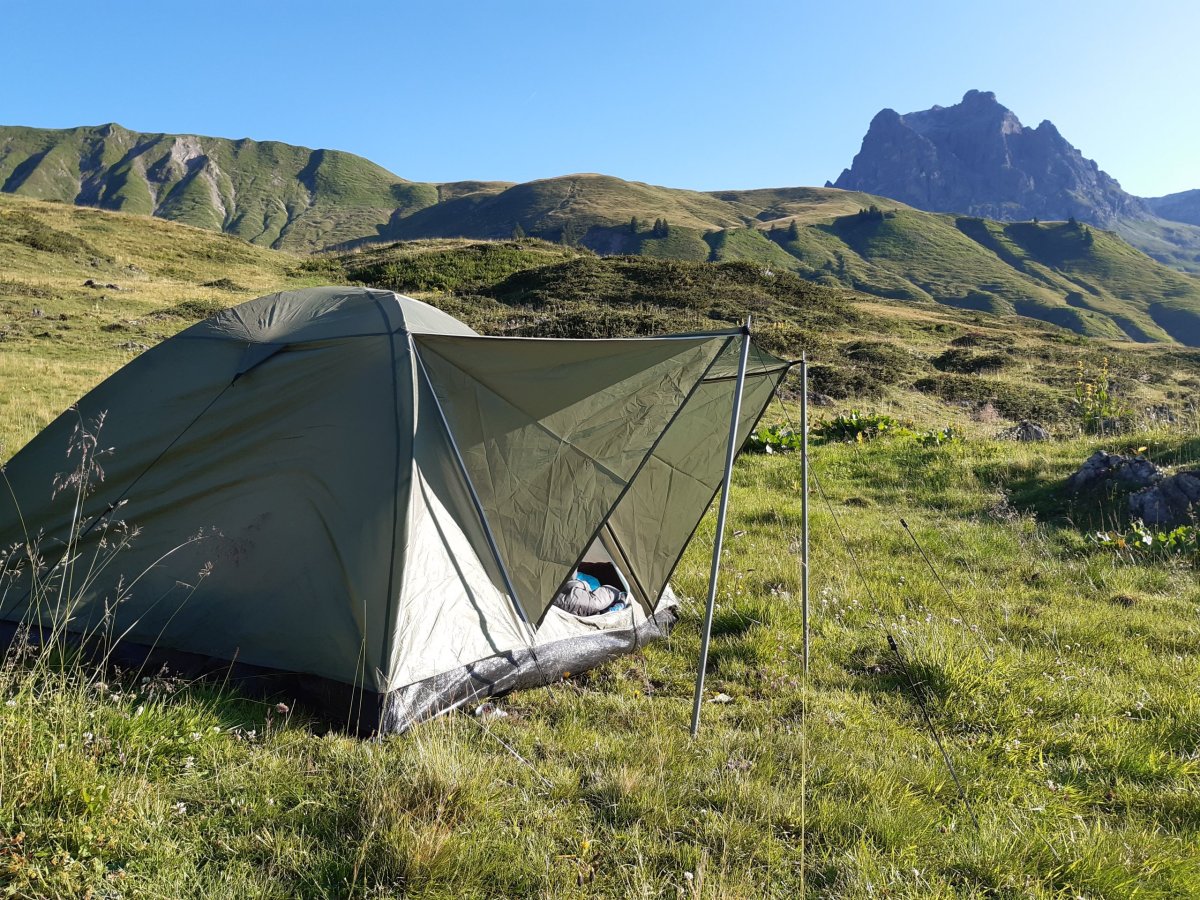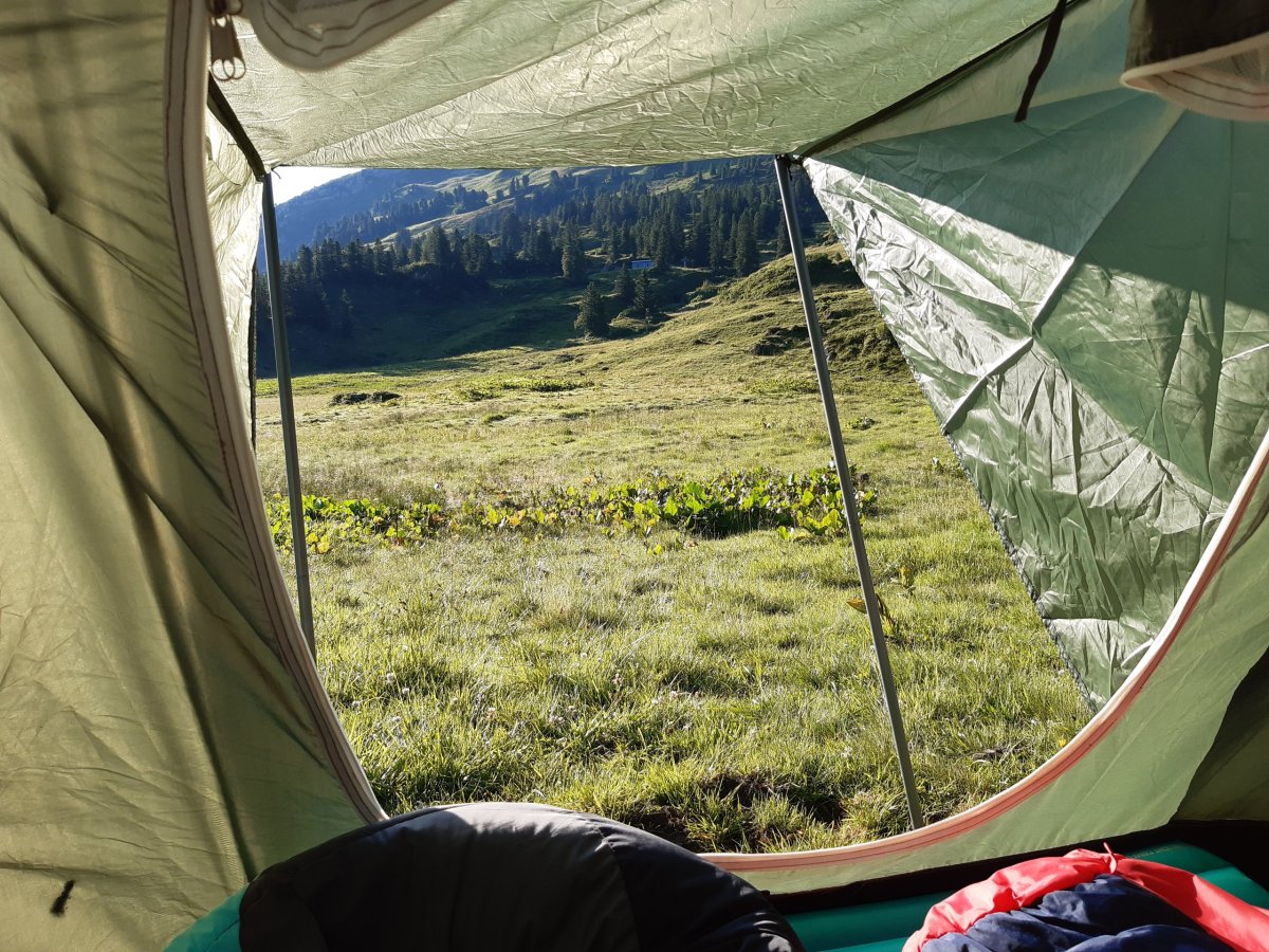 První den jsme měli naplánováno dojet k rakouskému jezeru Kalbelesee (1653 m n.m.), které se nachází kousek od hranic se Švýcarskem, a tam přespat. Kalbelesee se nachází v regionu Voralbersko, který wild camping povoluje. Stan jsme tedy postavili hned vedle jezera a usínali s krásným výhledem na okolní vrcholky.