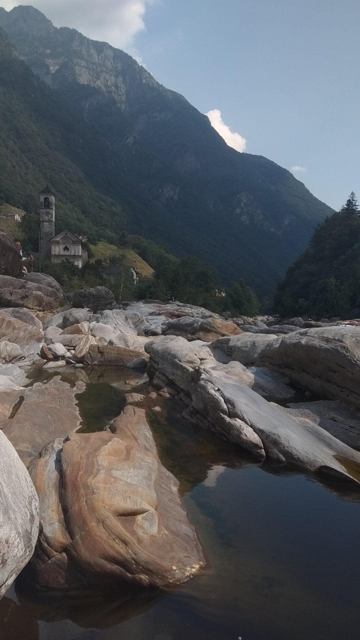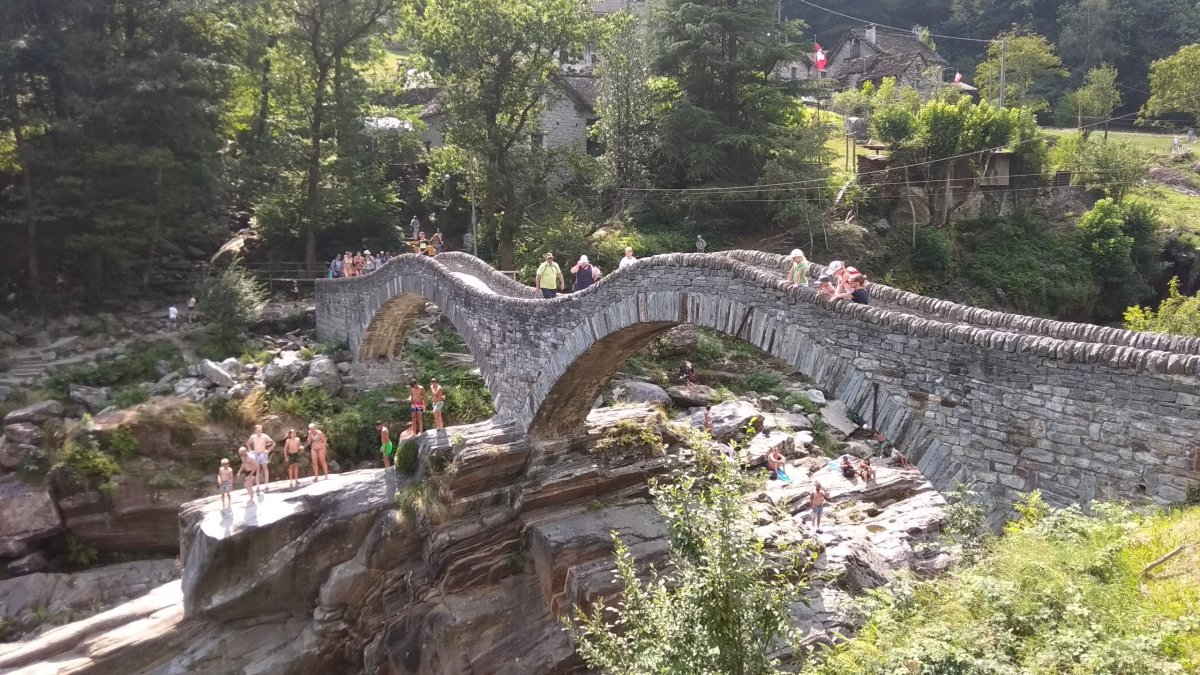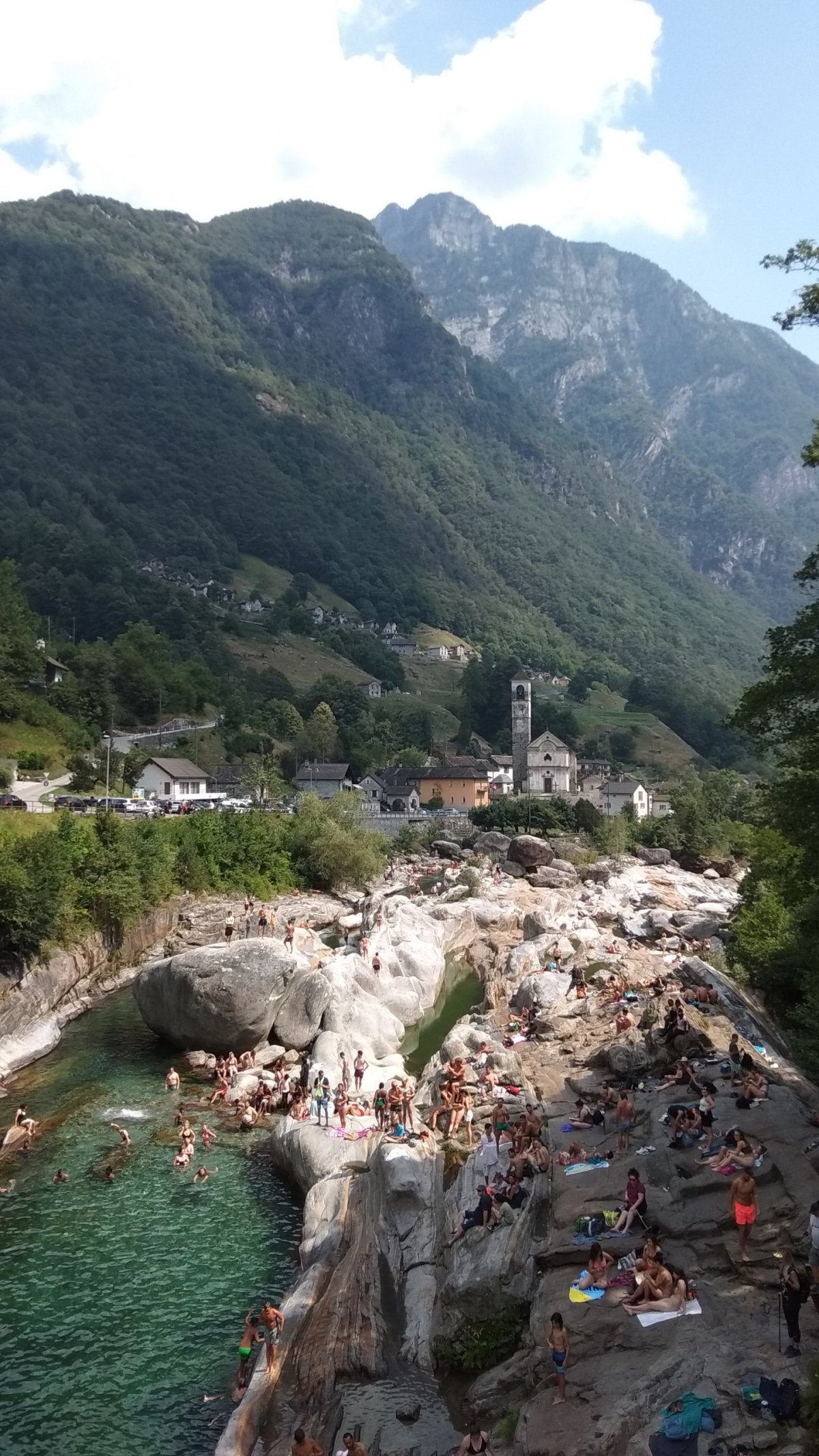 Po návratu k autu nás čekal další přejezd, tentokrát do italsky mluvící části Švýcarska. Odpoledne jsme strávili v městečku Lavertezzo, kterým protéká řeka Verzasca. Řeka zde mezi kameny vymlela unikátní koryto, které je spolu s kýčovitě tyrkysovou vodou ideální na koupání. Místo je dost známé, takže čekejte větší množství turistů. Na druhou stranu krásné koryto se táhne celým městem, takže si stačí najít vzdálenější místo bez lidí nebo přijít těsně před bouřkou, to tam bývá vylidněno.