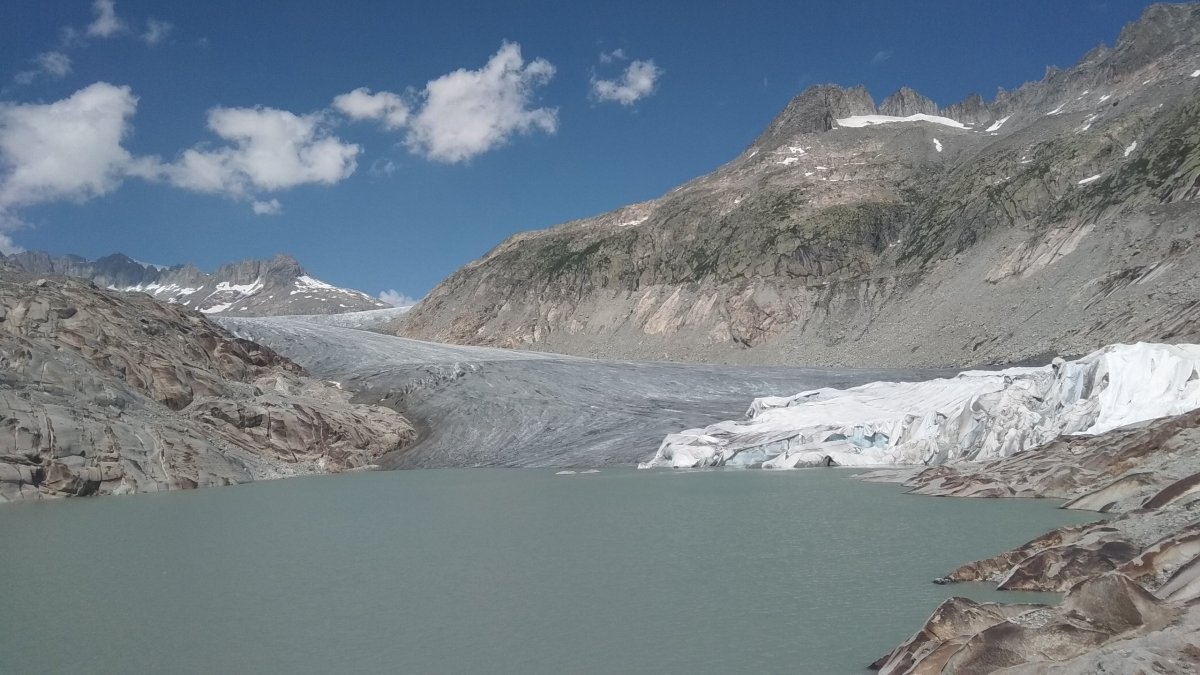 Po postavení stanu jsme jeli omrknout ledovec Rhonegletscher, který se právě ve Furka passu nachází. Za vstup k ledovci (a do něj) chtějí 9 CHF. Hned vedle ledovce si můžete udělat fotku se známým hotelem Belvedere. No a pak nám ke štěstí už stačila jenom flaška vína, jídlo z ešusu a pozorování západu slunce nad průsmykem.