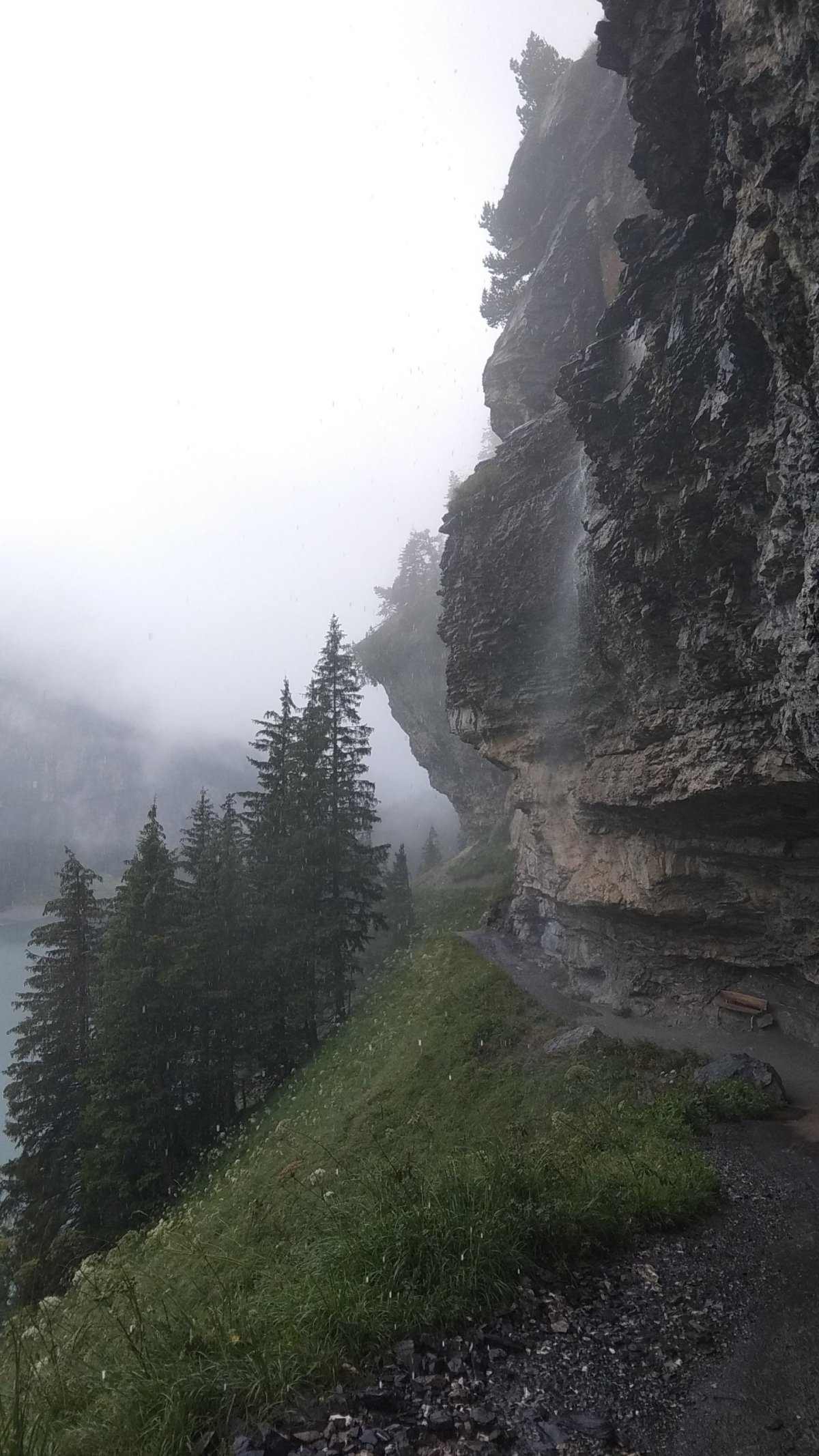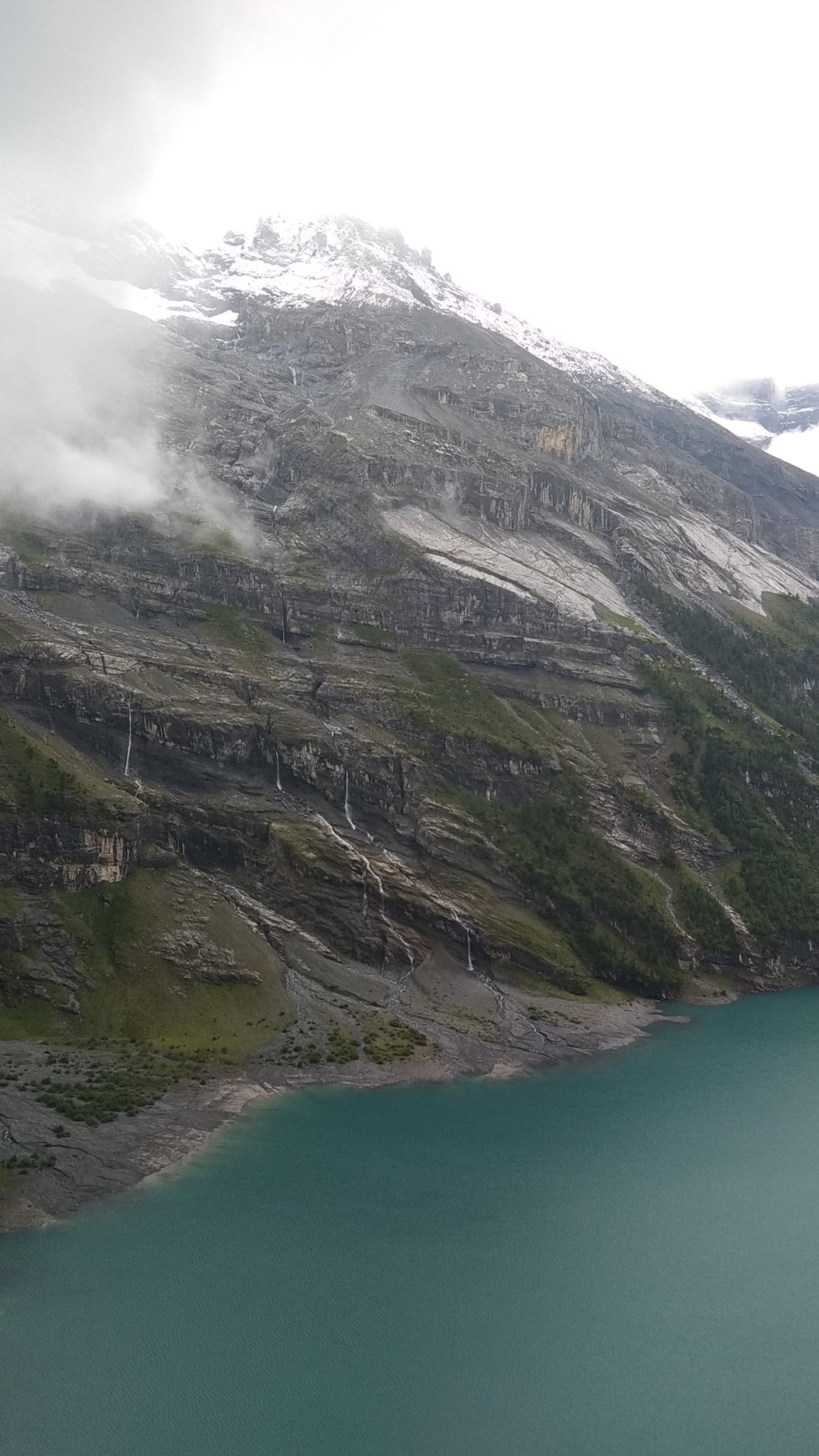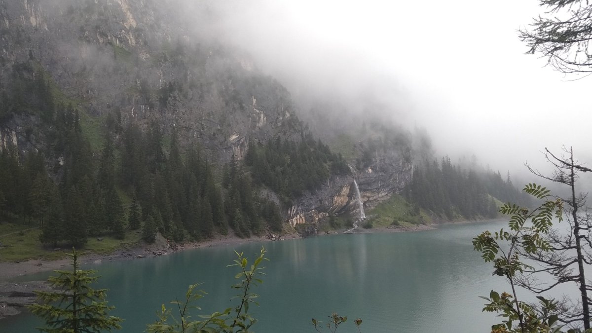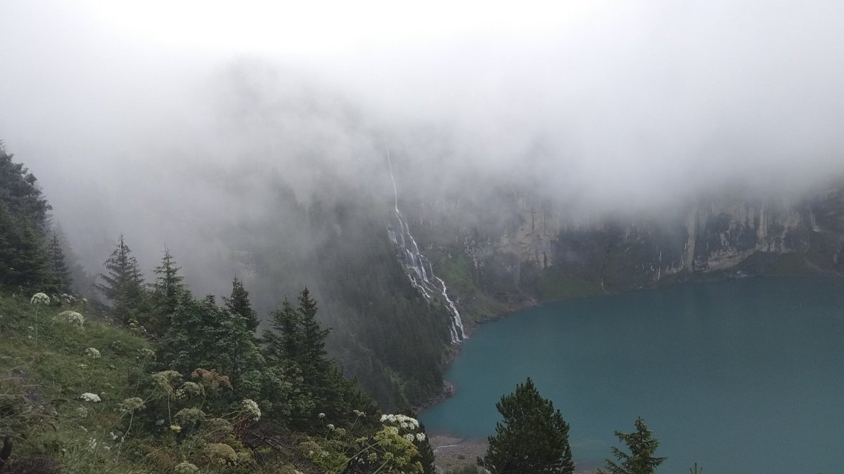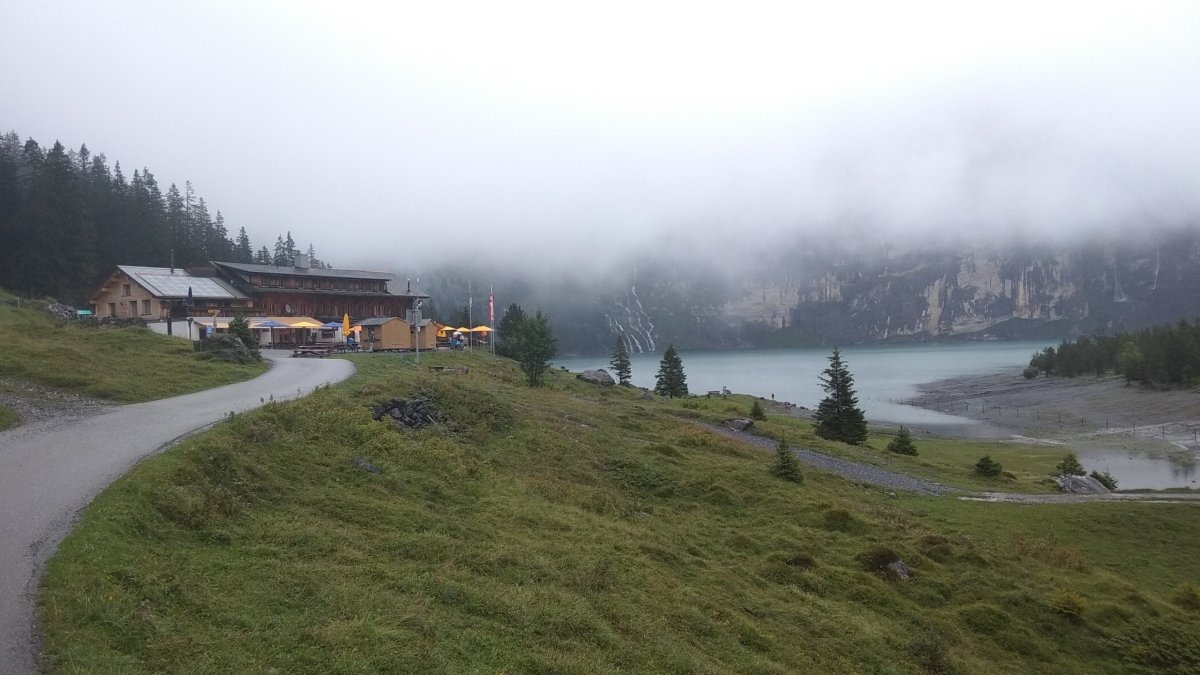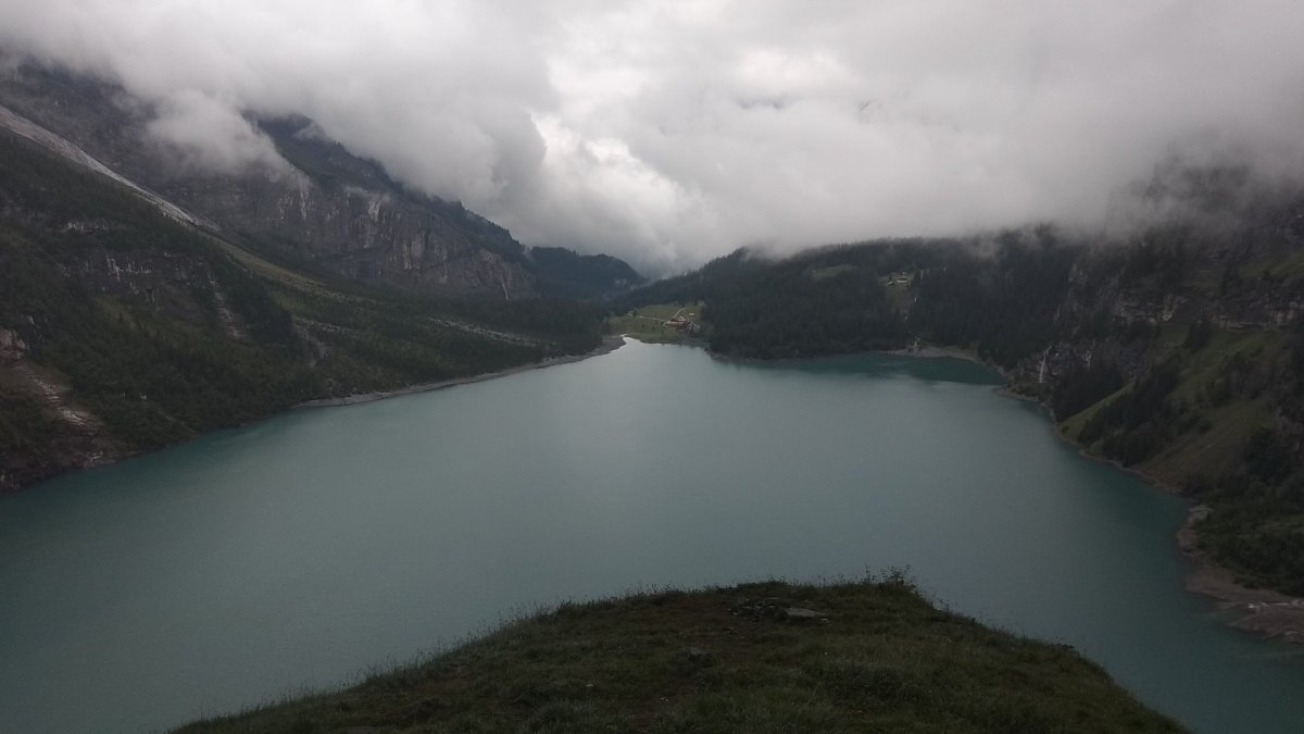 Devátý den ráno jsme přejeli do Kanderstegu, výchozího bodu pro trek na Oeschinensee. Předem jsme věděli, že kolem jezera jsou cedule se zákazem kempování, na druhou stranu jsme ale věděli také o dost lidech, kteří tam přespali. Proto jsme si s sebou nahoru zabalili batohy se stanem a řekli si, že se rozhodneme nahoře. Auto jsme nechali asi za 5 CHF na parkovišti kousek od lanovky. Lanovku jsme tentokrát nevyužili a vyšlápli jsme si to k jezeru po svých. Trvalo to asi hodinu a půl, než se před námi zjevilo jezero. Od rána zase mrholilo, takže se těsně na hladinou válely mraky a vlastně jsme nic moc neviděli. Na druhou stranu počasí spoustu turistů odradilo, takže jsme tam byli skoro sami.