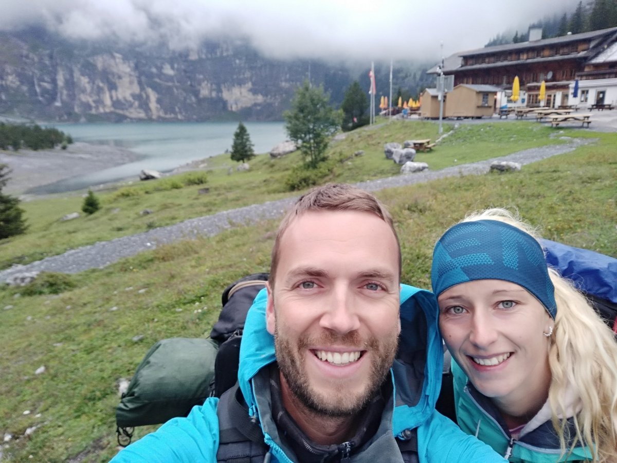 Byli jsme trochu promrzlí, tak jsme zašli do hotelu na břehu jezera na Ovomaltino a koláč. Původně jsme plánovali postavit stan v lesíku na pravém břehu jezera, ale skoro celá strana byla uzavřena z důvodu padajícího kamení. Jediná možnost byla jezero obejít. Mapy.cz hlásily, že cesta kolem jezera je na 3,5h, což nás trochu překvapilo vzhledem k tomu, že na druhou stranu jezera člověk v pohodě dohlédne. Měli jsme ale spoustu času, a tak jsme se kolem jezera vydali. Po chvíli jsme pochopili. Cesta se táhla po hřebeni střídavě nahoru a dolů, každých pár set metrů jsme museli přebrodit nějaký potok a navíc se cesta stále zužovala. Po necelých dvou hodinách jsme došli na druhý konec jezera, kde se cesta změnila v 30cm širokou pěšinku vedoucí po skalním převisu. To se nám po dešti a s těžkými batohy na zádech vůbec nelíbilo, a tak jsme to přesně v půlce cesty otočili a šli zpátky.. Pár míst na stan jsme cestou potkali, ale neměli jsme nějak náladu to pokoušet, cedule se zákazem byly fakt všude. Všude jinde bylo zatím stanování na divoko bez problému, tak jsme se úplně nechtěli Švýcarům odvděčovat tím, že na jediném místě naší cesty, kde to mají výslovně zakázané, stejně stan postavíme. Proto jsme sešli zpět dolů do Kanderstegu a zůstali přes noc v kempu u lanovky.Ráno po probuzení jsme konečně uviděli horské štíty všude kolem, které se celý předchozí den schovávaly v mracích.