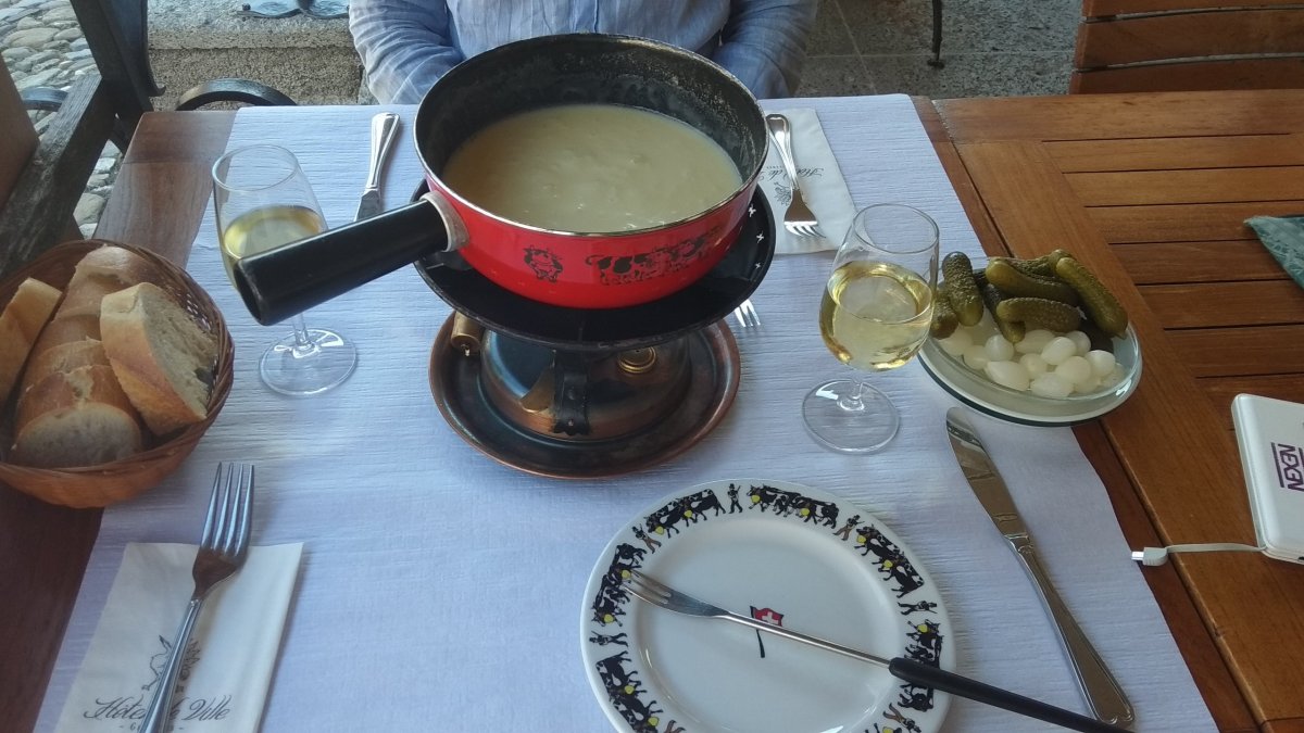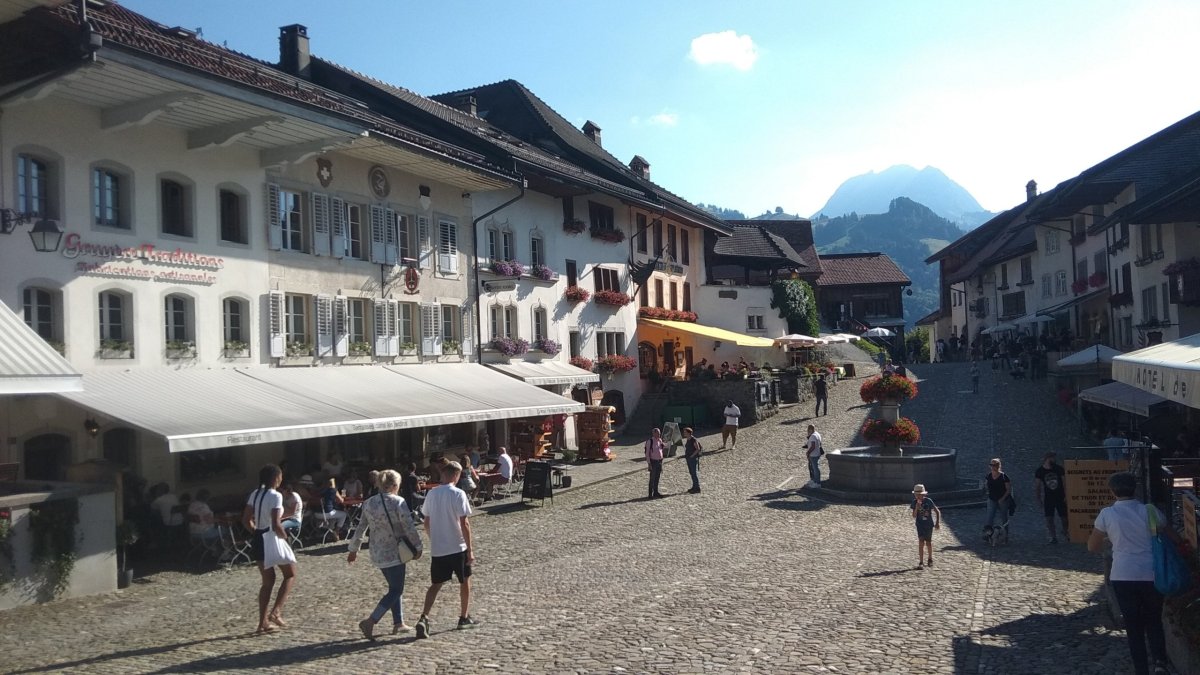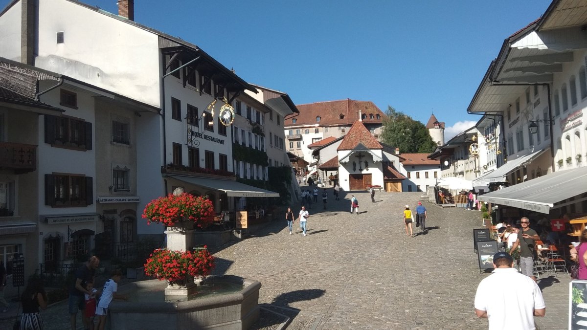 Po obědě na parkovišti jsme vyrazili k Ženevskému jezeru do městečka Montreaux. Udělali jsme pár fotek jezera s hradem Chillon, kousek se prošli, a pak zas sedli do auta a vrátili zpátky do oblasti Gruyeres známé především výrobou stejnojmenného sýra. Prošli jsme si středověké městečko Gruyeres a na náměstí si dali k večeři naše první švýcarské fondue (25 CHF/os).