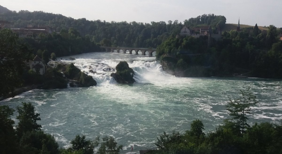 Po celkových 16 hodinách na cestě se dostáváme do Švýcarska. První rychlou zastávkou je město Schaffhausen, které se nachází na břehu Rýna. Symbolem je pevnost Munot, která se tyčí nad městem a nabízí výhled na historické centrum města a řeku Rýn. Město je navštěvované turisty, protože přímo sousedí s městem Neuhausen, ve kterém se nachází proslulé Rýnské vodopády (3 km pešky z centra Schaffhausenu), které se řadí mezi největší a nejmohutnější vodopády v Evropě. Výška vodopádu činí 23 m a jeho šířka je kolem 150 metrů. Turisté si mohou vybrat z několika vyhlídkových plaveb po řece až se dostanou přímo pod vodopády. Uprostřed vodopádů se nachází vyhlídková plošina, která umocňuje celý zážitek. Na bližší zkoumání Rýnských vodopádů není čas, protože 8 dní ve Švýcarsku je velmi krátká doba a program je velmi našlapaný, proto se pokračuje vlakem ze Schaffhausenu do Curychu.