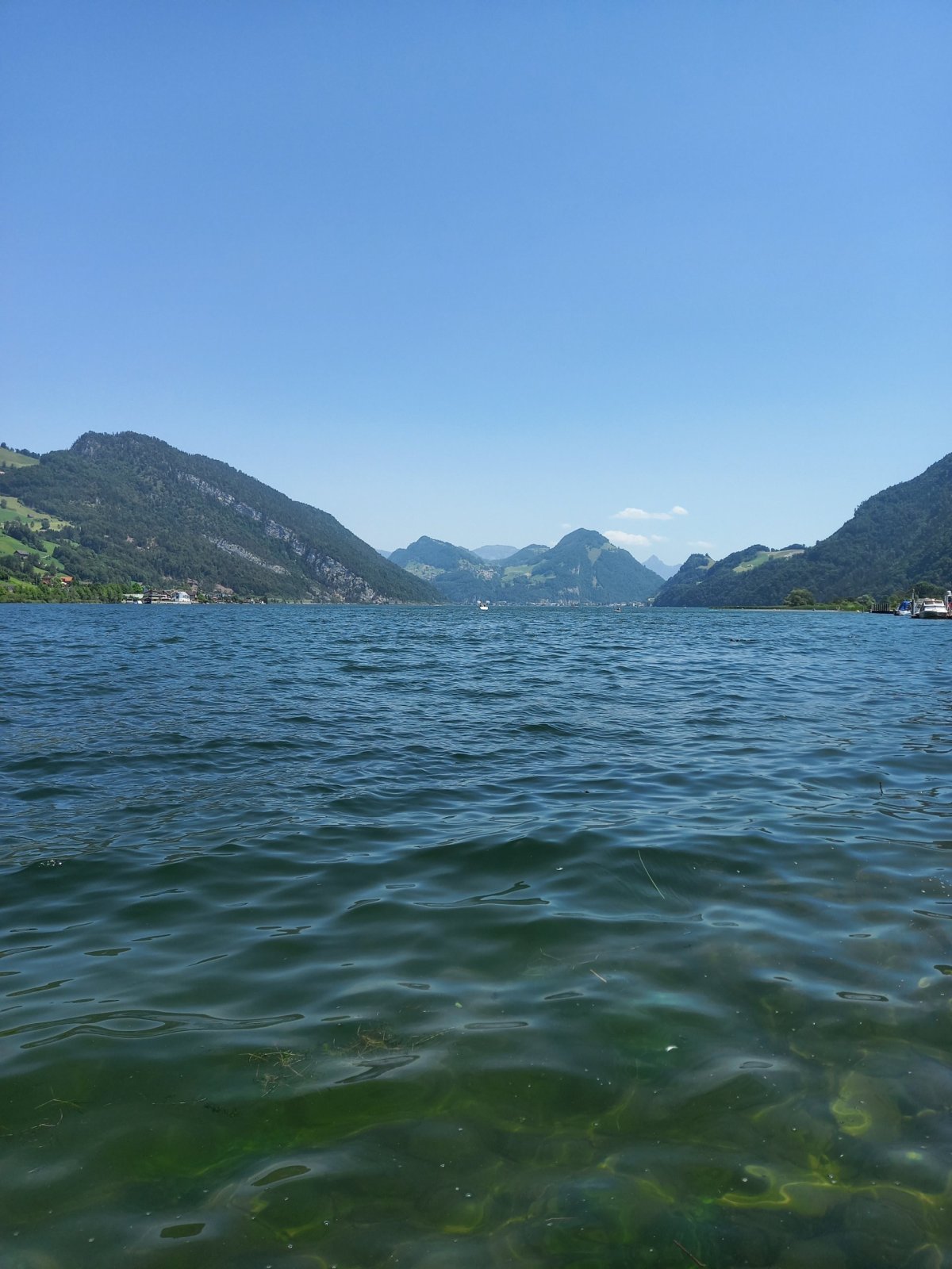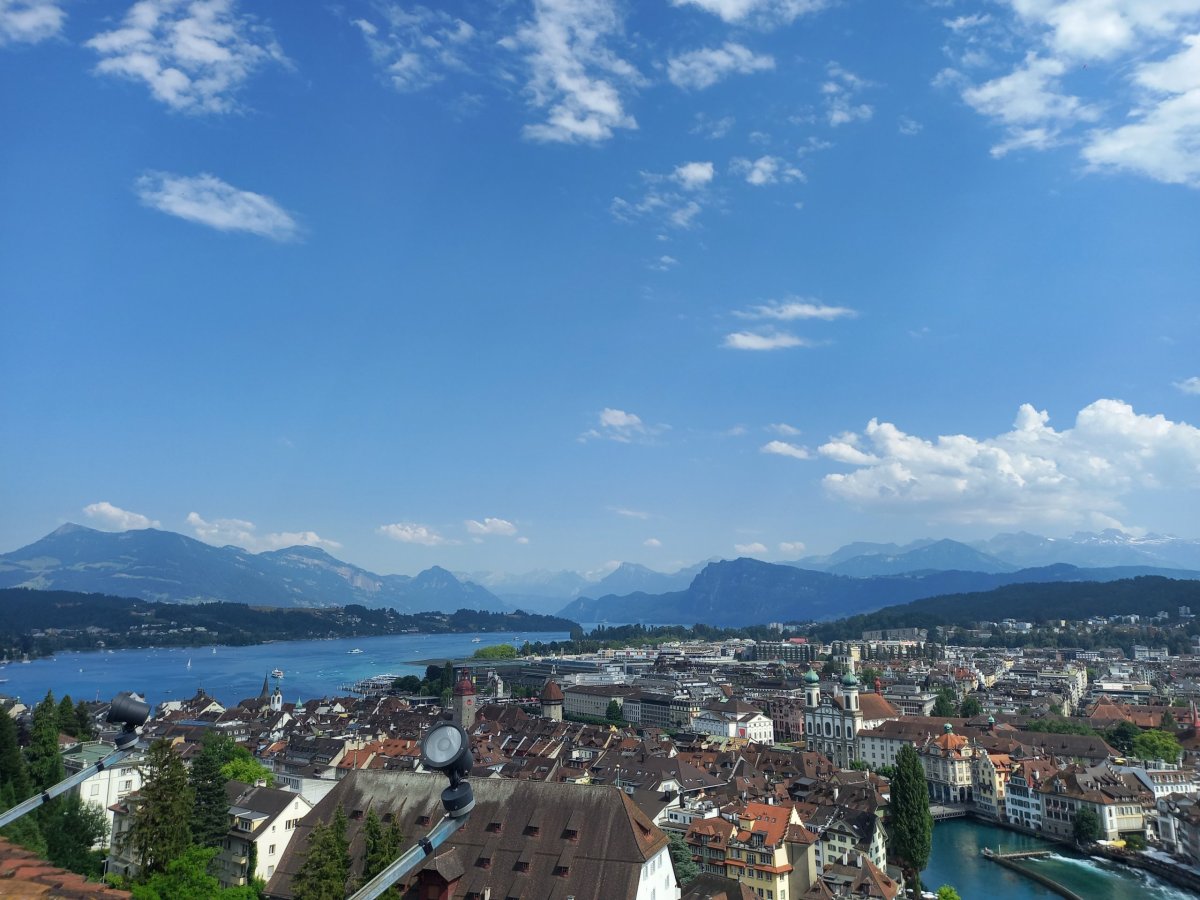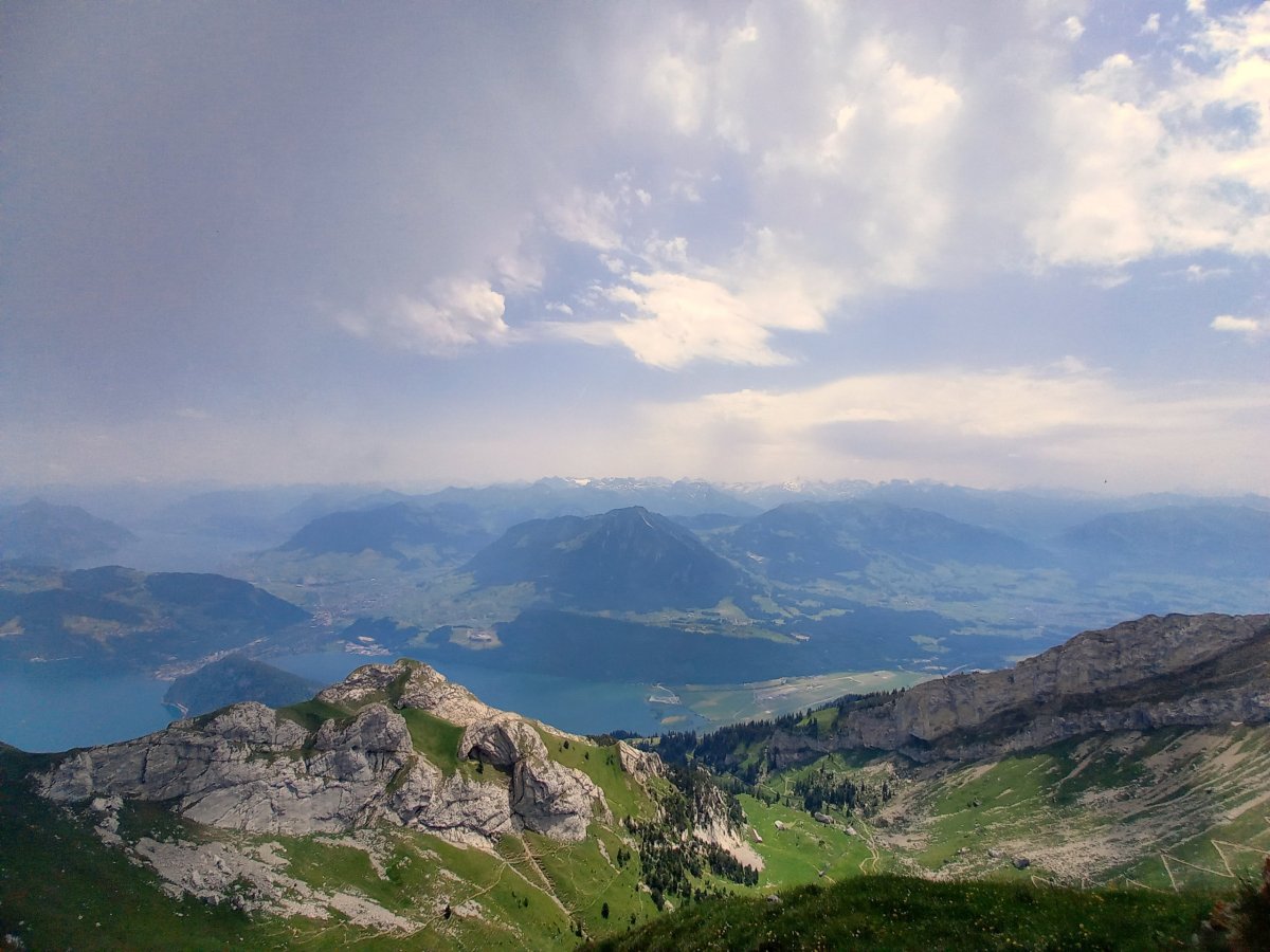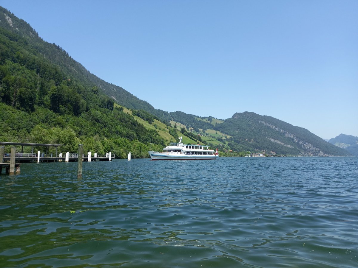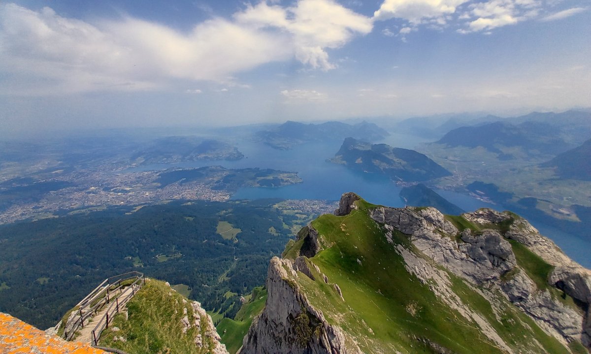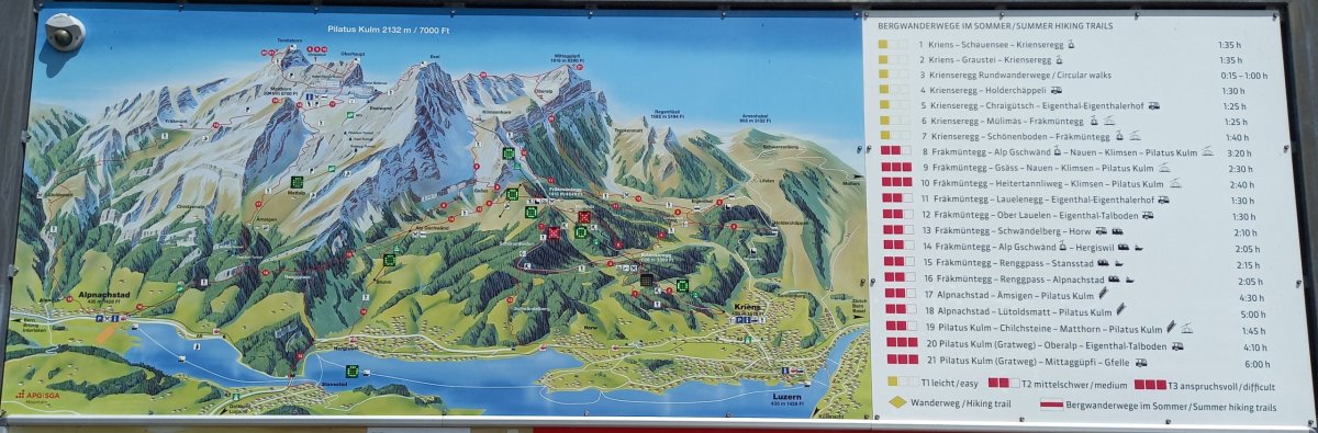 Po nečekaných peripetiích je možné pokračovat vlakem do Lucernu. Výhodou je, že člověk nemusí řešit jízdní řád, protože vlaky odjíždění každou půlhodinu. Po příjezdu do Lucernu jsou zavazadla odložena do úschovy a pokračuje se do Alpnachstadu, což je vesnice na břehu Lucernského jezera (Vierwaldstättersee) zhruba 20 minut jízdy od Lucernu, odkud vedou turistické trasy + ozubnicová železnice na vrchol Pilatus. Po příjezdu do Alpnachstadu je nutné přehodnotit plán, protože je příliš mnoho hodin. Pouze 30minutový pobyt na vrcholu Pilatusu by nedával smysl, protože bylo nutné brát ohled na otevírací dobu úschovy v Lucernu, kde byla uložena zavazadla. Na rozhodnutí přesunout návštěvu Pilatusu na jiný den má navíc podíl i velmi špatná viditelnost. Nebe je sice bez mraků, ale teploty dosahují již několik dní po sobě 31-35°C, což přináší pro viditelnost své následky. Nejvhodnější je proto zvolit koupání v jezeře, které je čisté a velmi osvěžující v tomto počasí.