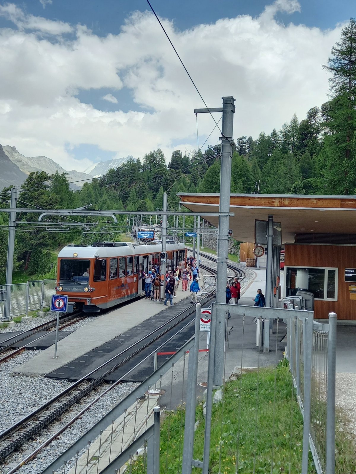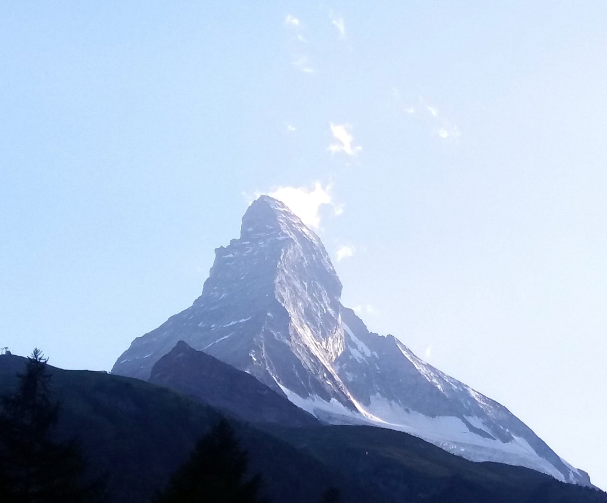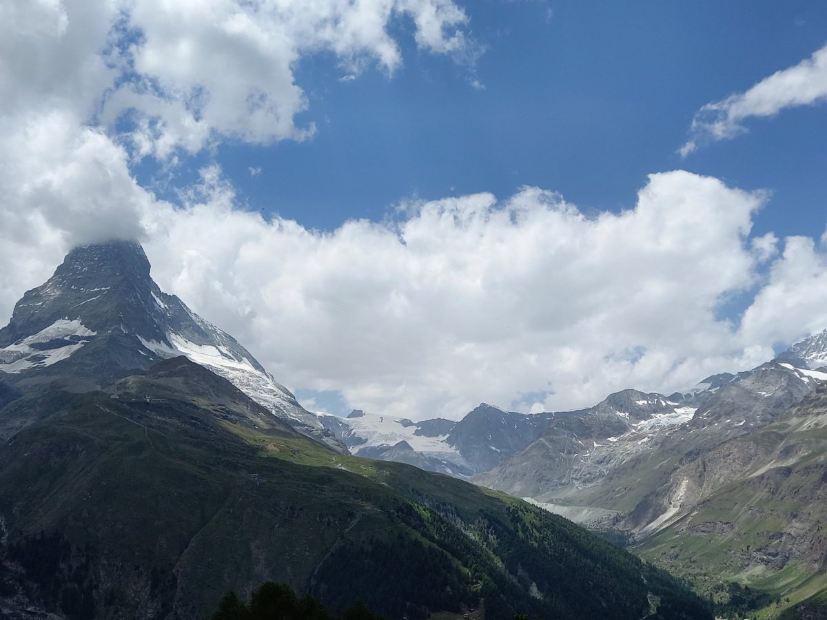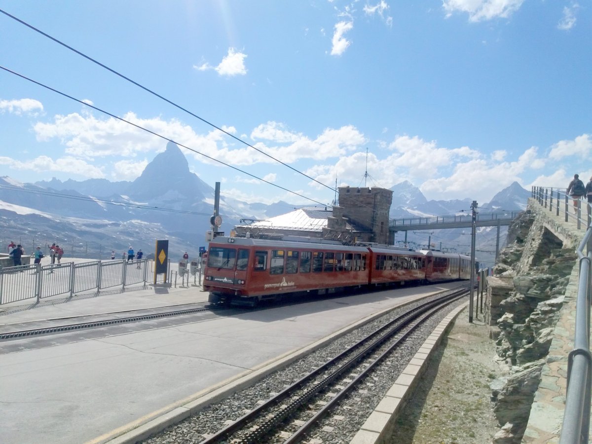 Předpověď počasí na celý týden nevypadala zrovna příznivě, proto došlo k rozhodnutí pro cestu do Zermattu hned druhý den. Bohužel komplikace na cestě (nezvyklá zpoždění na švýcarských železnicích) zapříčinily příjezd do Zermattu až v 11:30. Při 40km cestě z Vispu (630 m.n.m.) do Zermattu (1610 m.n.m.) musí vlak nastoupat téměř 1200 výškových metrů a k vidění jsou pěkné scenérie. Plánujete-li se přepravit do Zermattu autem, tak máte smůlu, protože vjezd automobilů je zde zakázán a vozidla je nutné nechat zaparkovat na odstavném parkovišti Matterhorn Terminal v Taschi (16 CHF/den) a dále pokračovat 4 km vlakem do Zermattu (16,4 CHF zpáteční Tasch - Zermatt). Po Zermattu je možné se pohybovat pěšky nebo použít zdejší MHD (malé elektrobusy). Symbol celého Švýcarska = Matterhorn již můžete vidět rovnou od nádraží v Zermattu. Turisté v Zermattu nejčastěji volí navštívit jednu ze 4 oblastí: