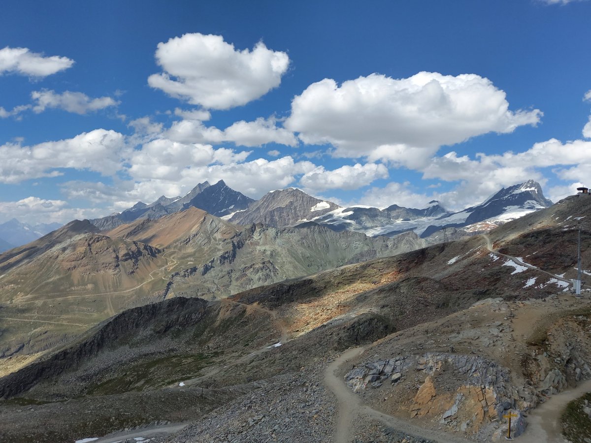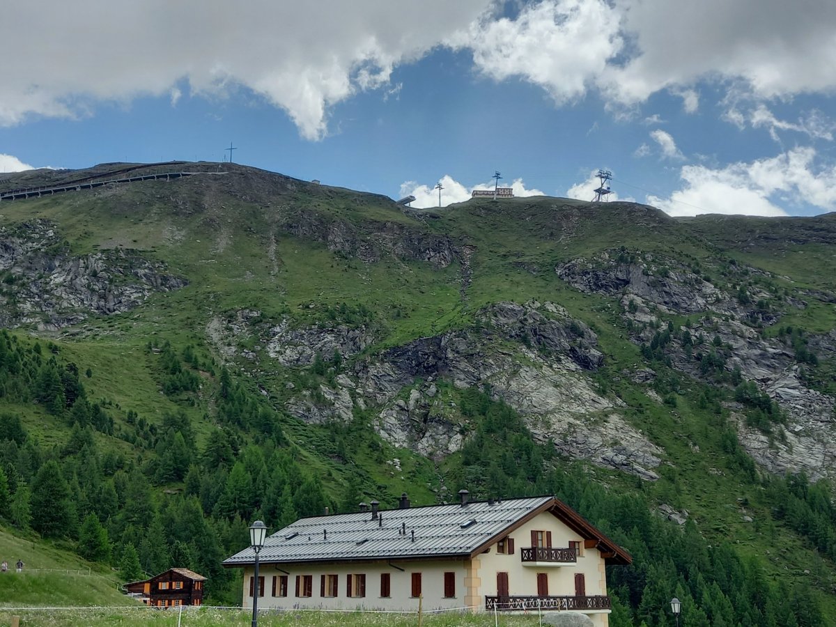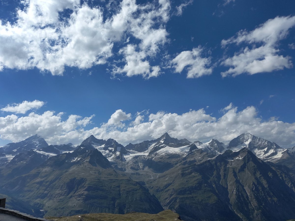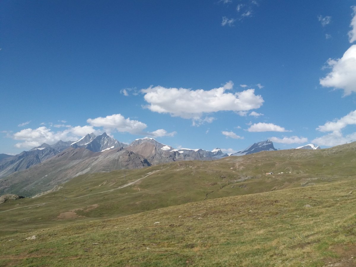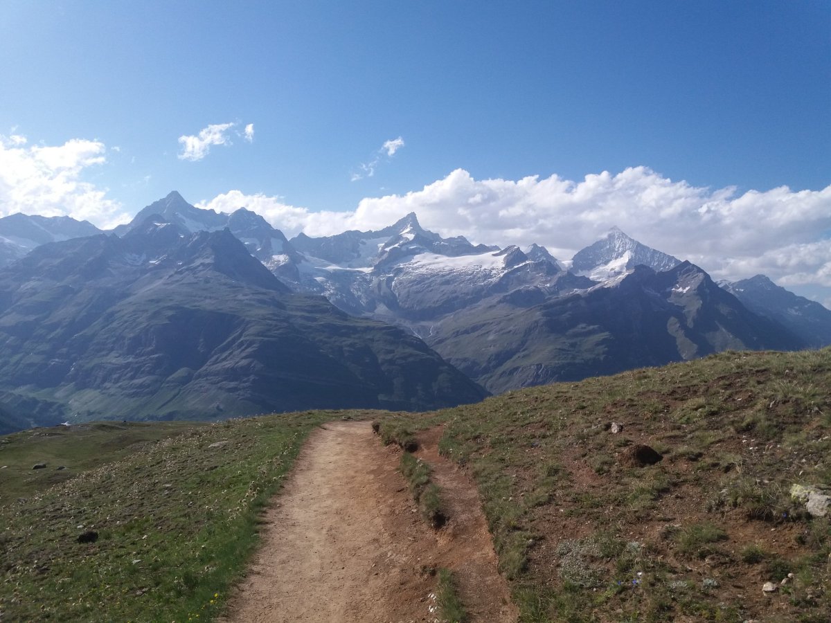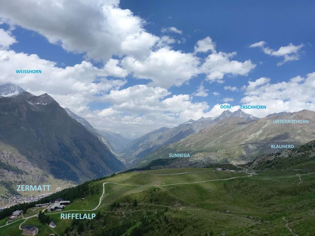Po 90 minutách dřiny do kopce se cesta narovnává a přicházíme na zastávku Riffelalp (2211 m.n.m.), kde končí pásmo lesa. Teplota lehce klesá a otevřou se nám výhledy na protější stranu, kde se nachází vrcholy v čele se Zinalrothornem (4221 m.n.m.) a Weisshornem (4505 m.n.m.) bohužel špičky vrcholů nad 4000 metrů včetně Matterhornu jsou stále v mracích. Přesto úžasné panorama pomáhá zdolat velmi nepříjemné stoupání z Riffelalpu na Riffelberg, které má turista dle ukazatelů zvládnout za 70 minut. V uvedeném úseku doporučuji doplnit zásoby vody z přilehlého potoka, protože výše na trase už žádný vodní tok neteče, nebudeme-li počítat jezero Riffelsee.