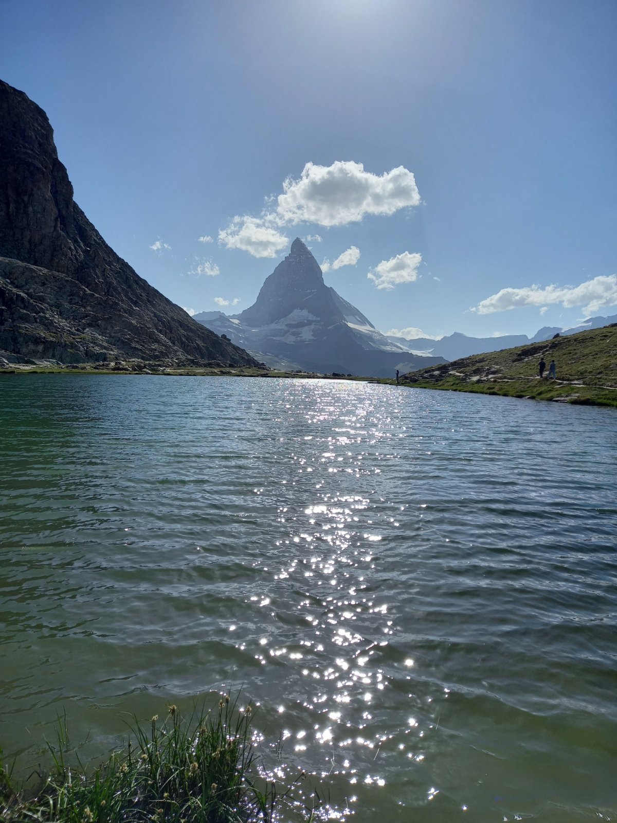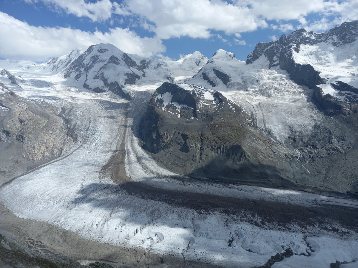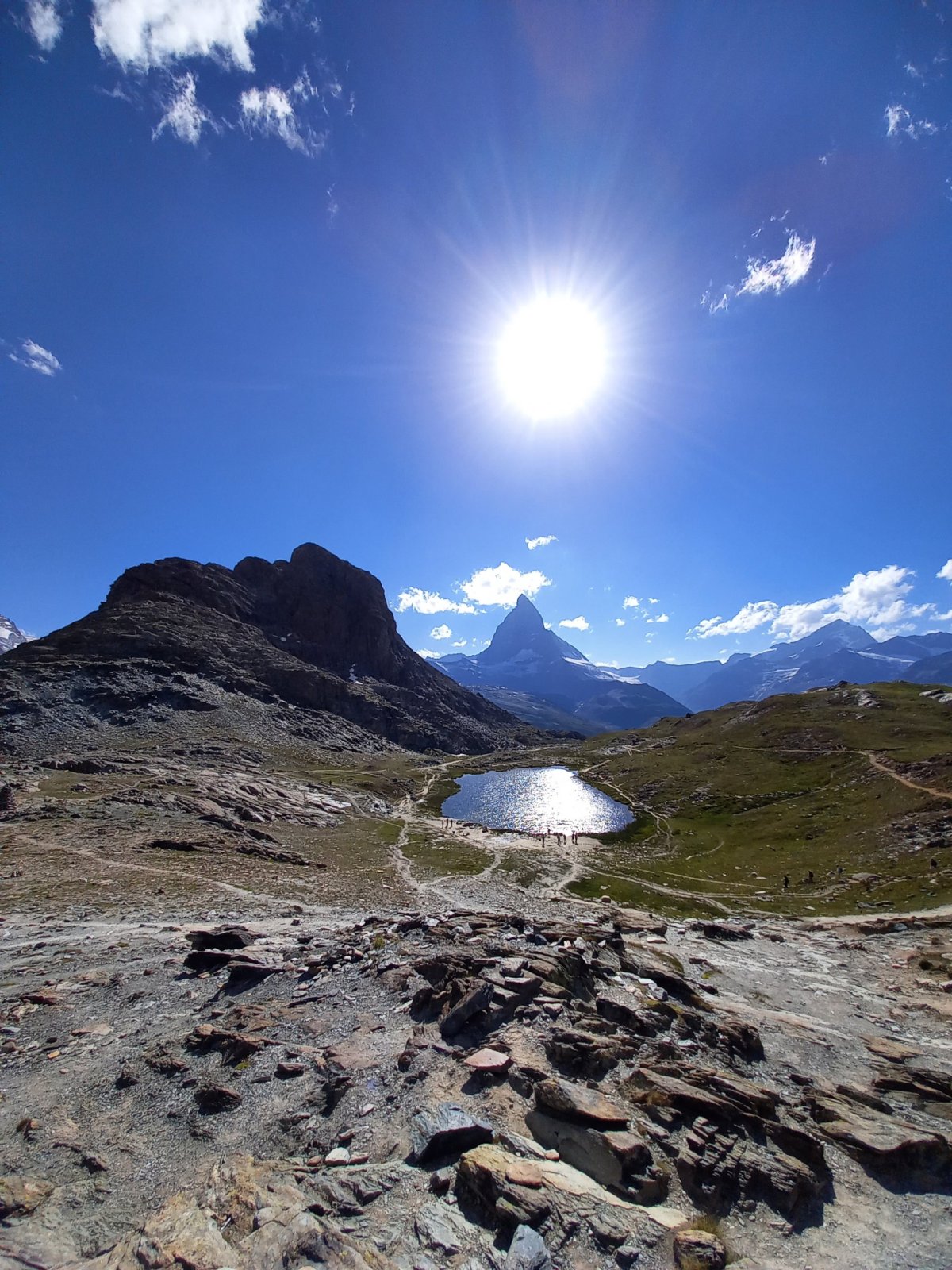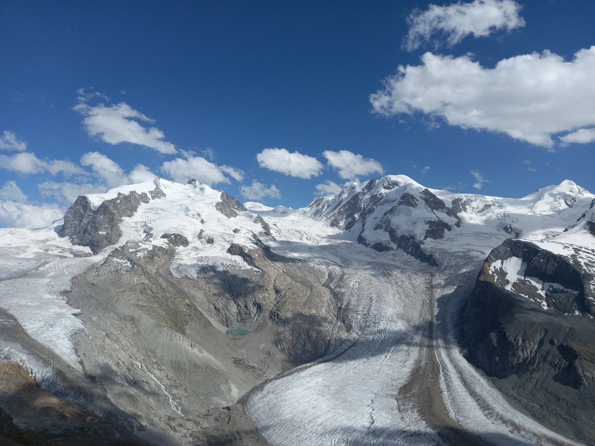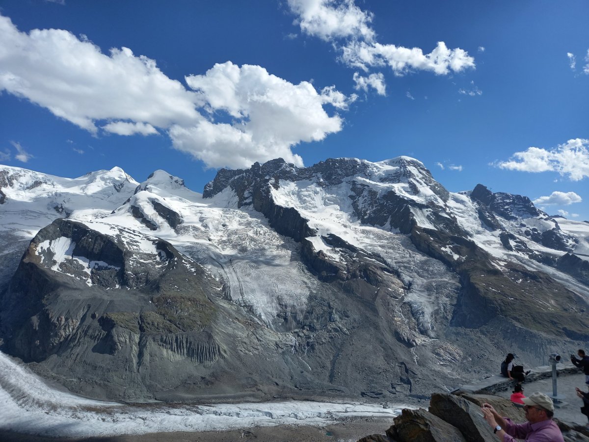 Po 90 minutách dřiny do kopce se cesta narovnává a přicházíme na zastávku Riffelalp (2211 m.n.m.), kde končí pásmo lesa. Teplota lehce klesá a otevřou se nám výhledy na protější stranu, kde se nachází vrcholy v čele se Zinalrothornem (4221 m.n.m.) a Weisshornem (4505 m.n.m.) bohužel špičky vrcholů nad 4000 metrů včetně Matterhornu jsou stále v mracích. Přesto úžasné panorama pomáhá zdolat velmi nepříjemné stoupání z Riffelalpu na Riffelberg, které má turista dle ukazatelů zvládnout za 70 minut. V uvedeném úseku doporučuji doplnit zásoby vody z přilehlého potoka, protože výše na trase už žádný vodní tok neteče, nebudeme-li počítat jezero Riffelsee.