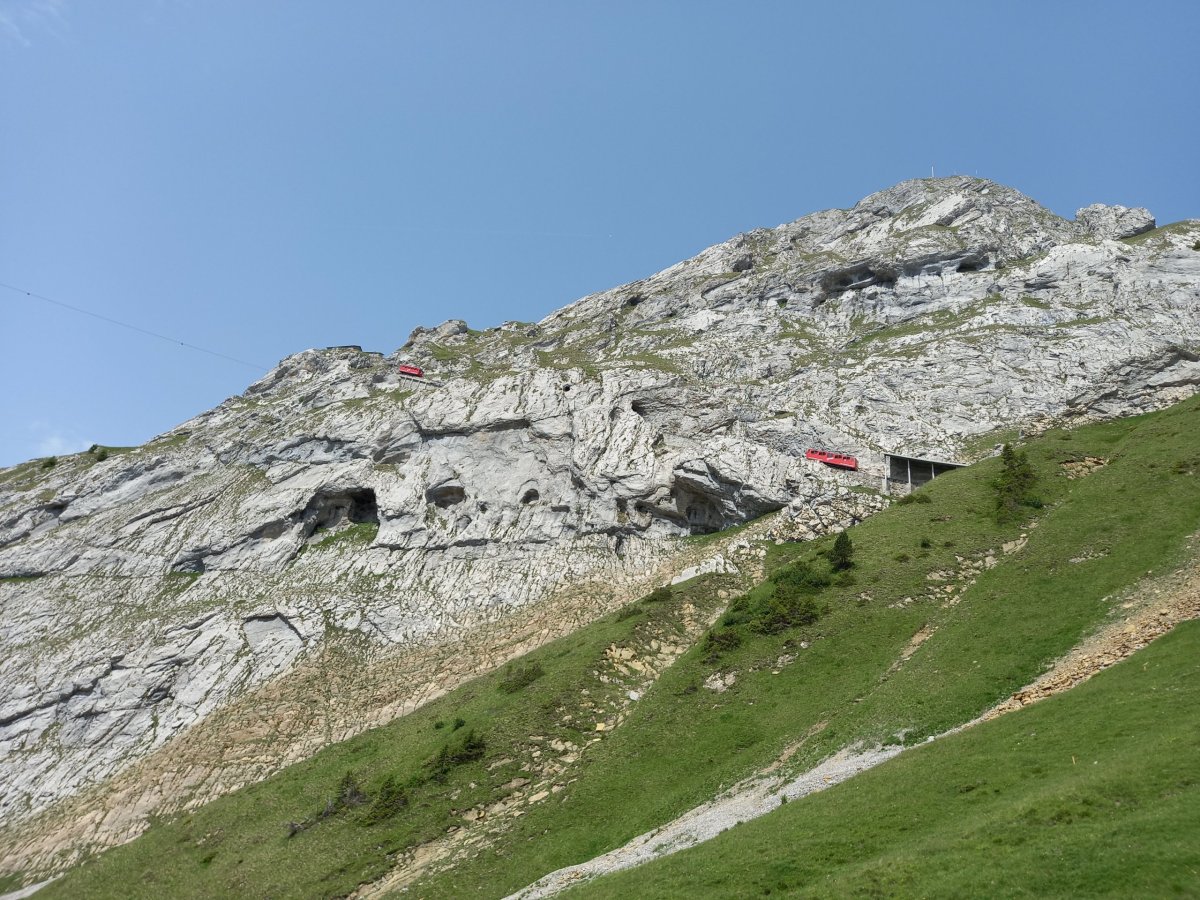 Další možností je vyjet na vrchol nejstrmější zubačkou na světě (48 %), která jezdí z Alpnachstadu, kde jsme již byli první den. Opět proto jedeme vlakem po známé trase z Bernu přes Luzern do Alpnachstadu. Stanice ozubnicové železnice a klasické železnice jsou hned vedle sebe. Bohužel zranění z předchozího dne nedovoluje vyšlápnout na vrchol z Alpnachstadu v novém rekordu, proto kupujeme jízdenku na vrchol (zákl. cena 36 CHF/72 CHF zpáteční → Interrail + STP = sleva 50 %). Po 30minutách dechberoucí jízdy přijíždíme na horní stanici Pilatus Kulm. Je naprosto neuvěřitelné, v jakých sklonových poměrech a terénu byla ozubnicová železnice vybudována a uvedena do provozu roku 1889.
