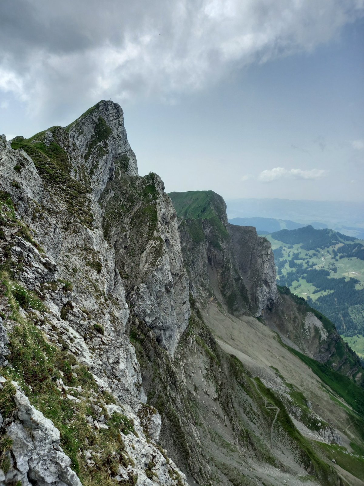 Bohužel předpověď počasí nelhala (déšť + bouřky) a počasí se začíná velmi rychle zhoršovat, proto je nezbytné sestoupit do údolí. Je možné použít lanovku do Grindelwaldu nebo Wengenu, ale preferujeme pěší sestup, protože chceme jít po Panoramaweg do průsmyku Kleine Scheidegg (2061 m.n.m.), které leží přímo pod horou Mönch a nachází se zde stejnojmená žel. stanice, odkud jezdí vlaky do údolí (Grindelwald / Lauterbrunnen) nebo na Jungfraujoch. Panoramaweg z Mannlinchenu na Kleine Scheidegg mírně klesá a cesta trvá 1-2h v závislosti na tom, jak dlouho chce člověk obdivovat výhledy na ikonickou trojici hor nebo výhled směr Grindelwald. Po krátké zastávce na Kleine Scheidegg pokračujeme pěšky do Grindelwaldu. Pomalu začíná pršet a během cca 3h sestupu je nutné přidat do kroku. Přechod pod majestátný severní stěnou Eigeru je impozantní a mraky dodávají místu ponurou atmosféru, protože mnoho výstupů na Eiger zde skončilo tragicky. Naštěstí do Grindelwadu na Gr. Terminal přicházíme přesně ve chvíli, kdy se spustil pořádný déšť a začala bouřka.
