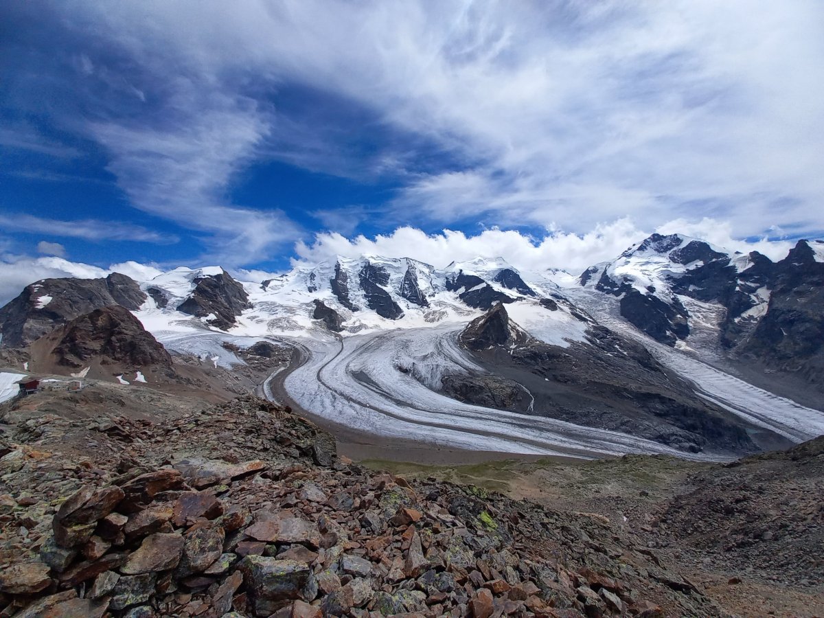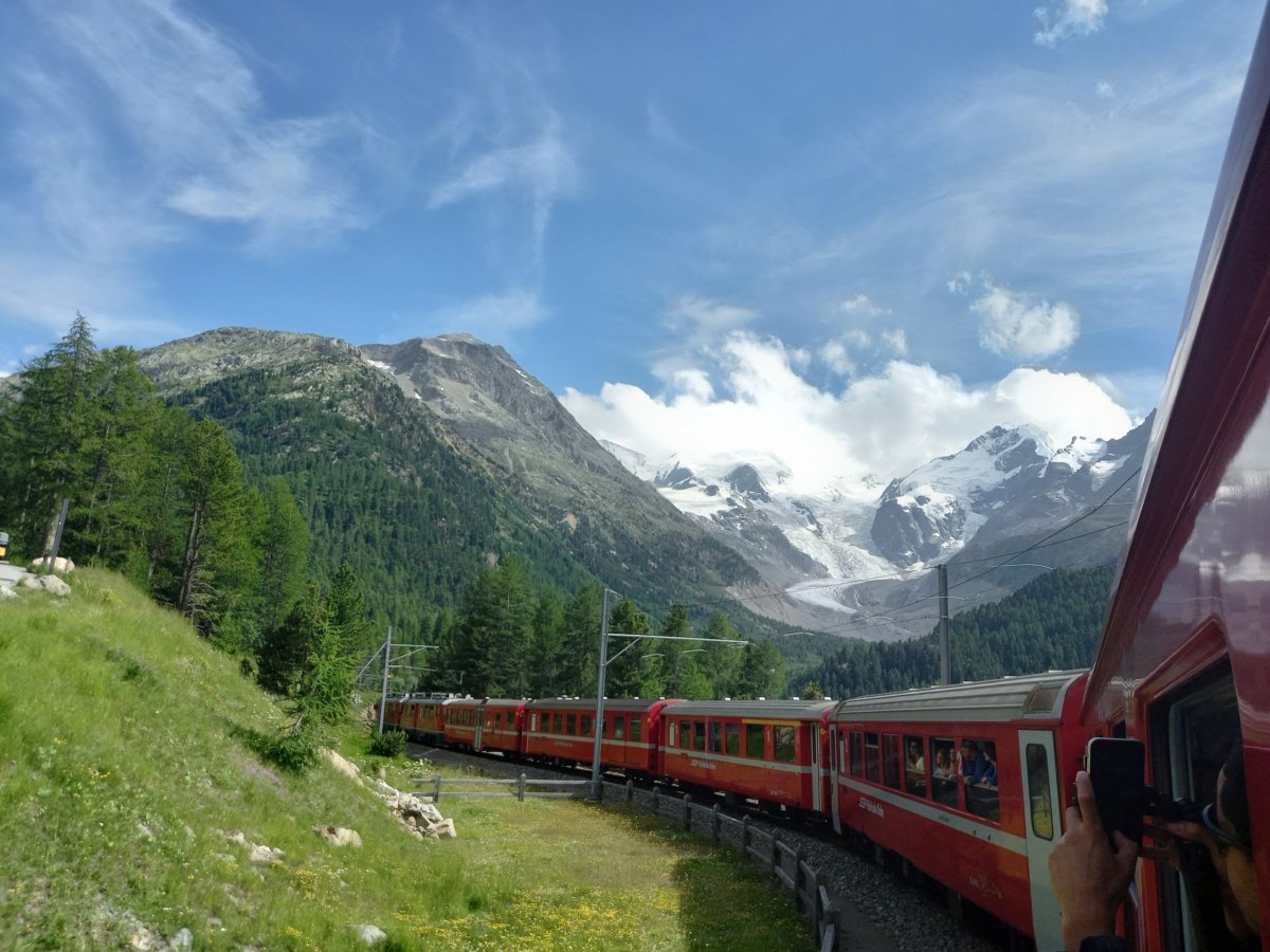 Poslední den ve Švýcarsku opět míříme do Sv. Mořice, abychom opět využili Engadin hiking pass. Tentokrát volíme cestu z Landquartu přes Klosters, abychom viděli i další část Rhétské dráhy. Nutno podotknout, že trasa přes Chur absolvovaná předchozí den mi přišla mnohem zajímavější. Ve Sv. Mořici přestupujeme na vlak do Tirana na další část Rhétské dráhy, kde vlak vystoupá na nejvyšší bod Ospizio Bernina (2253 m.n.m), aby následně začal klesat až do italského města ve výšce 459 m.n.m. Část trasy vynecháme, protože vystupujeme na zastávce Bernina Diavolezza a míříme lanovkou na Diavolezzu (2973 m.n.m.), odkud máme nejvyšší horu Piz Bernina a okolní ledovce doslova na dosah. Dále se nám otevírá výhled do Itálie. Od horní stanice lanovky s restaurací je vhodné vyrazit na zhruba hodinový výšlap na Munt Pers (3207 m.n.m.), který nabízí pohled také směrem na Sv. Mořic. Počasí se opět velmi rychle začíná zhoršovat a proto míříme do údolí, abychom stihli vlaky zpět do Curychu a dále do ČR.