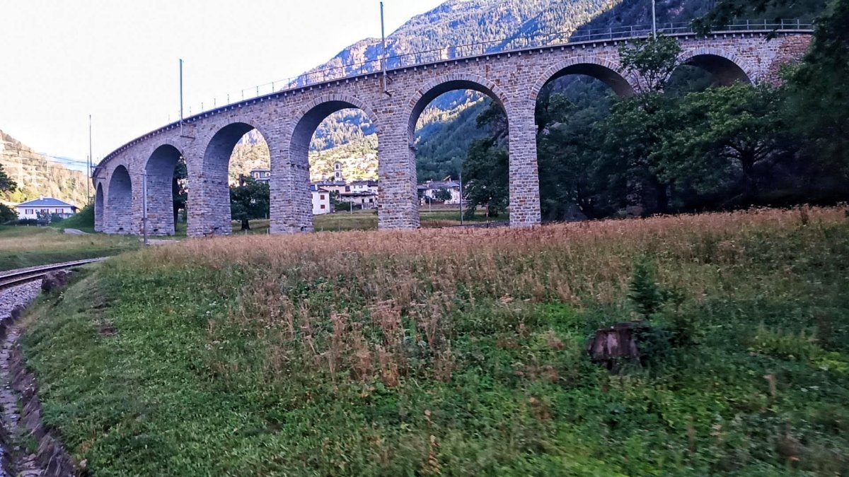 Brzy jedeme po i pod kruhovém viaduktu Jeménem které získalo po stejnojmenné obci Brusio trať zde dělá první uzel a podjíždí se.