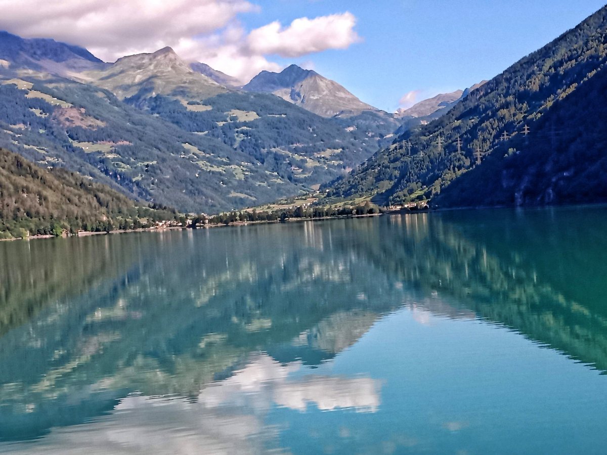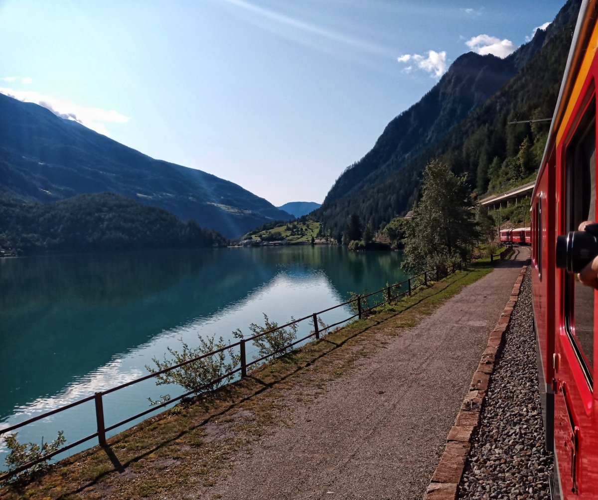 Dále vlak kopíruje západní břeh jezera Lago Di Poschiavo. A výhledy z vlakového vozu už jsou vyloženě fantastické.