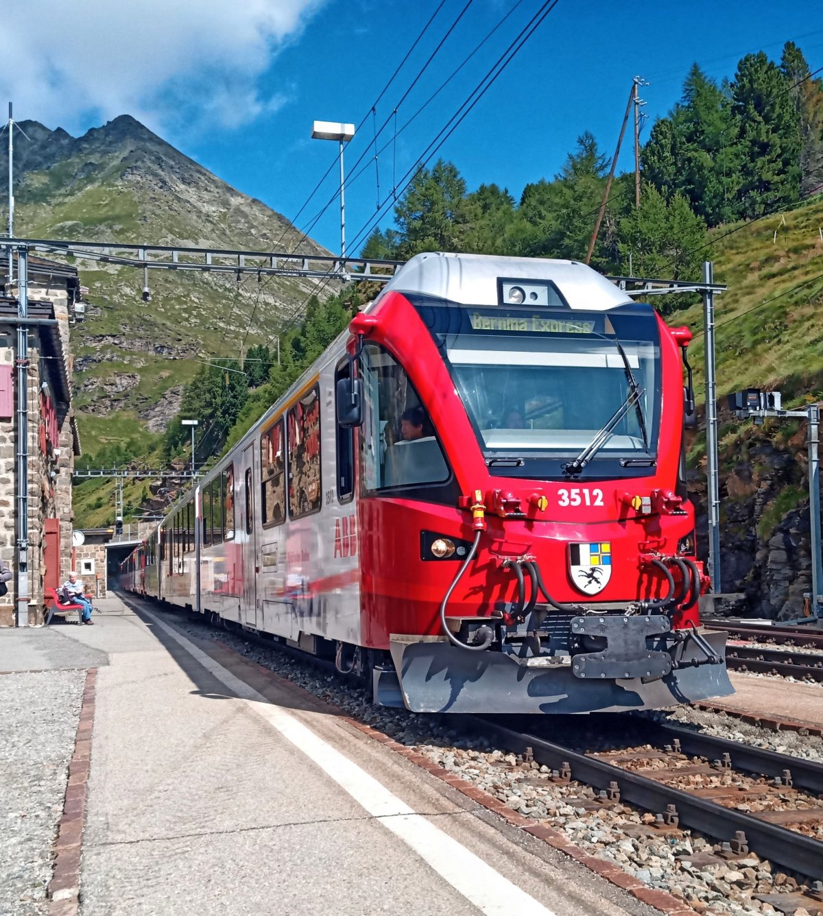 Dále vlak stoupá podél říčky Poschiavino. Přes stejnojmenné město. Strmě nahoru až ke Třítisícovkám. Do stanice Alp Grüm. Zde ve stanici po výstupu z vlaku potkávám známý vlak Bernina Express a dělám pár fotek.