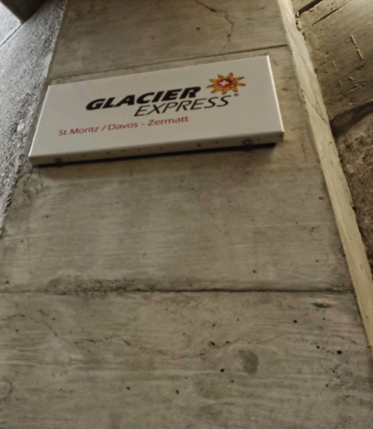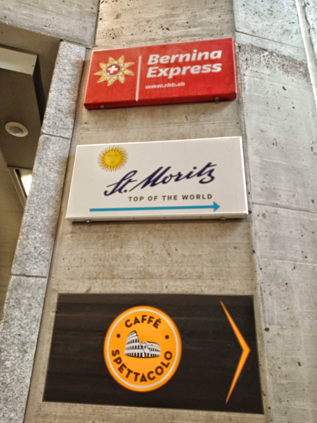 Na nádraží po příjezdu mého vlaku odjíždí ještě souprava dalšího slavného Švýcarského vlaku GlacierExpressu. Stíhám jen rychlou mobilní fotku. A omrknout reklamní tabule při nádraží ve svatém Mořici. Kde jsou mimo jiné loga Bernina Expressu a Glacier Expressu.
