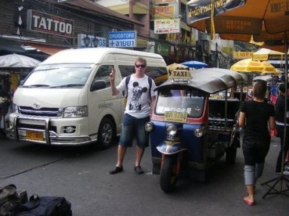 Po ranním probuzení jsem já jako jediný měl ještě pár povinností. Hlavně tedy předat obchod kolegovi. Kluci už měli volno a čekali na mě na baráku. Po obědě, někdy po 13:00 nás Jakubovo bývalá přítelkyně odvezla na letiště. Kačko, dík. Po odbavení jsme usedli do letadla a plně si užívali servisu Emirates. 6 hodin letu plné jídla a skotské s kolou (myslím, že i dnes si stevardky naší trojsedačku dost dobře pamatují a ještě dnes by nám přinesli plechovku a malou lahvičku s whiskou, kdyby nás jen na ulici potkali :D). Rozjařeni jsme kolem půlnoci tamního času vystoupili z letadla v Dubaji. Po dvouhodinovém procesu jsme se dostali před letištní terminál a se zjištěním, že máme asi už jen 5 hodin do dalšího letu, jsme čapli prvního taxíkáře, který se za 100usd o nás staral celou tu dobu. Zastávka u "plachetnice" Burdž-al-Arab, u mrakodrapu Burdž Chalífa, projížďka centrem, hodinová procházka po promenádě, kdy jsme stihli pofelit s bandou místňáků v našem věku i sednout na kafe vedle přátelských šejků. Bylo to fajn. V 7, už za plného světla, jsme se vrátili na letiště a ve stejném duchu absolvovali víceméně stejně dlouhý let až do Bangkoku. S časovým posunem jsme za tmy vyvrávorali z letadla na Asijské půdě. Tady jsme stopli tuktuk a aniž bychom věděli kam, vydali jsme se touto motorovou tříkolkou vstříc velkoměstu. Šofér nás vyhodil (asi jako všechny, kteří nevědí) v centru u Khaosan Road. Dlouhé ulici plné barů, hotelů a lidí. V noci to bylo pulsující místo neřesti. Chvíli jsme se rozhlíželi a čichali atmosféru, než jsme se odvážili s kuframa cpát se davem a poohlížet se po ubytování. Po pár stech metrech a dvou neúspěšných pokusech o vyhovující nocleh, jsem tu já zažil svůj první šok. Potkal jsem 2 páry známých z Hlohovčic ( ! bydliště mojí babičky,vesnice s pár stovkami obyvatel vzdálená asi 5 km od mého rodného Staňkova ! ). Dodnes jsem z této neuvěřitelné náhody a pravděpodobnosti 1 ku bilionu jaksi perplex. No tenkrát jsem k nim přiběhl a z nadšení, že jedny z prvních obličejů, které 12000km od domova potkám, patří právě jim, o pár let starším vlakovým spolucestujícím z dob mého plzeňského studia, na ně hulákal a zdravil. Prohodili jsme pár vět, zasmáli se tomu a já musel běžet dohonit Kubu s Robinem, kteří před nějakým hotelem vypadali rozhodnuti, že to by mohl být ten správný pro nás. Už nevím jaká tenkrát byla cena za osobu na noc (myslím, že kolem pětistovky v přepočtu na koruny - což tenkrát tam nebylo zrovna z nejlevnějších), ale rozhodnul bazén na střeše. O půlnoci jsme shodili bágly v naší minimístnůstce s jedním (!) letištěm, TV a větrákem a šli do baru na pár drinků. Po pár hodinách jsme pravděpodobně šli spát.