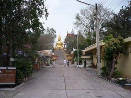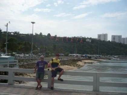 Ráno, za čerstva, jsme si asi díky mapě z recepce vybrali místo kam pojedeme na krátký výlet. Na hlavní silnici podél pláže jsme odchytili jeden z mnoha tuktuků. Tady byl oproti Bangkoku alespoň čtyřkolový. Ale pick up bez střechy, kde jsme si taky mohli plně užívat bláznivou jízdu s větrem ve vlasech. Lidi cestou naskakujou a vyskakujou, jak se jim zlíbí. My pokynuli, vystoupili a zaplatili pár drobných na místě poblíž našeho cíle. Pár desítek metrů od silnice, po prašné cestě jsme došli až k areálu s klášterem. Dole pod dlouhými schody s ozdobným zábradlím jsme si hráli s budhistickými zvony. Já zaplatil kilo za vypuštění ptáčka z klece a vyslovení přání, které ten ptáček na tuty následně splní ("fakt myslíš že to splní??"-"no určitě jinak by za to lidi neplatili"). Pak už jsme vylezli ty dlouhé schody a stáli uprostřed nádvoří s menšími sochami, kterým vévodil obrovský pozlacený Buddha. Hodinku jsme tak přebíhali a fotili tuto pro nás "velkou zvláštnost". Když jsme opět schody sešli, u prašné cesty už nikdo z turistů, co vystoupili s námi, nebyl. Nic moc ani nejezdilo. Řekli jsme tedy místním klukům, co seděli na vybudované dřevěné terase na stromě, jestli by nás nehodili zpět do města. Domluvili jsme se, byli v pohodě. Vysadili nás u ulice Walking Street, že tady se máme určitě porozhlédnout. Dlouhá ulice byla podobná Khaosan. I vzhledem i pověstí. Během zapadajícího slunce jsme si ji prošli celou až k molu. Zpět už v pološeru jsme začali chápat, proč ulice "hříšná". Bary ožily, neony ozařovaly veřejné domy, turisti se valili dosti veselí sem a tam. Začali nás oslovovat holky s nabídkama, bordel mámy s pozvánkama do klubu, krejčí, jež ti ušije oblek na míru, týpek, co ti dá podržet opičku atd. atd. No moc jsme na to zatím připravení nebyli, zapluli jsme až do poslední hospody na začátku ulice. Uprostřed byl velký ring a zrovna exhibiční zápas v thaiboxu (prezentovaný jako zcela vážný - kdo se v tom nepohybuje, lehce uvěří, že si fakt nakládají naplno). Tak jsme dali Changa nebo Singhu, mrkli na zápas a pak se dopravili na hotel.