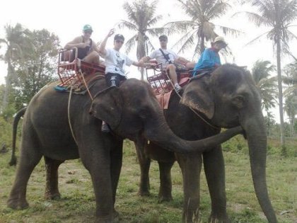 Tím, že jsme se večer nesundali, vstali jsme za rozbřesku. Z letáku na recepci jsme si vybrali celodenní výlet na sloní farmu. Juchů, pro mě bylo setkání se slony v přírodě snem a tak trochu cíl tohoto thajského dobrodružství. Tak jsem rád, že kluci souhlasili a dali přednost tomuhle namísto pláže nebo kalby. Celý den s dopravou nás stál asi tisícovku. No na to, co jsme zažili, krásná cena. Napřed jsme na farmě slony krmili banánama. Pak jsme si je mohli osedlat! Kluci šli na jednoho spolu, já měl jednoho jen pro sebe. Průvodce nás hodinu vedl v zástupu džunglí. Obrovský slon s námi na hřbetě se pohupoval, okusoval stromy a evidentně byl na procházce celkem rád. Slonovod uprostřed džungle na travnatém plácku ze slona slezl, vyžádal si naše foťáky a kamery a se svým "van handrt ,tu handrt" a tak dál nás fotil, točil a nechal nás dělat, co chceme. Řídili jsme slona, hladili mu chobot a jinak jsme si to užívali. Pak opět naskočil a v mírném klusu jsme dohnali stádo, se kterým jsme kolem krokodýlí farmy došli zpět na farmu sloní. Paráda. Van handrt,tu handrt nebo kam až se to dopočítal, jsme mu samozřejmě nedali. Ale dyško dostal a vypadal spokojeně. Sundal nás ze slonů a my šli do dřevěného altánu na začátku farmy. Dostali jsme ananas a měli cca hodinu na to, než se udělají fotky. Takže jsme šli ještě za opičkama, které na farmě také byli. Ani jsme k nim nedošli, když jsme se úplně lekli tygra, který ležel ve stínu u altánku. Prej si ho můžeme pohladit, nakrmit ho z flašky mlékem i se s ním (za poplatek -to dá rozum - vyfotit). Využíváme všeho. I přes počáteční strach si to hodně užíváme. Tygr byl mazel a řekl bych, že ještě puberťák.Tak s rancem fotek v podvečer farmu opouštíme. Pláž, Hong Tong, párek a spánek. Dobrej den.