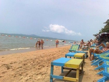 Ráno 23. jsme vstali brzo, stihli jsme poslední bazén s výhledem na město, napsat zprávy domů, zaplatit hotel s omluvou za různé prohřešky a s kuframa jsme kolem poledne hledali po různých improvizovaných cestovkách kam a jak se vydáme dál. Zlákala nás Pattaya - pobřežní hříšné město 200km jižně od Bangkoku. Minibusem cca za 600 bhátů (tedy 400 na naše). Odpoledne už jsme se, opět na slepo, nechali vyhodit u pobřežní promenády jižně od centra města Pattaya. Z nespočetného množství hotelů dělících od pláže jen silnice jsme jeden vybrali a šli diskutovat o ceně. Byl nakonec asi za stejnou cenu jako v Bangkoku, neměl sice bazén, ale každý jsme měli svojí postel, výhled na pláž (a změť kabeláže pouličního osvětlení) a celkem velkou koupelnu. Tak tady bude našeho útočiště s největší pravděpodobností do konce pobytu. Večer jsme zašli na pláž a mrknout po okolí. Po cestě na pokoj jsme ve vedlejší večerce objevili "speciality", které jsme také schválili jako hlavní zdroj energie až do konce pobytu. Hong Tong, místní placatka pálenky, za 80 bhátů a "sám si udělej" párek v rohlíku za 10. No ceny jsou tady pro nás ještě o něco více vtipnější než v hlavním městě.